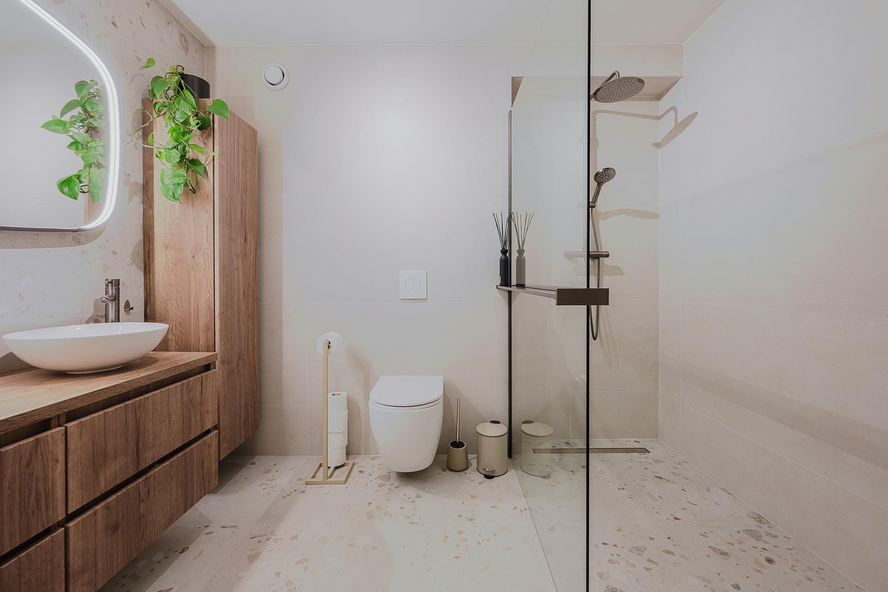 De badkamer is volledig betegeld en is voorzien van een ruime inloopdouche, een hangend toilet, een wastafelmeubel met dubbele waskom, voldoende opbergruimte en een designradiator.