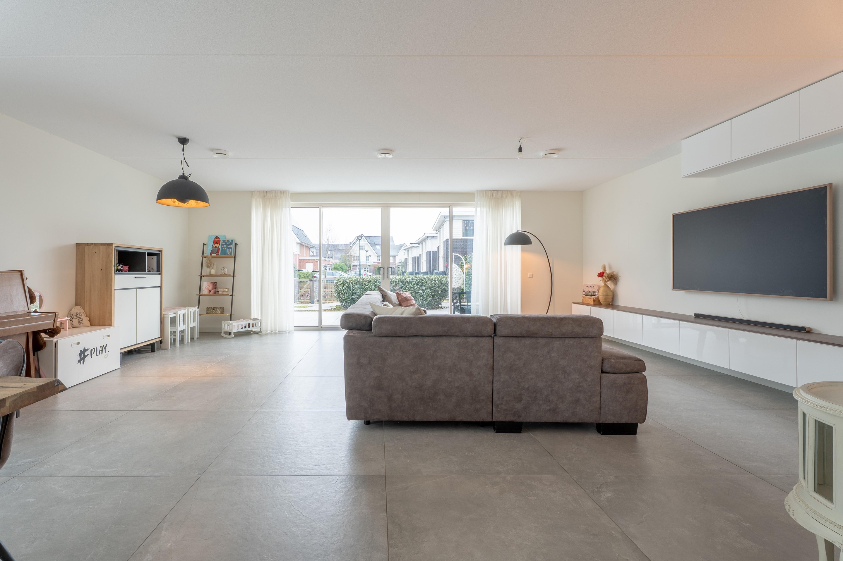 Binnen ervaar je direct de ruimte dankzij de grote uitgebouwde woonkamer.