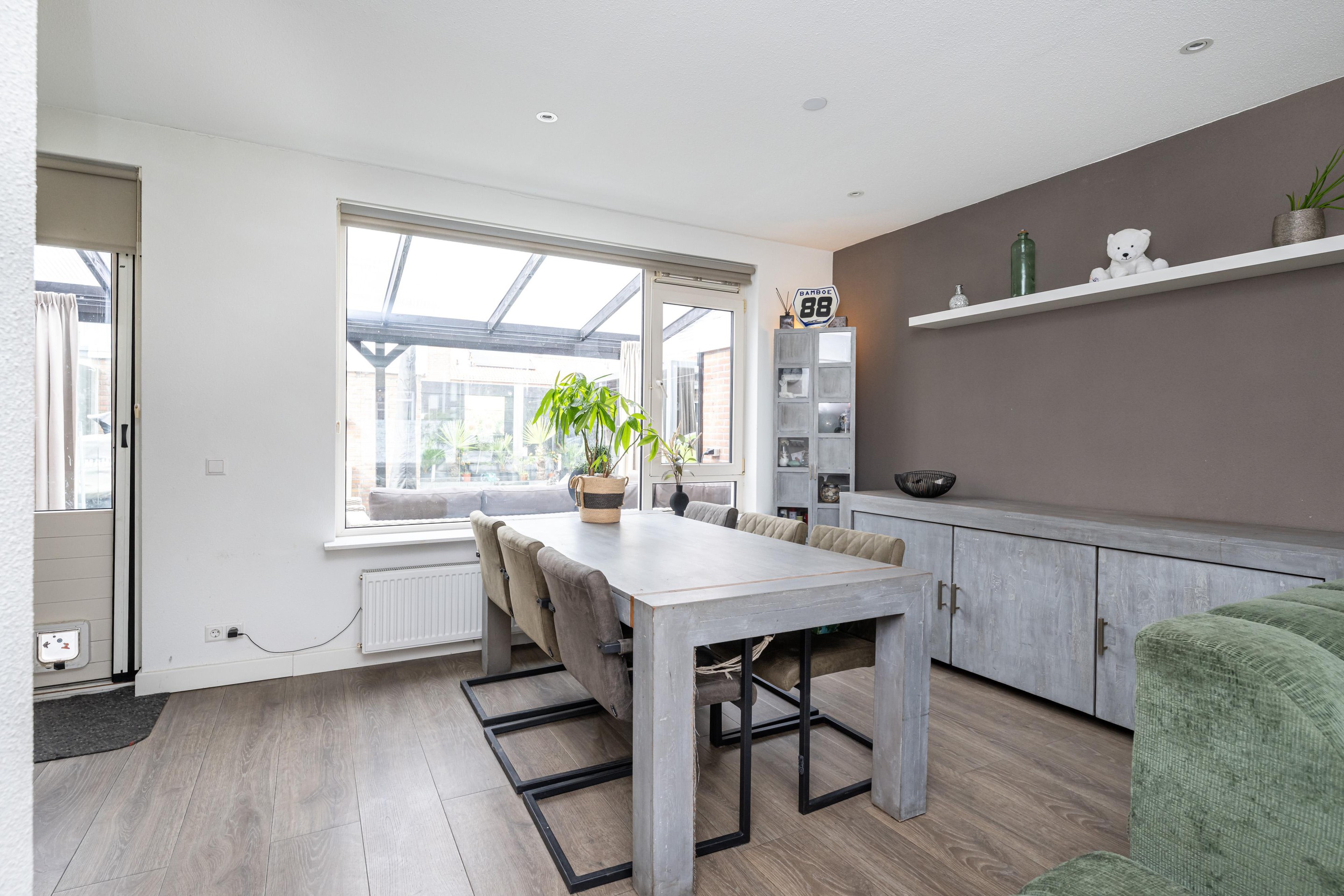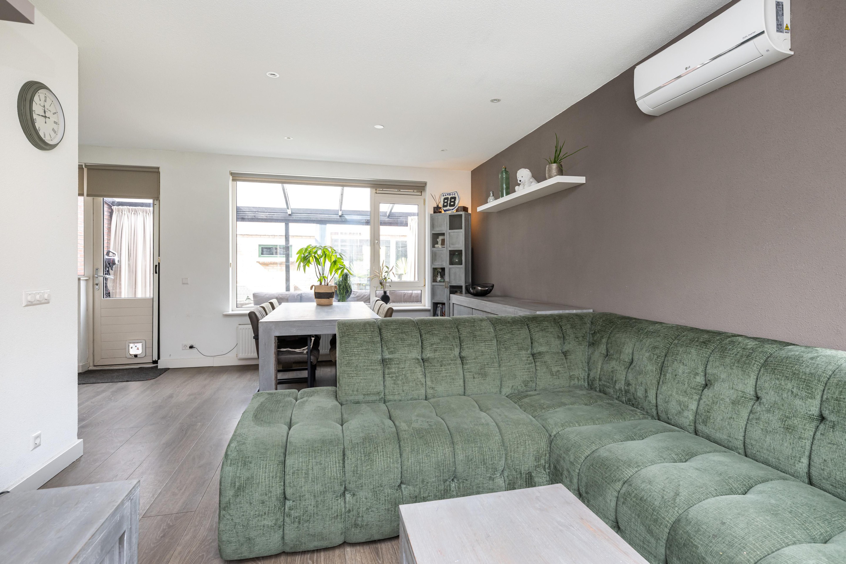 Eenmaal binnen valt de aangename sfeer direct op. De woonkamer is een fijne plek om samen te komen en is bovendien voorzien van airconditioning. Hierdoor geniet u ook tijdens warme zomerdagen van een aangenaam binnenklimaat. De woning is praktisch ingedeeld en biedt een prettige leefomgeving waarin u zich snel thuis zult voelen. Aan de achterzijde van de woning bevindt zich een serre, die een heerlijke aanvulling vormt op de leefruimte. Deze serre zorgt voor veel lichtinval en creëert een mooie overgang tussen binnen en buiten. Of u deze ruimte nu gebruikt als extra zitkamer, eetruimte of plek om te ontspannen met uitzicht op de tuin, het is zonder twijfel een van de sfeervolle onderdelen van de woning.