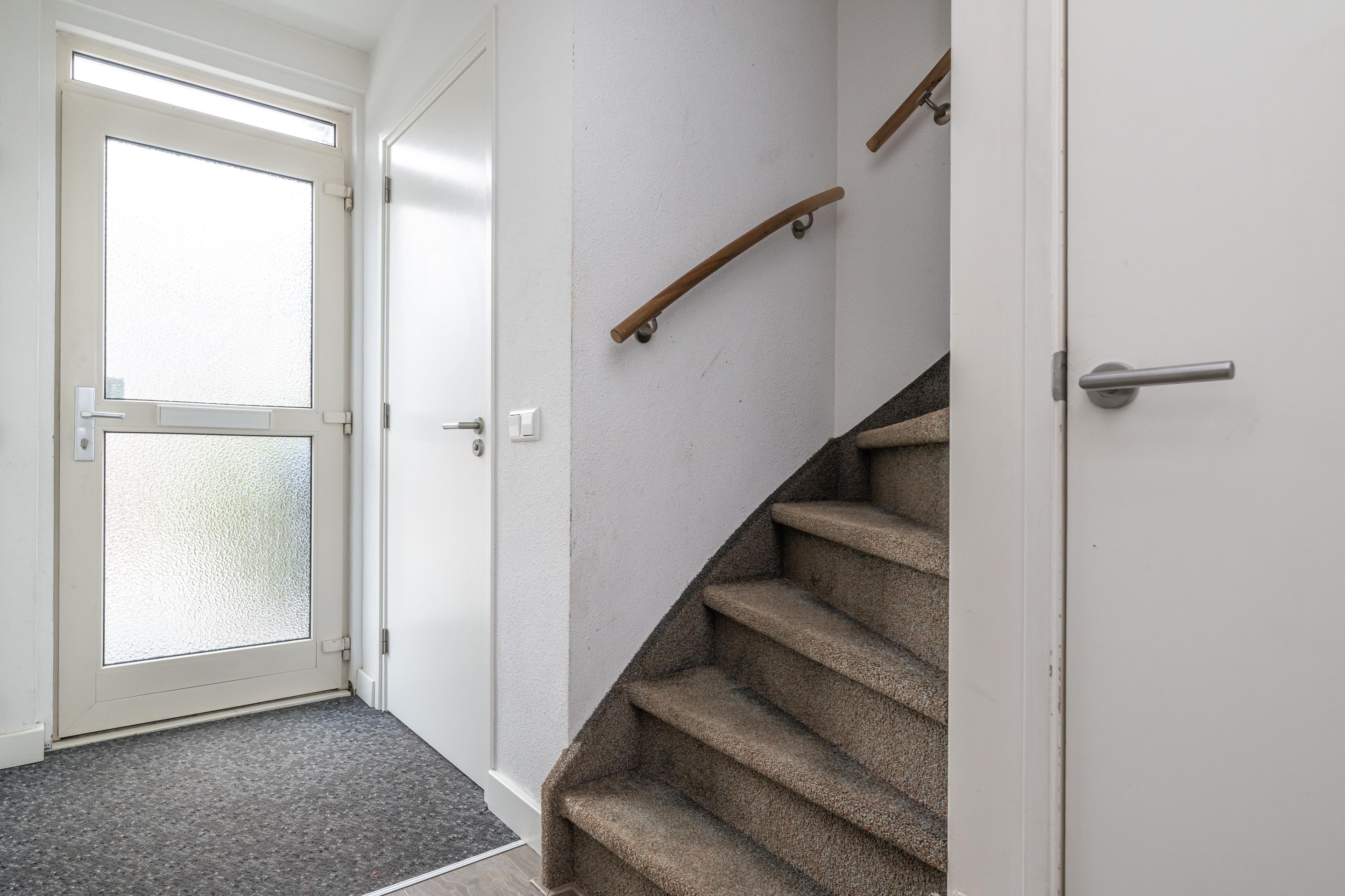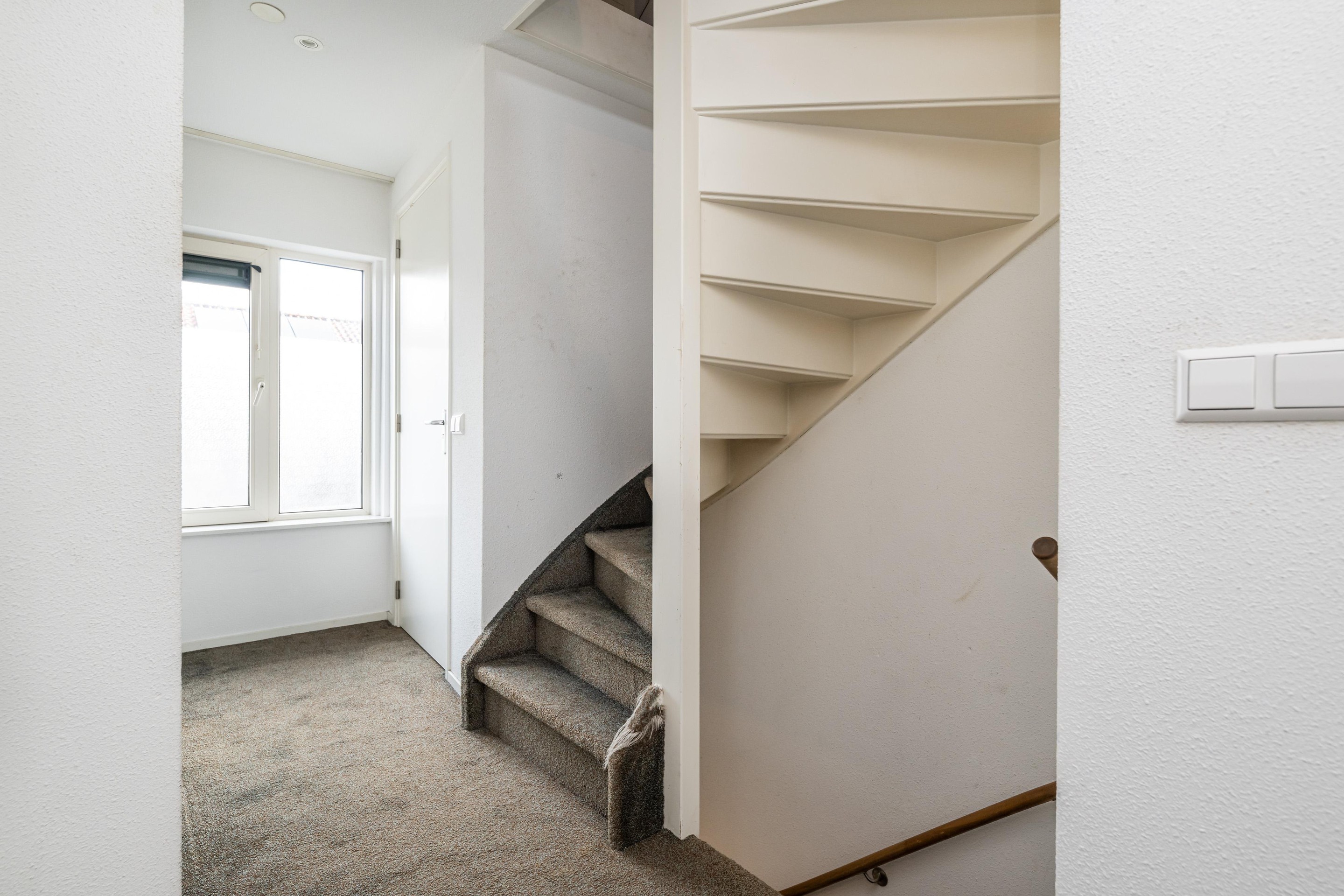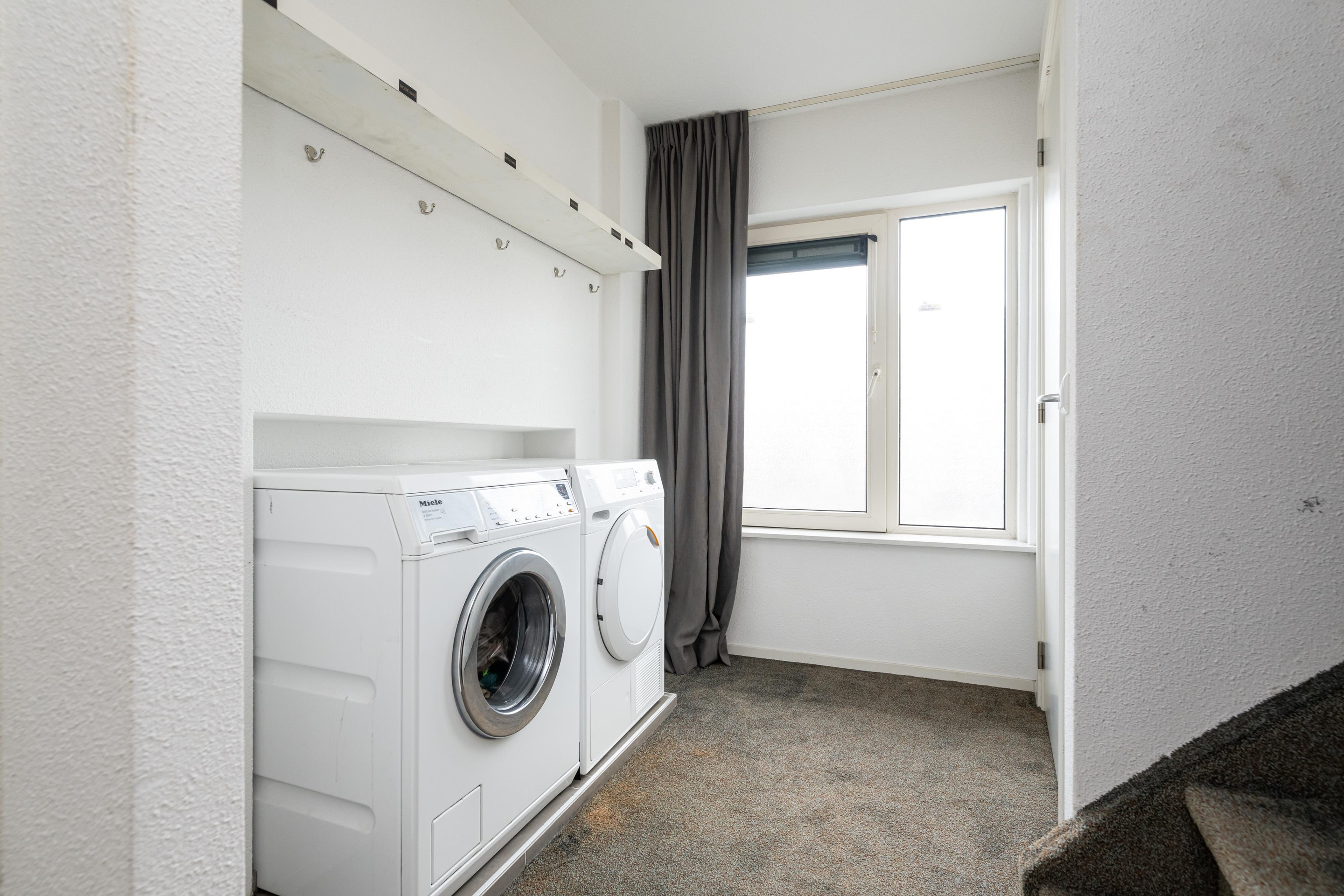 Vloerbedekking, witgoedaansluiting, spots in plafond, kunststof kozijn met draai/kiep raam en trapopgang naar zolder.