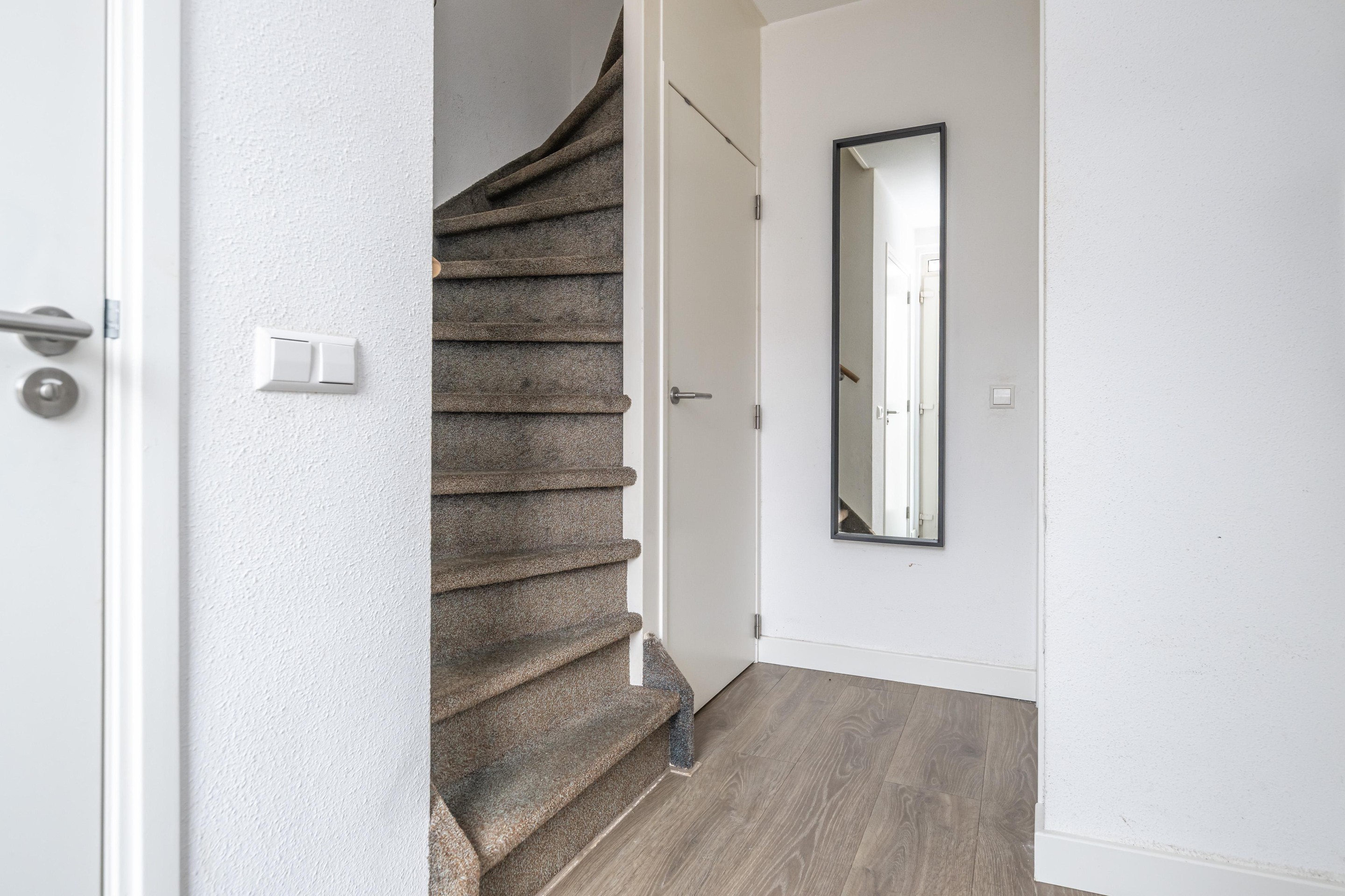 Laminaatvloer, meterkast, trapopgang, trapkast en een radiator.