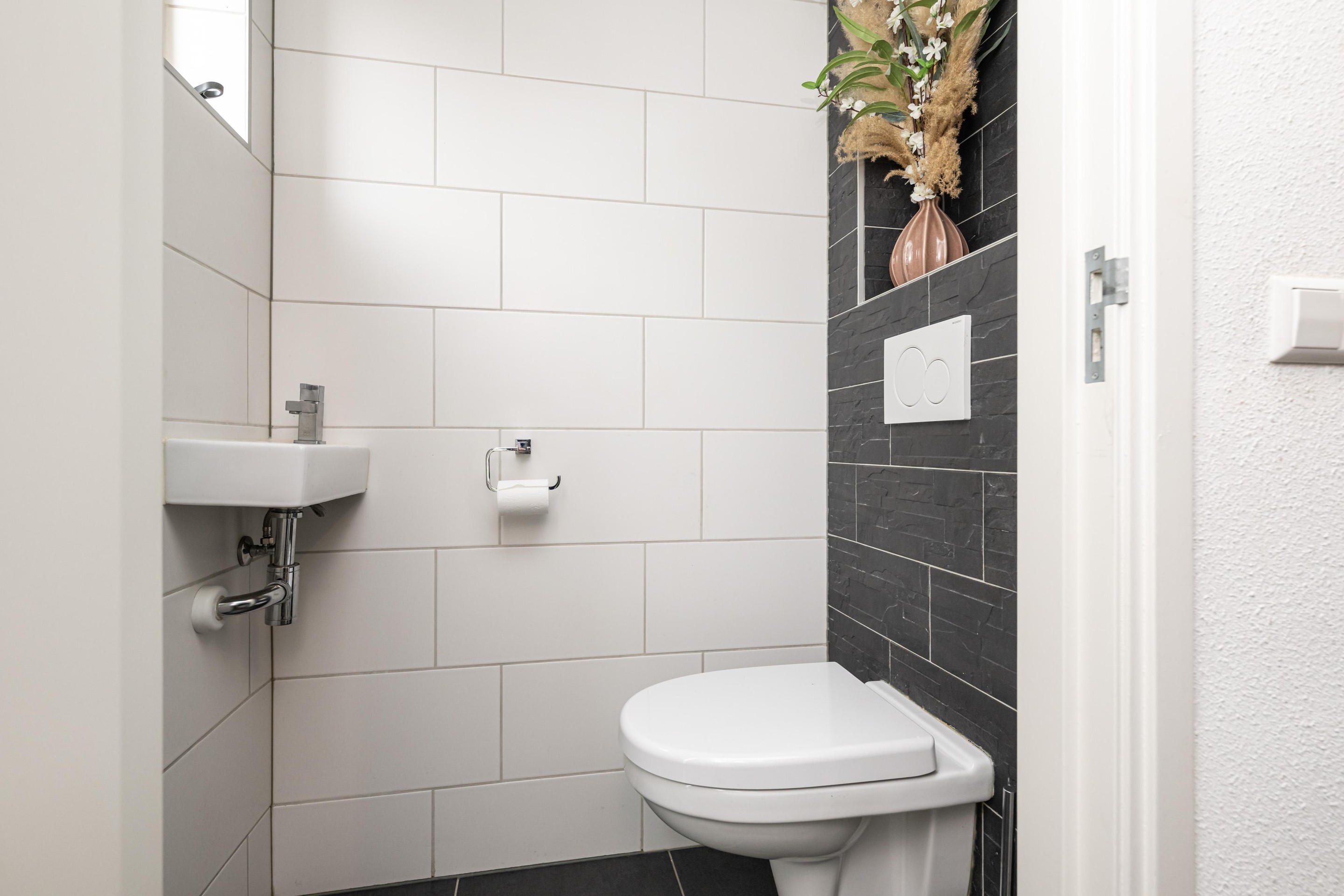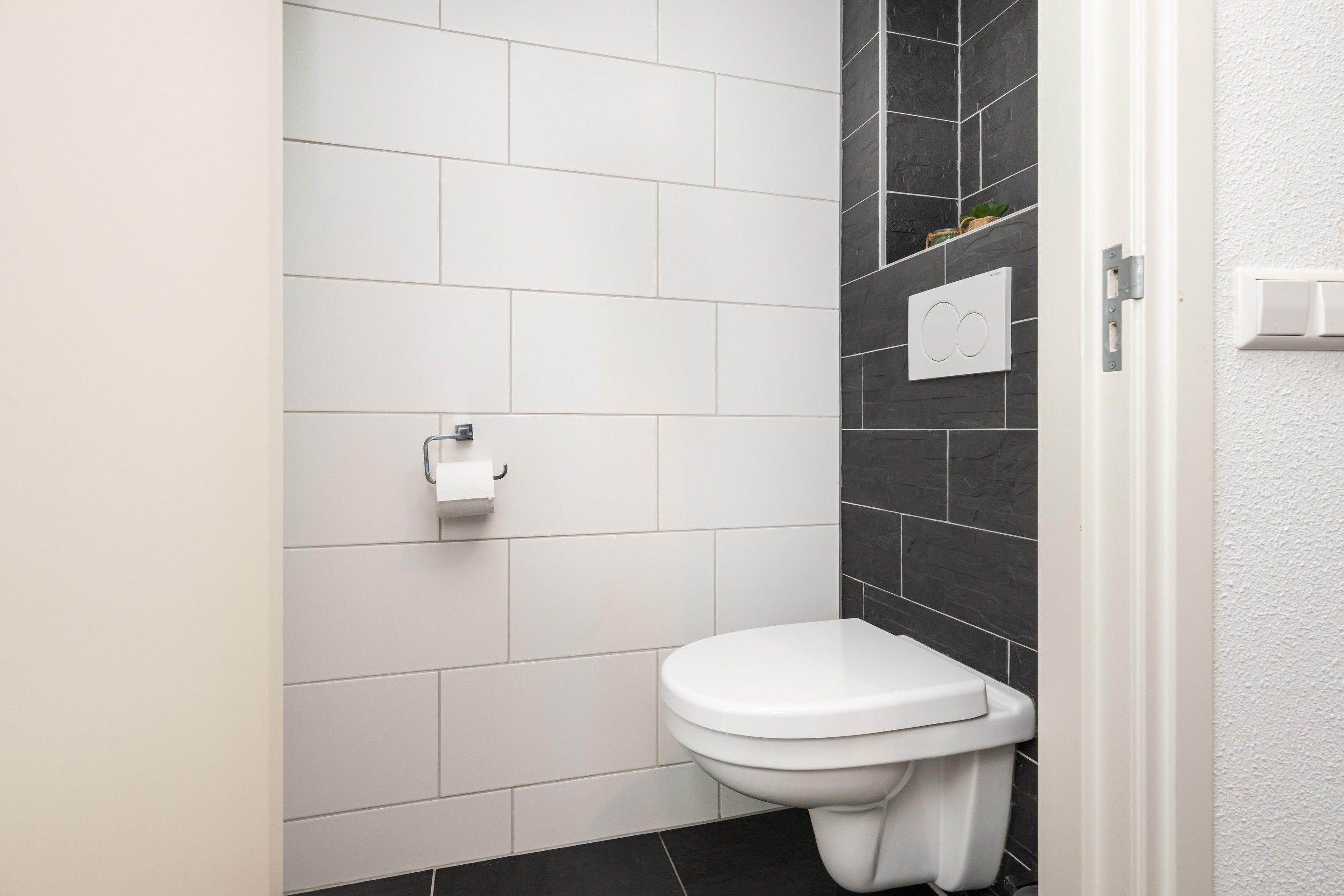 Plavuizenvloer, zwevend toilet en geheel betegeld.