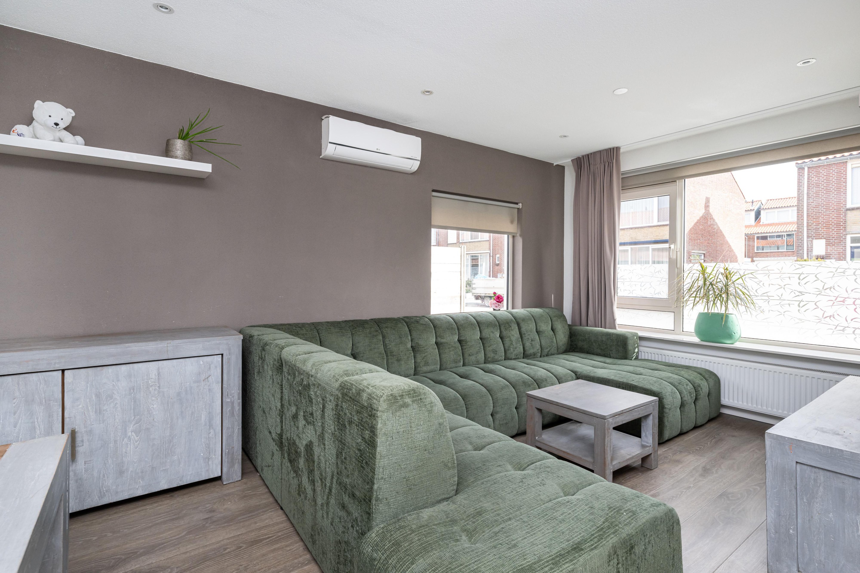 Laminaatvloer, radiatoren, airco en spots in plafond.