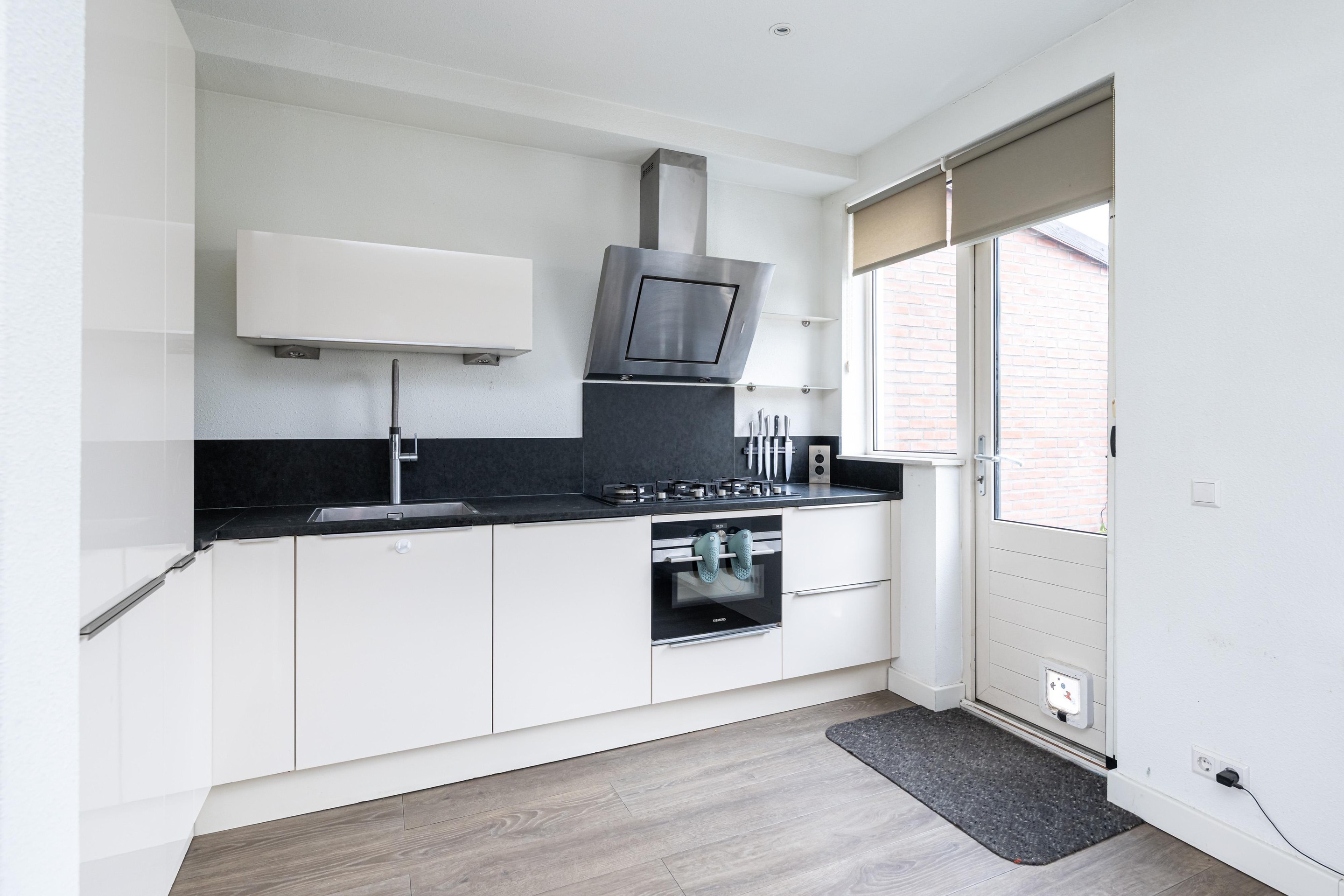 Laminaatvloer, enkele spoelbak, 5 pits gas op glas, afzuigkap, combi-oven, koelkast, vriezer, apothekerskast, vaatwasser en toegangsdeur naar de buitenkamer met glazen schuifwanden.