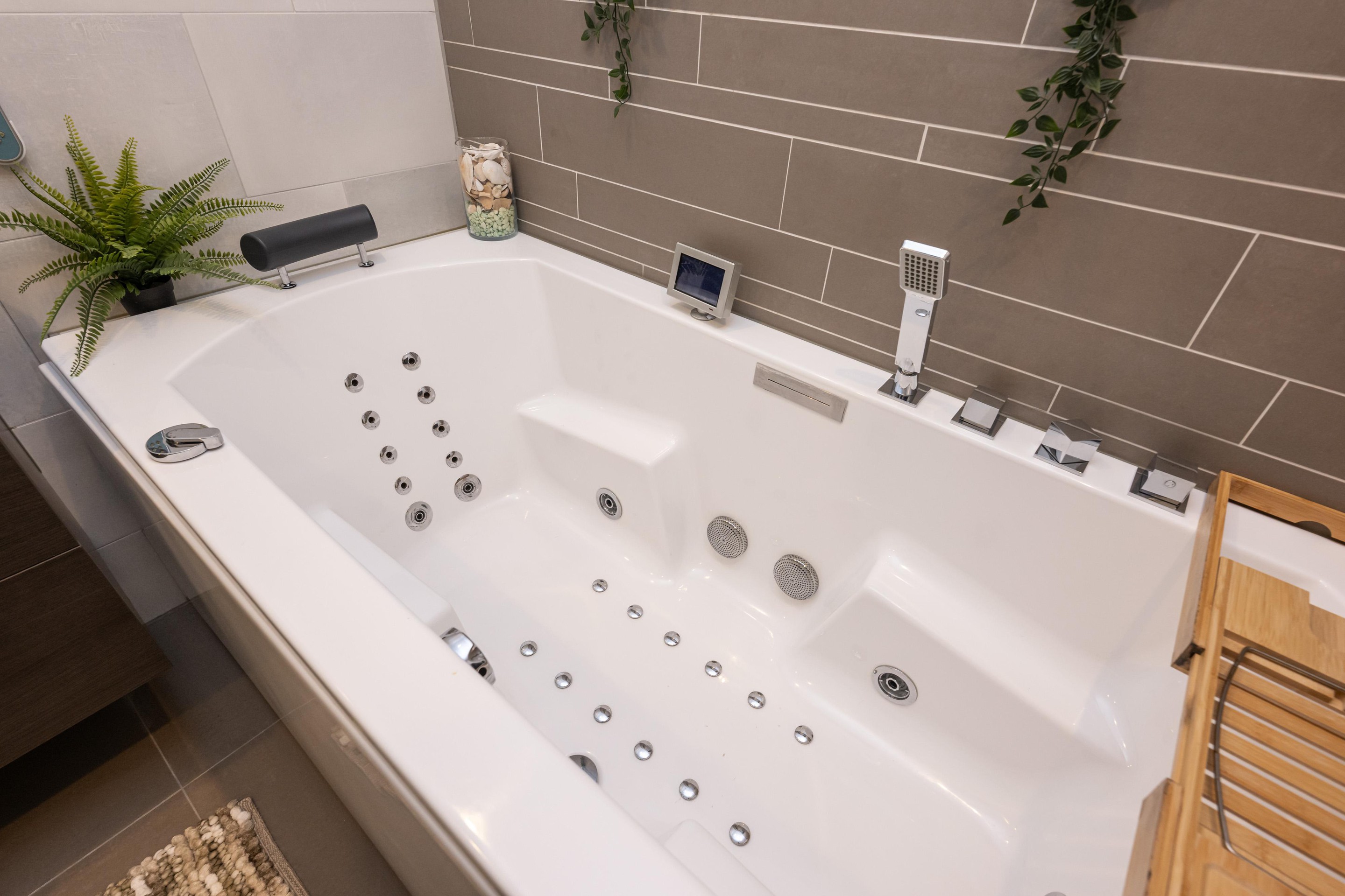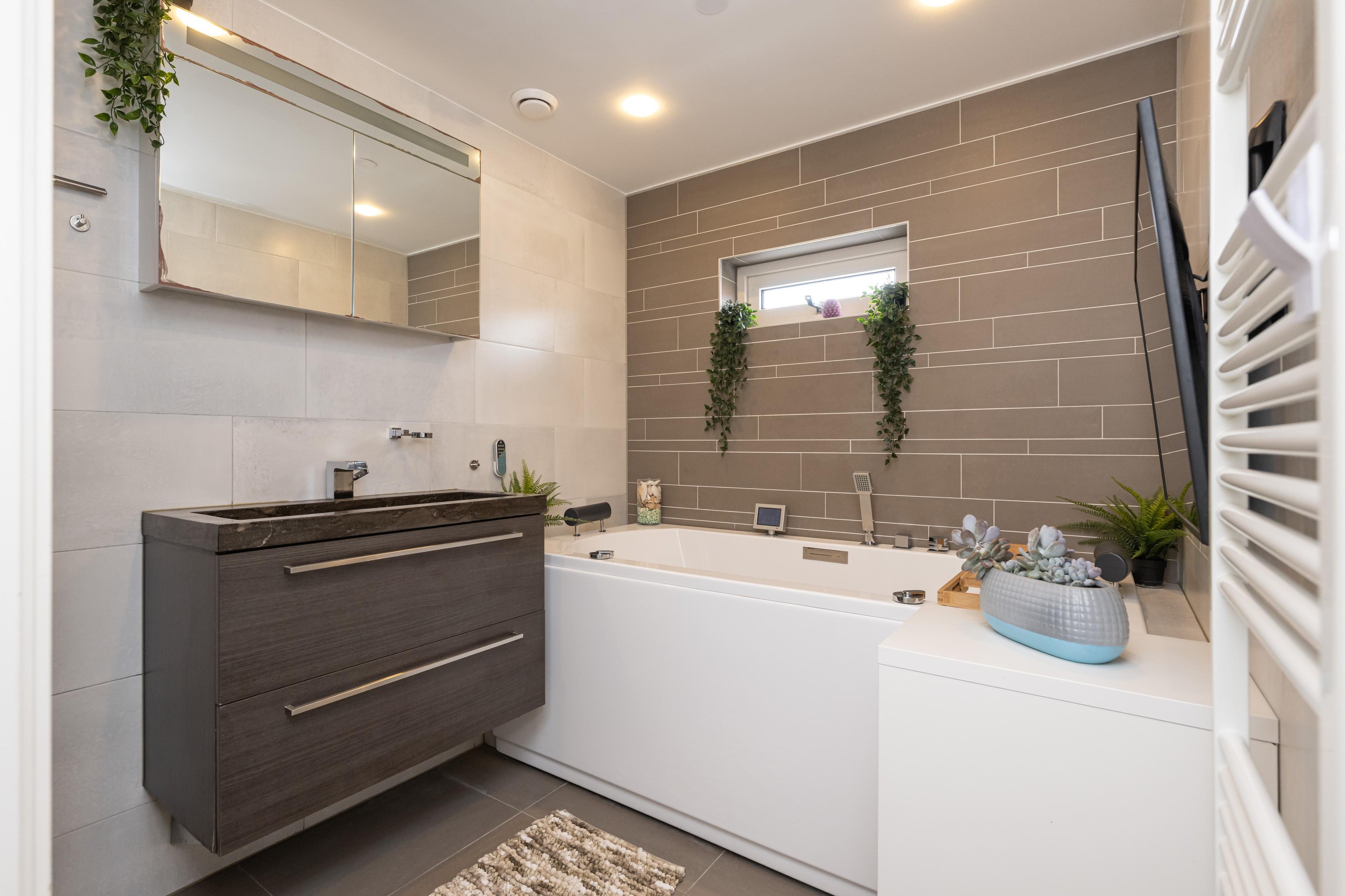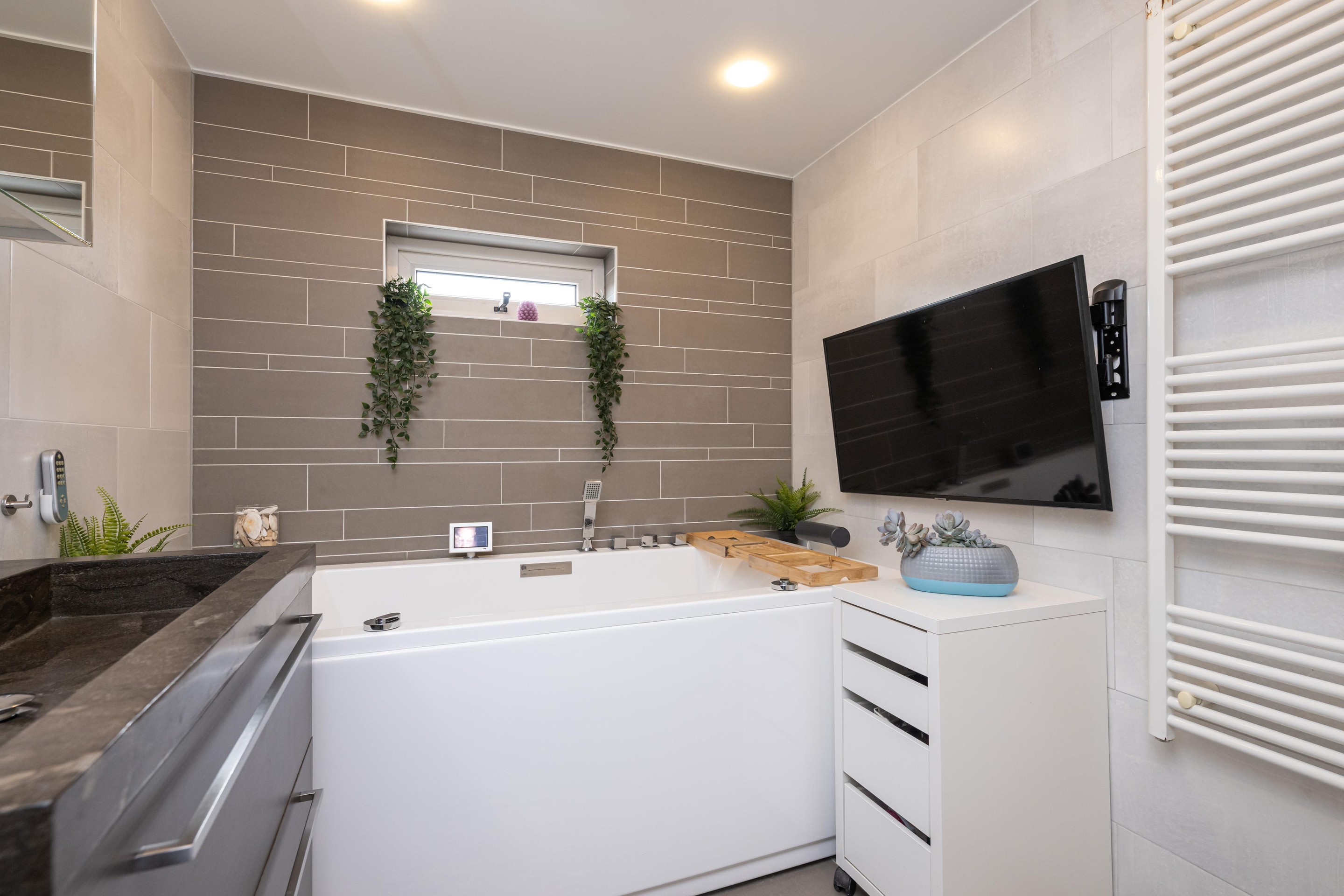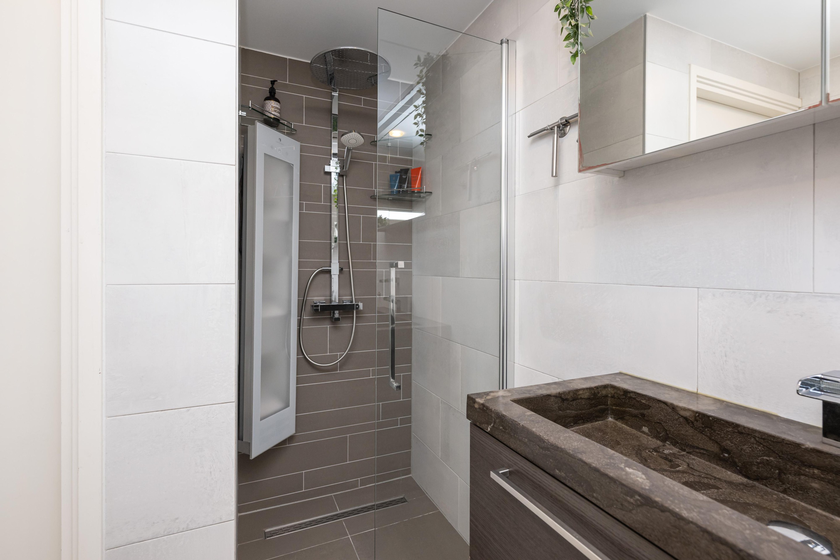 Ook de badkamer verdient zeker speciale aandacht. Deze luxe uitgevoerde ruimte is voorzien van een inloopdouche met regendouche, een ligbad met jets, een wastafel met meubel, een handdoekenradiator, een tv en spots in het plafond. Hier ervaart u dagelijks het gevoel van een eigen wellnessruimte in huis. De badkamer is stijlvol, compleet en ontworpen met oog voor ontspanning en gebruiksgemak.