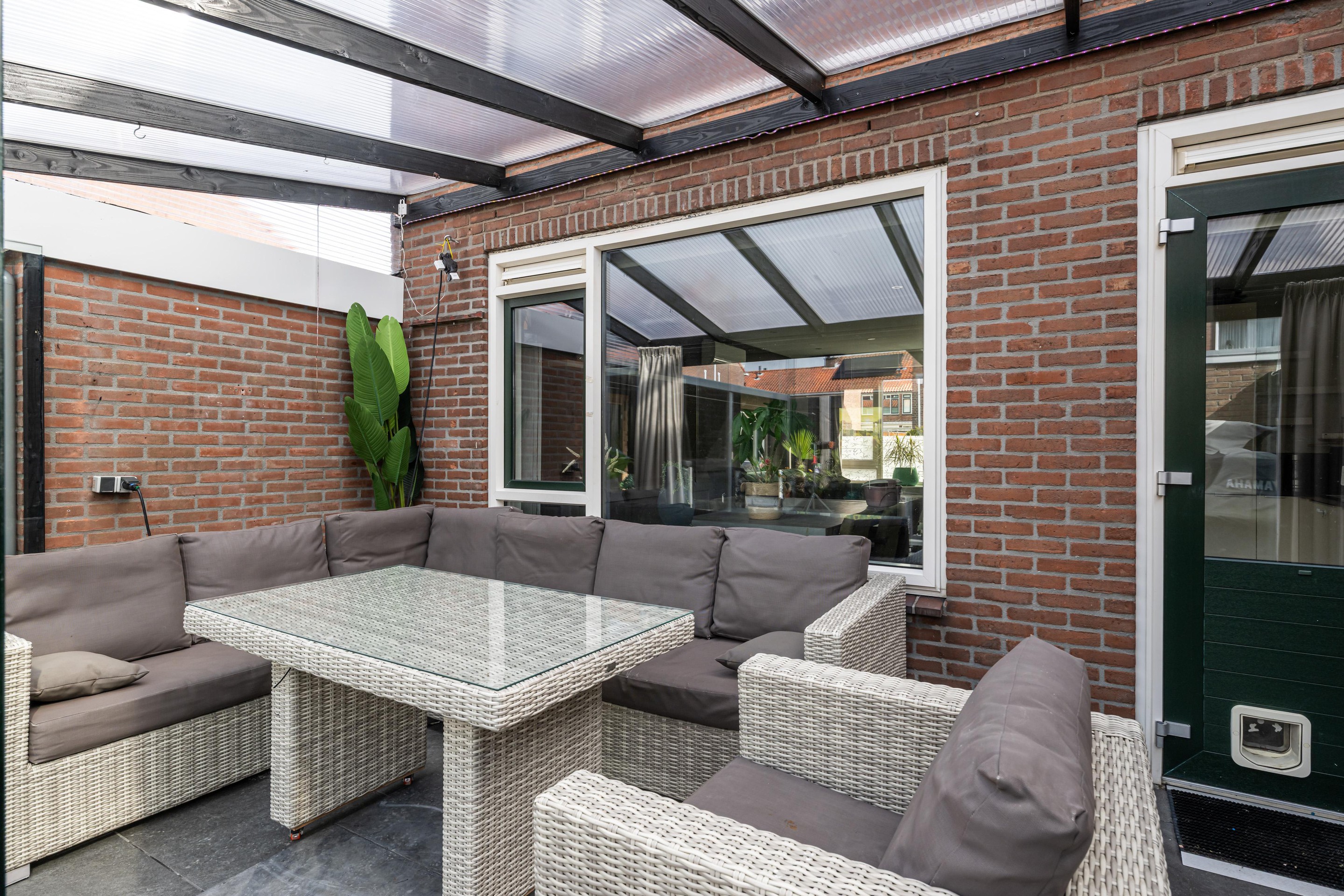 Buitenkamer met glazen schuifwanden, keramische tegelvloer en elektra.