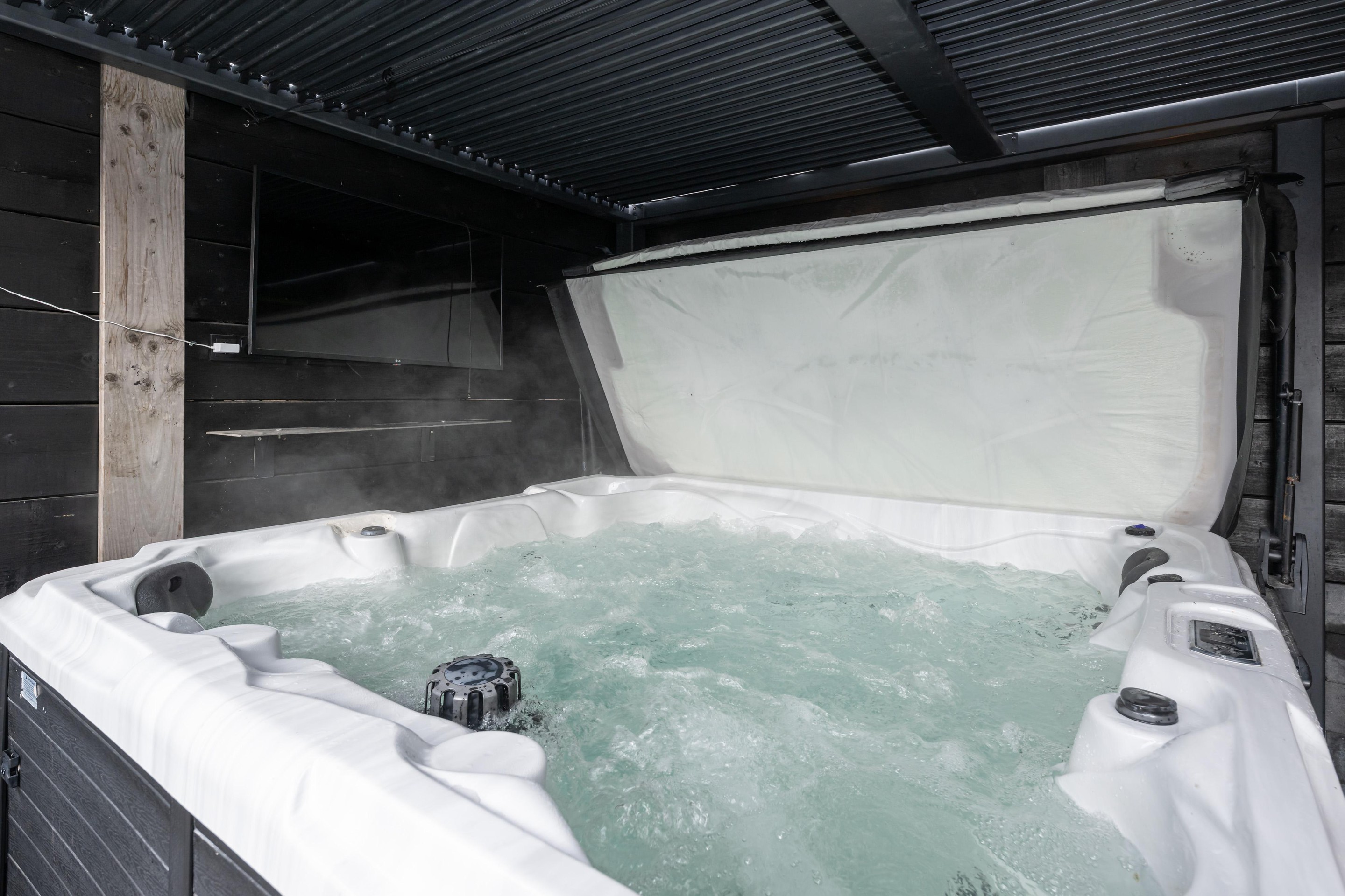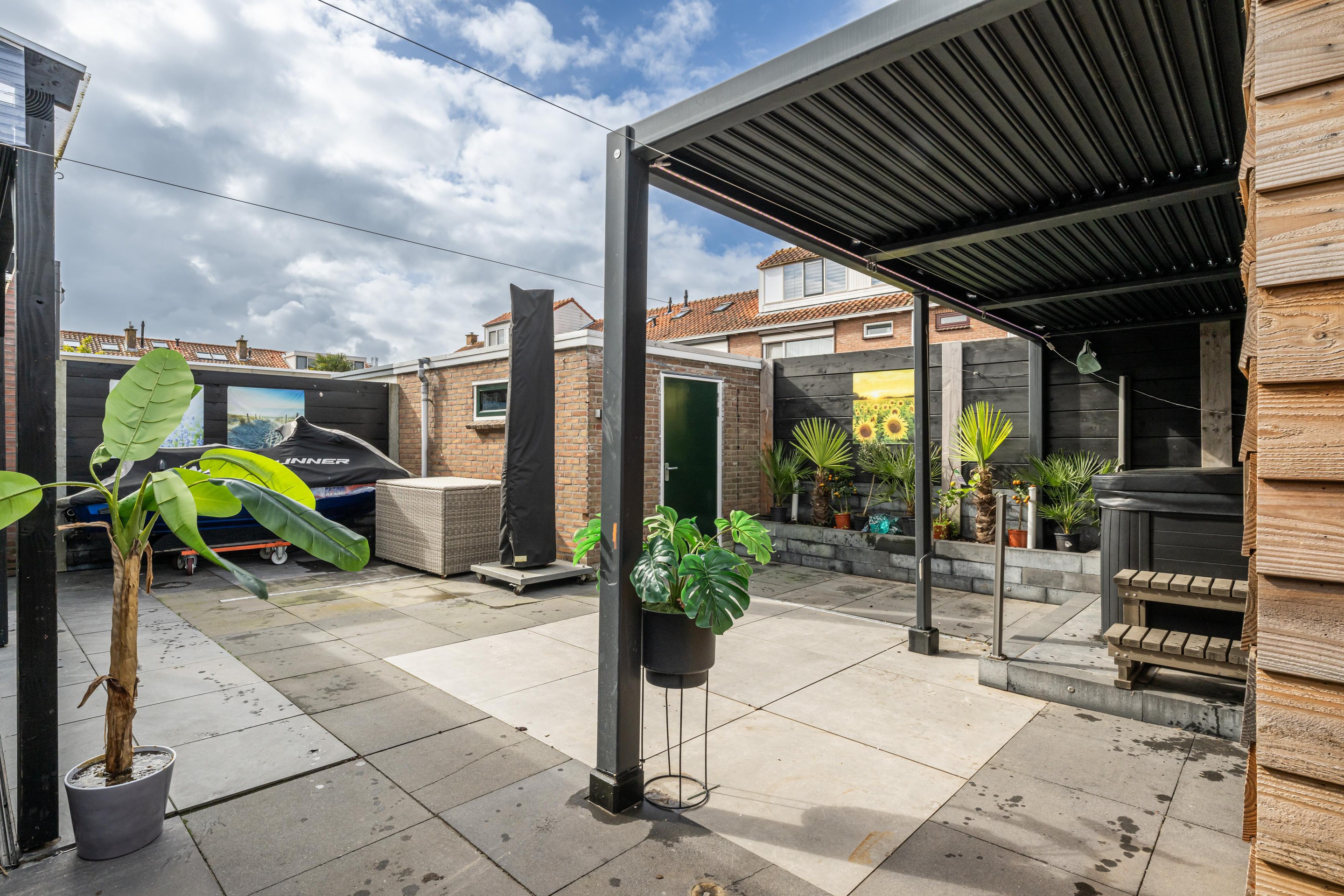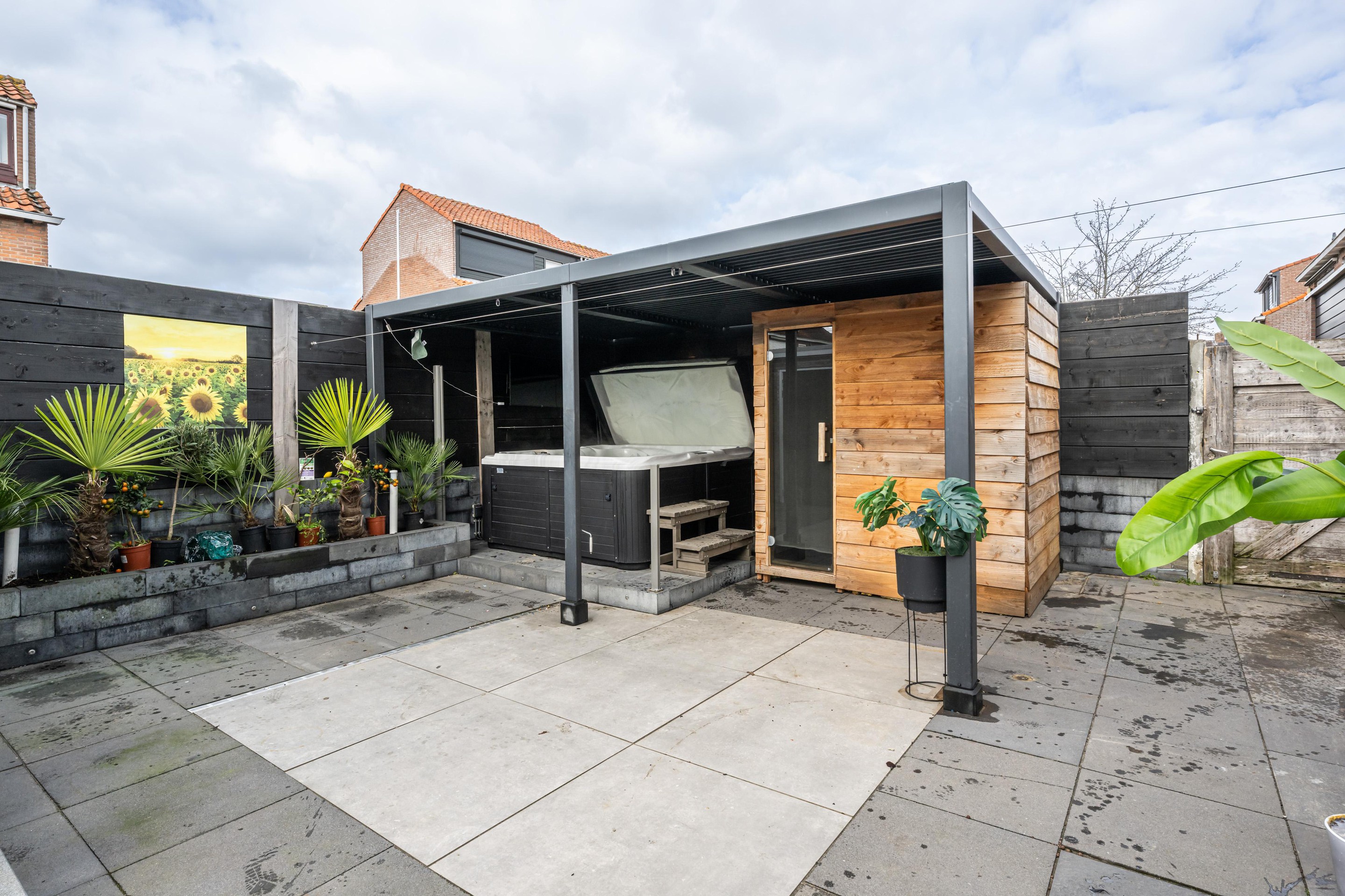 Luxe overkapping met handmatig verstelbare lamellen, sauna en jacuzzi (ter overname), keramische tuintegels, buitenkraan en elektra.