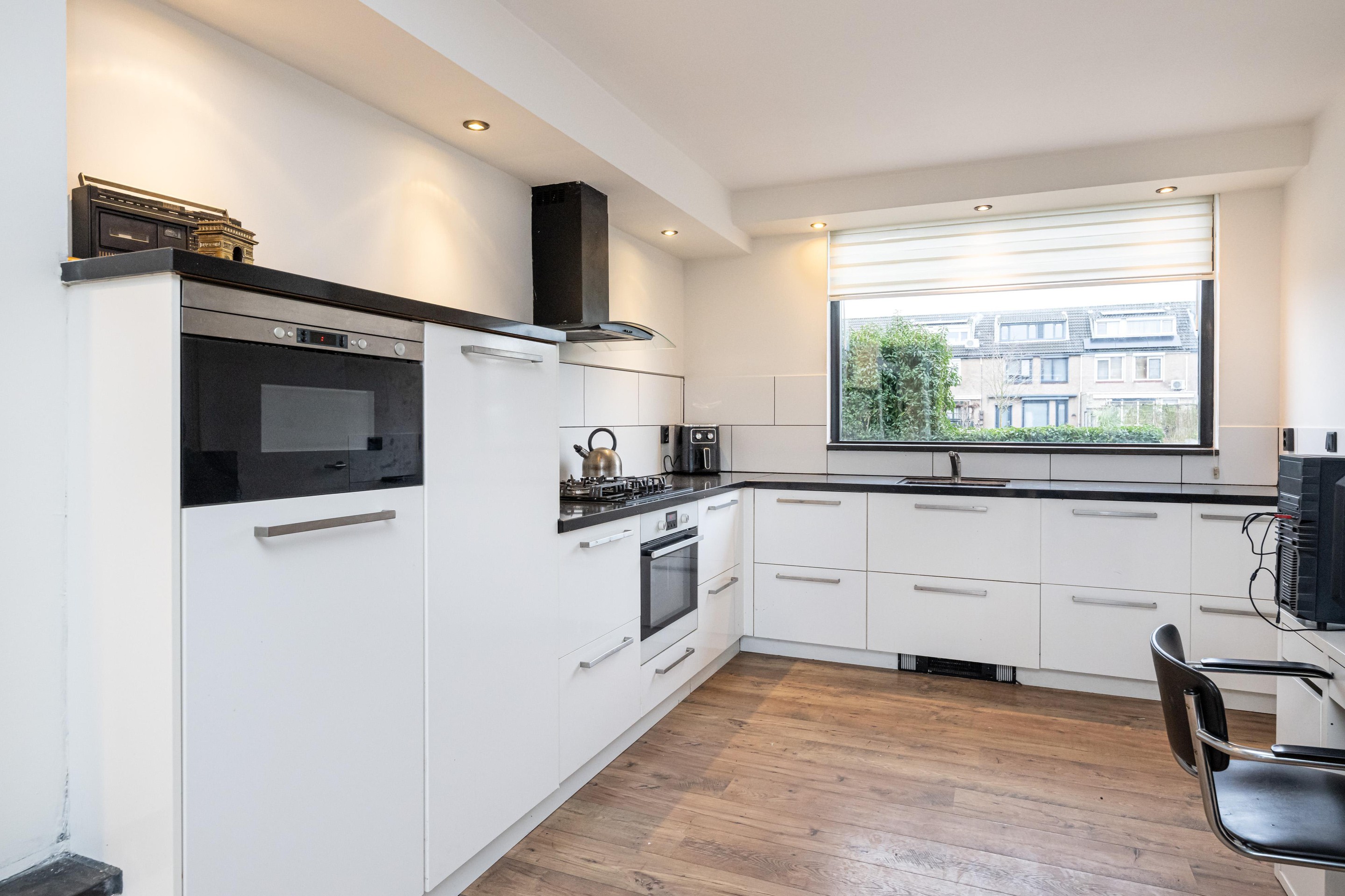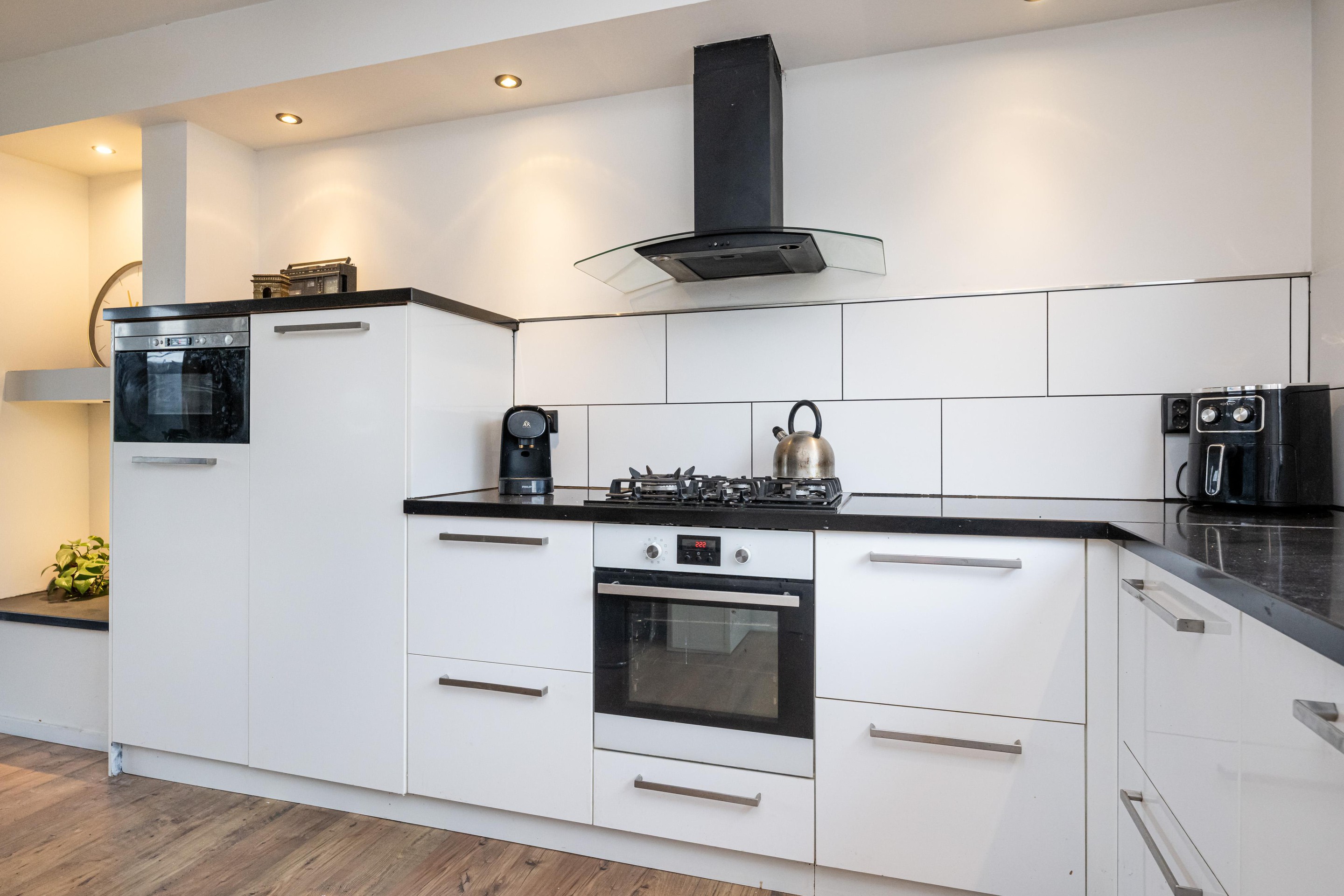 De keuken is compleet uitgevoerd en gemaakt voor dagelijks gemak. U beschikt over een 5-pits gas-op-glas kookplaat, afzuigkap, vaatwasser, close-in boiler, elektrische oven, combi-oven en een koelkast. Of u nu snel een doordeweekse maaltijd op tafel zet of uitgebreid wilt koken in het weekend: u heeft alles binnen handbereik om er iets lekkers van te maken.