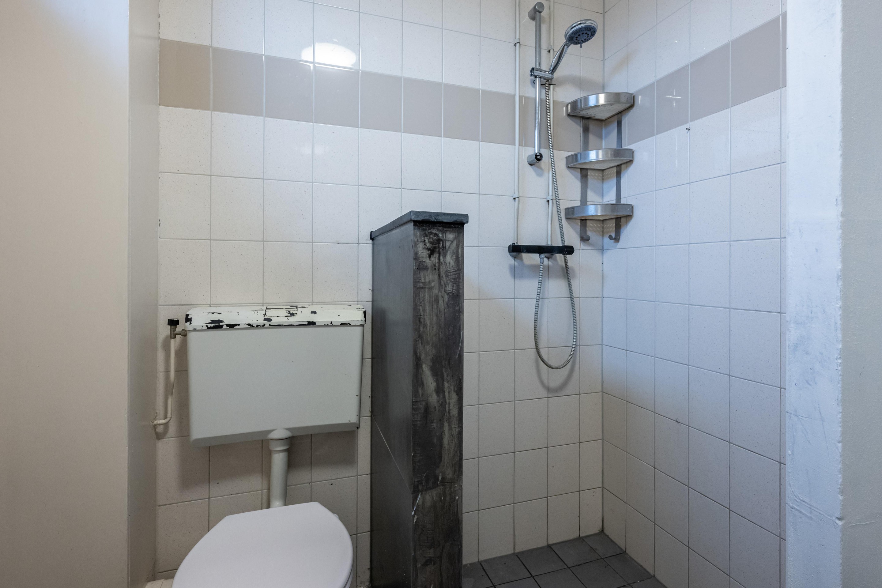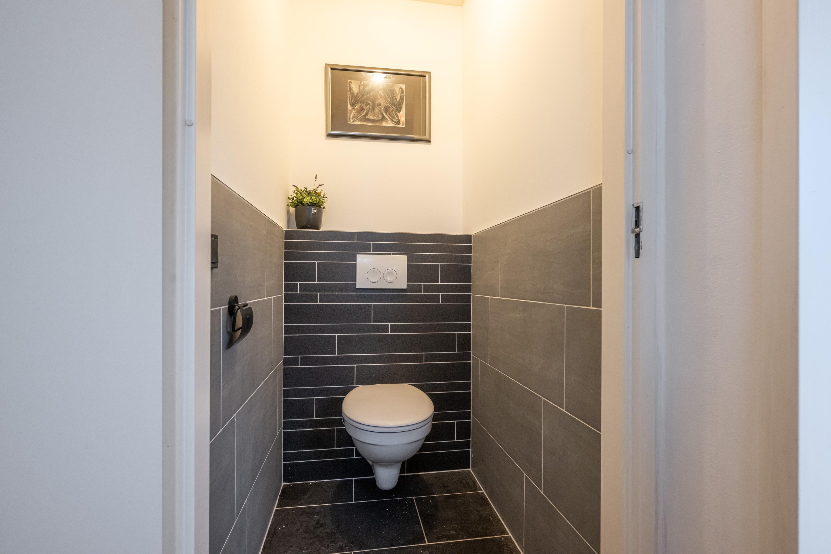 Plavuizenvloer, zwevend toilet en half betegeld.