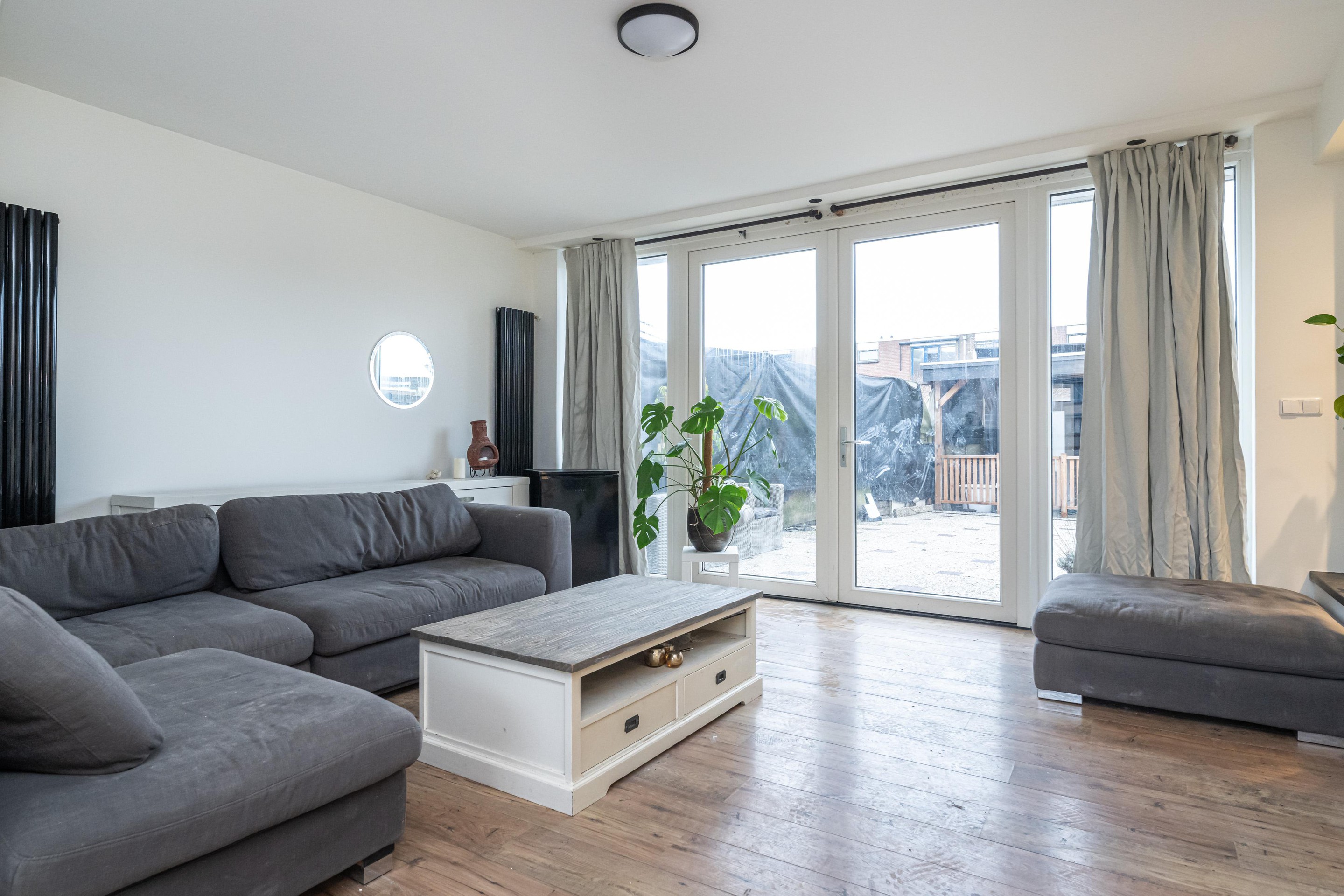 Laminaatvloer, 2 x design radiator, schouw, spots in koof en een kunststof kozijn met openslaande deuren naar tuin.