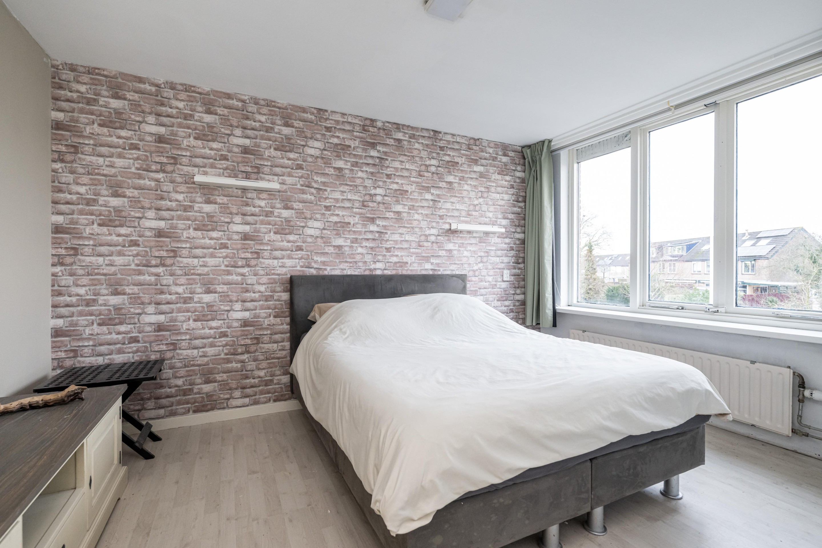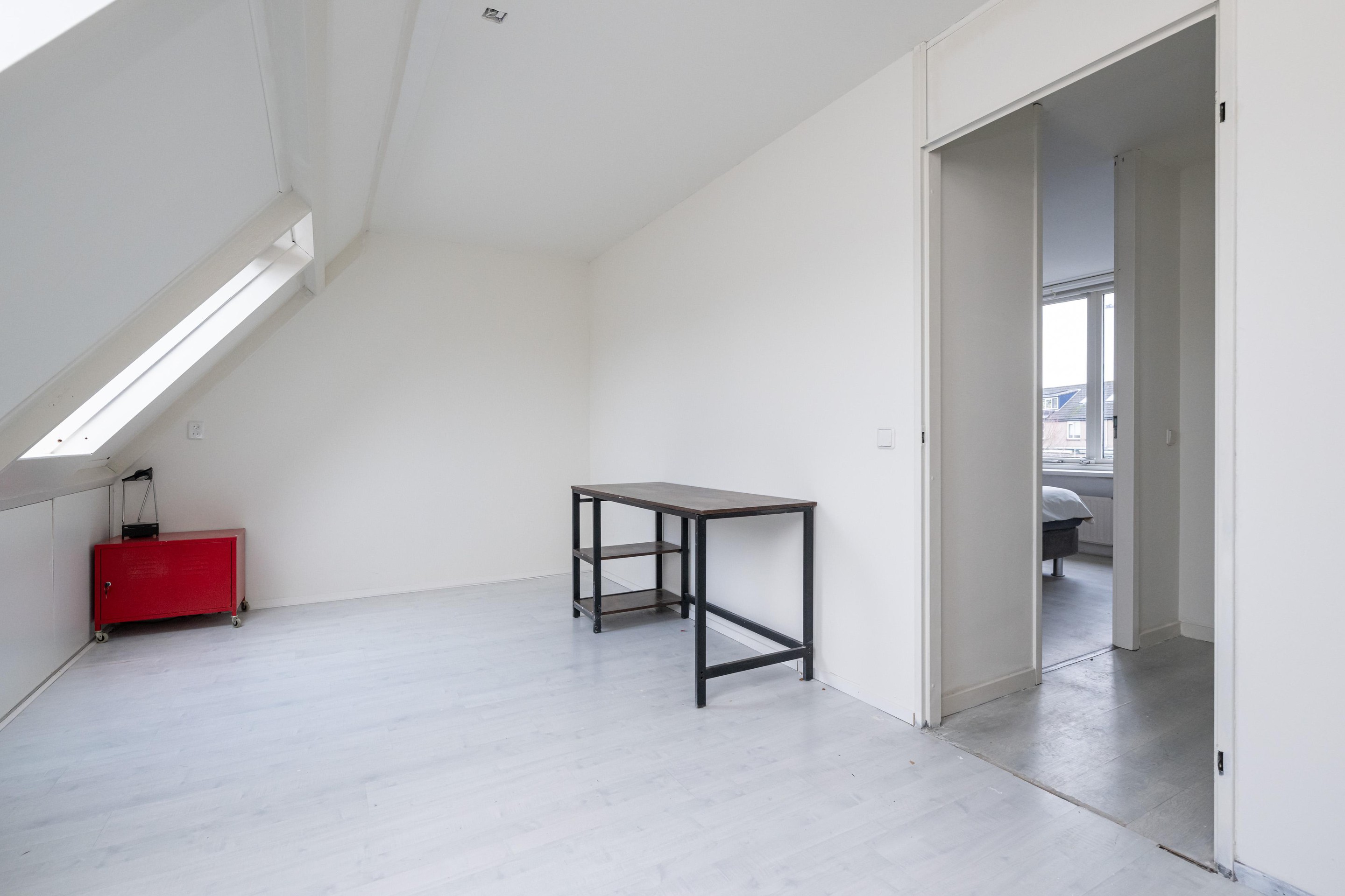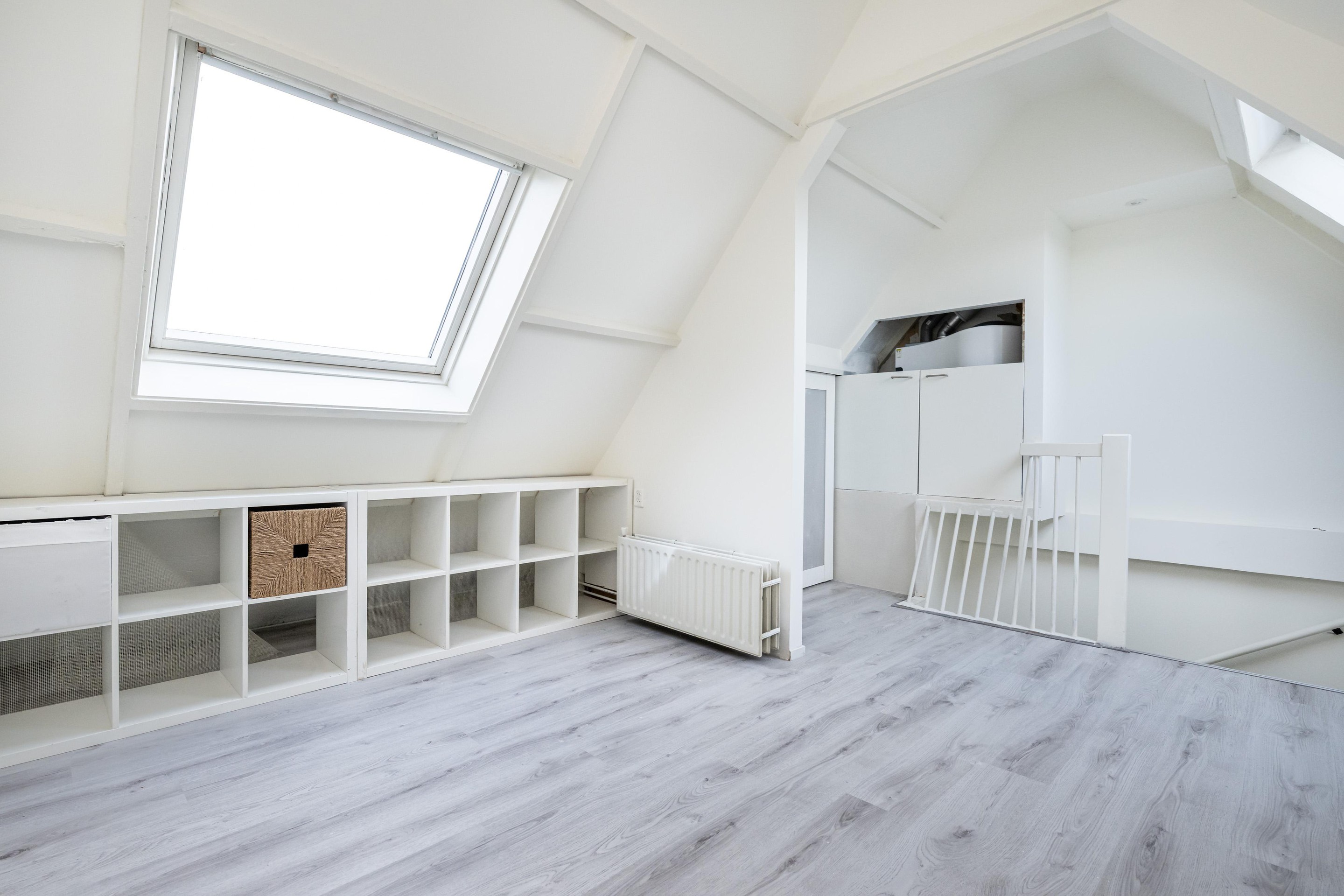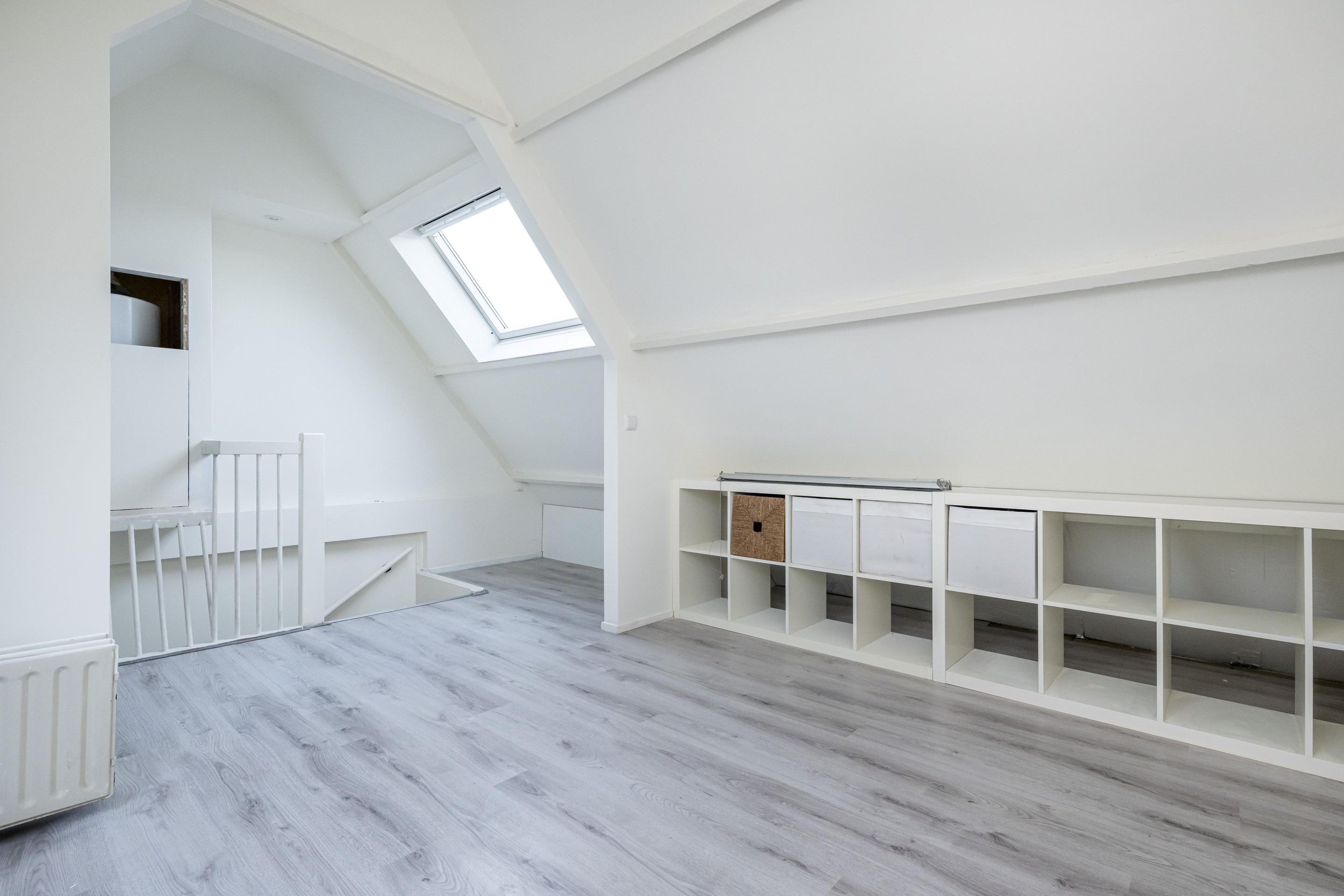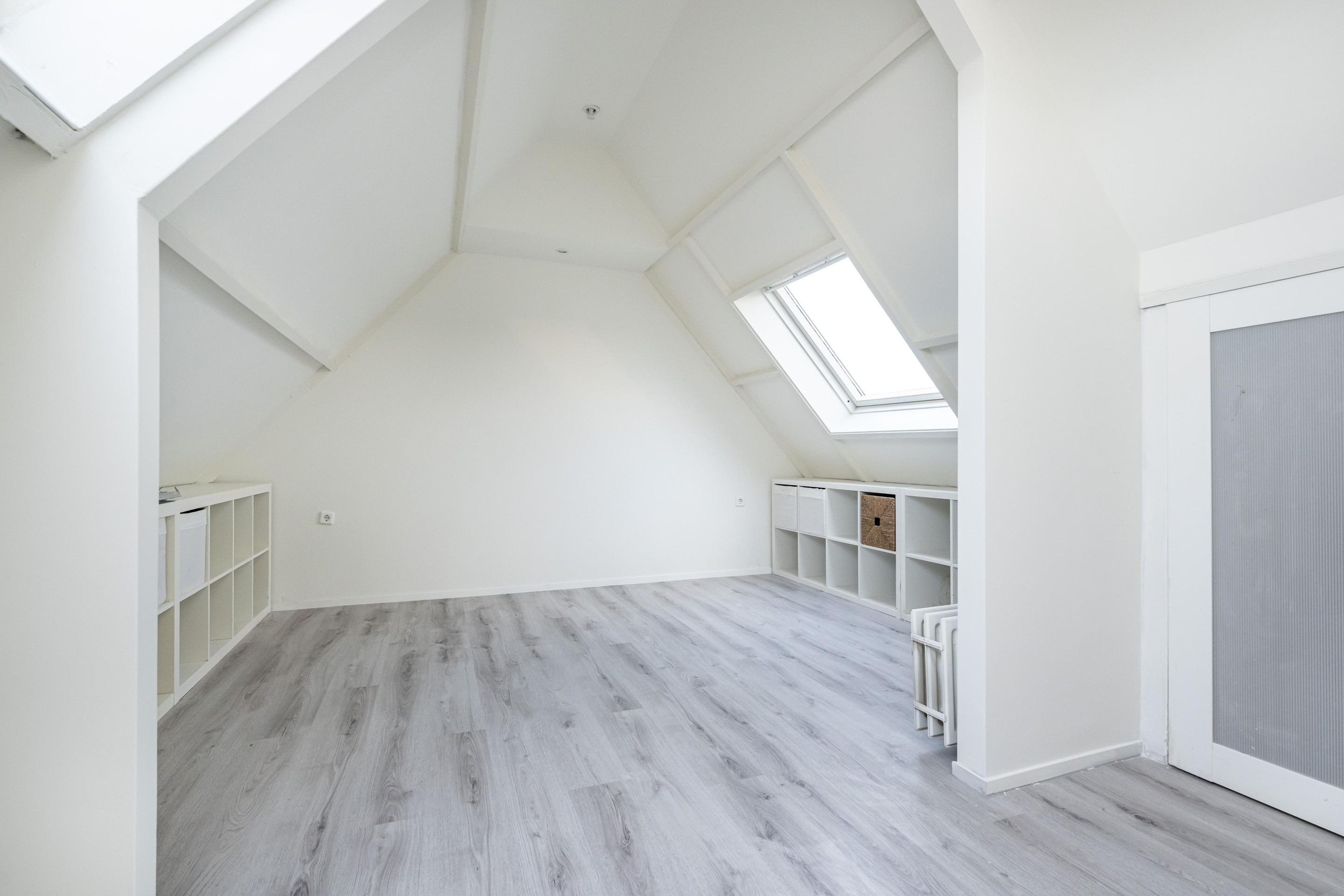 Laminaatvloer, 2 x Velux dakraam, radiator en bergruimte achter knieschot.