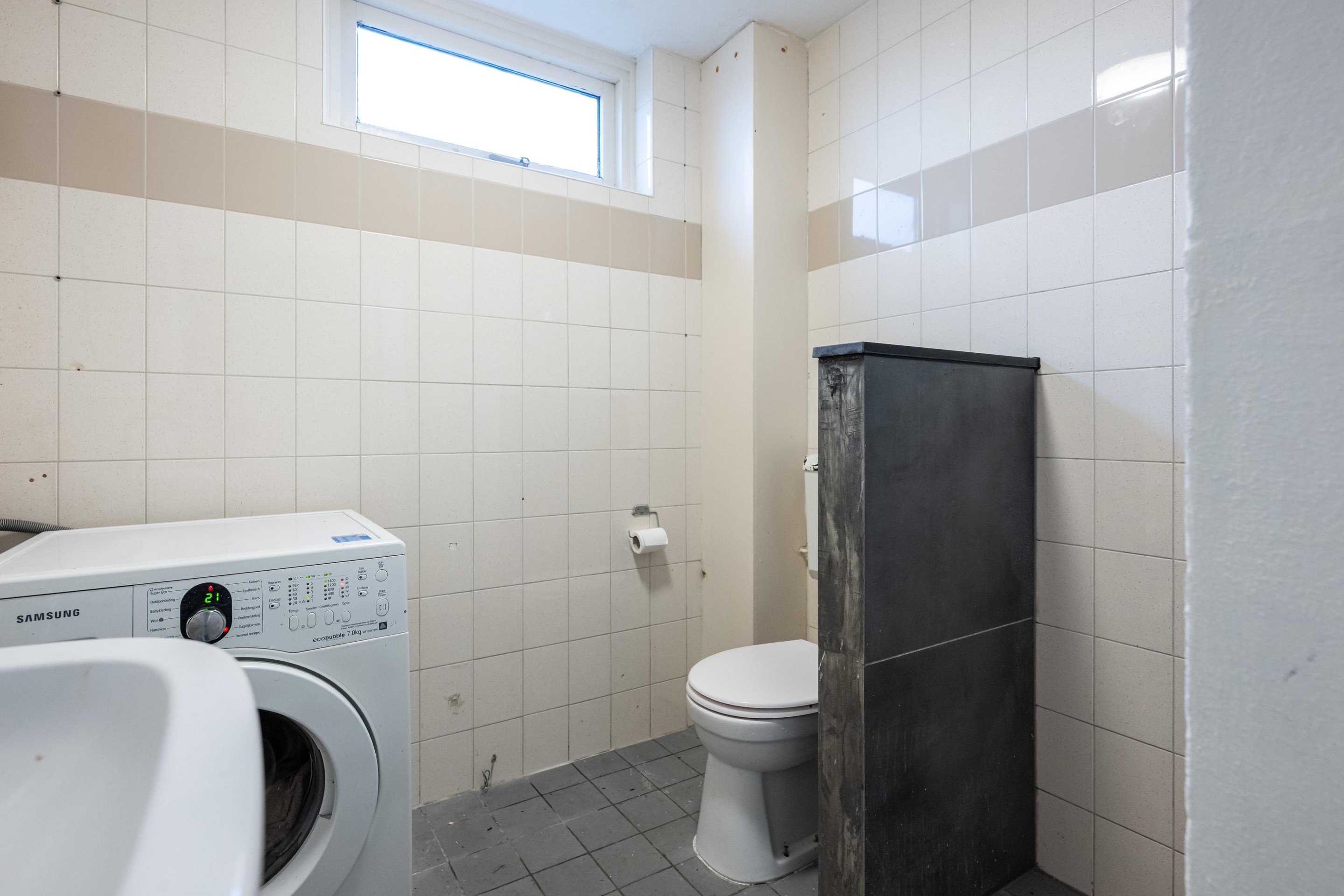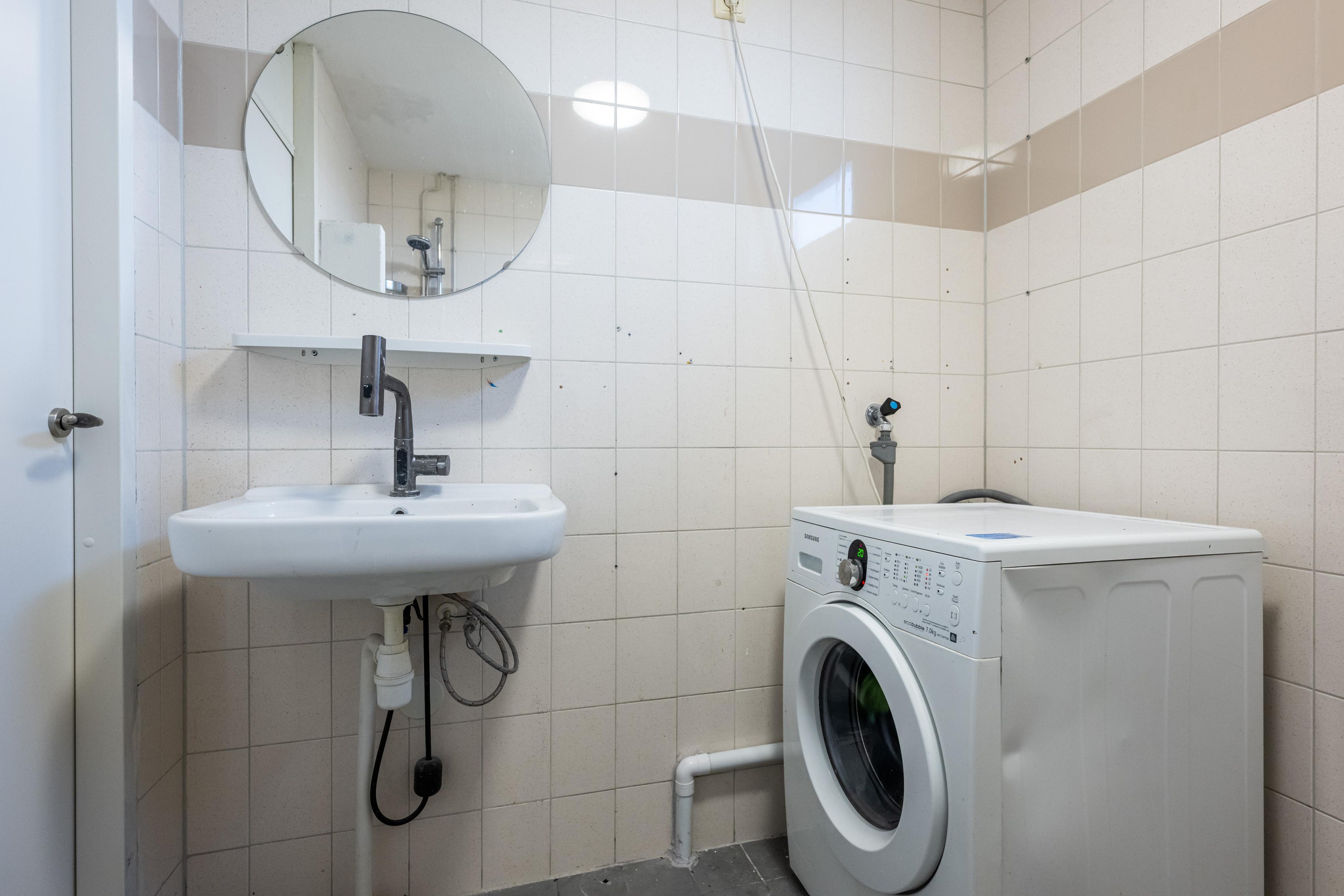 Tegelvloer, staand toilet, wastafel, inloopdouche, witgoed aansluiting en geheel betegeld.