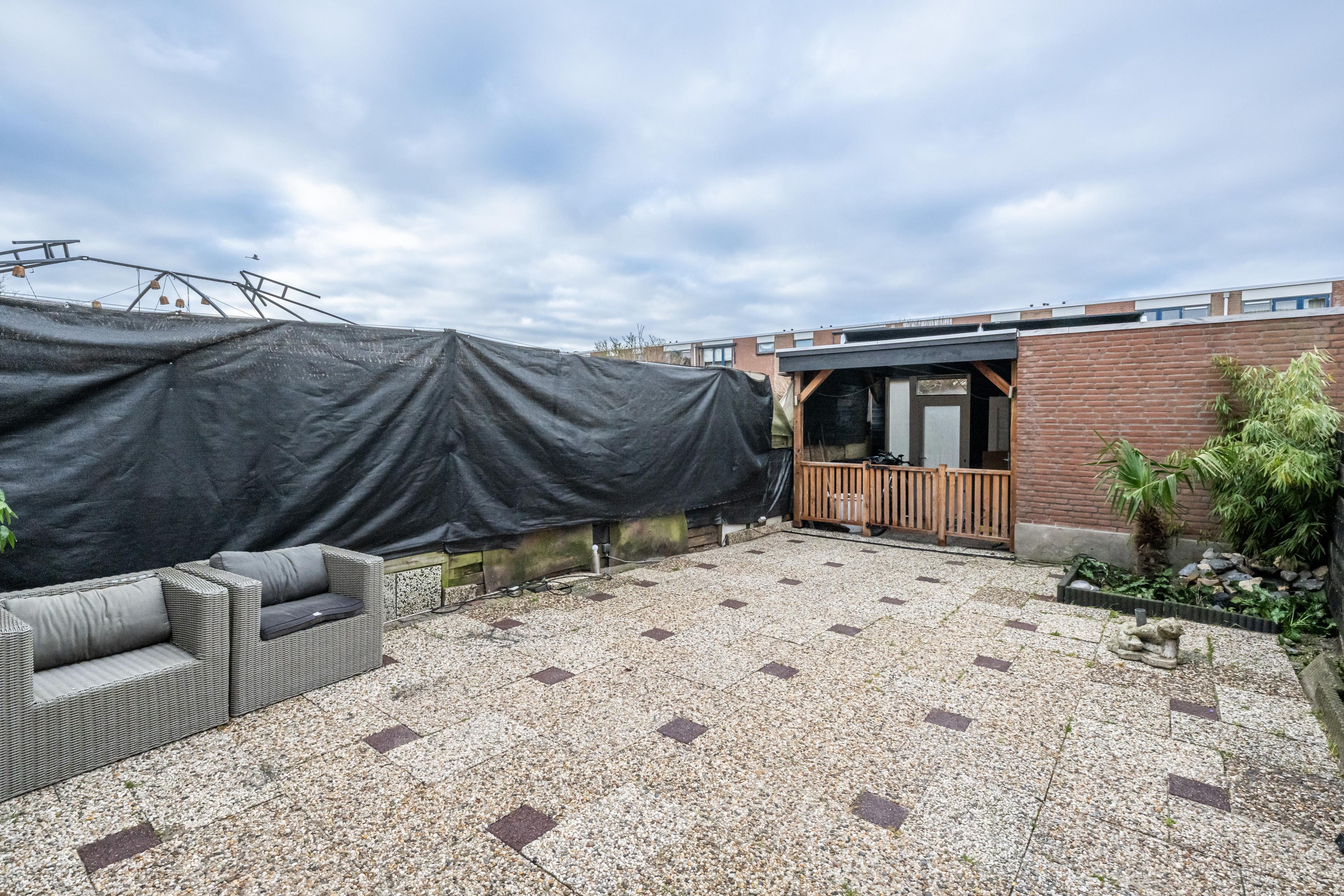 Grindtegels, buitenkraan, elektra en een zonnescherm hand bediend.