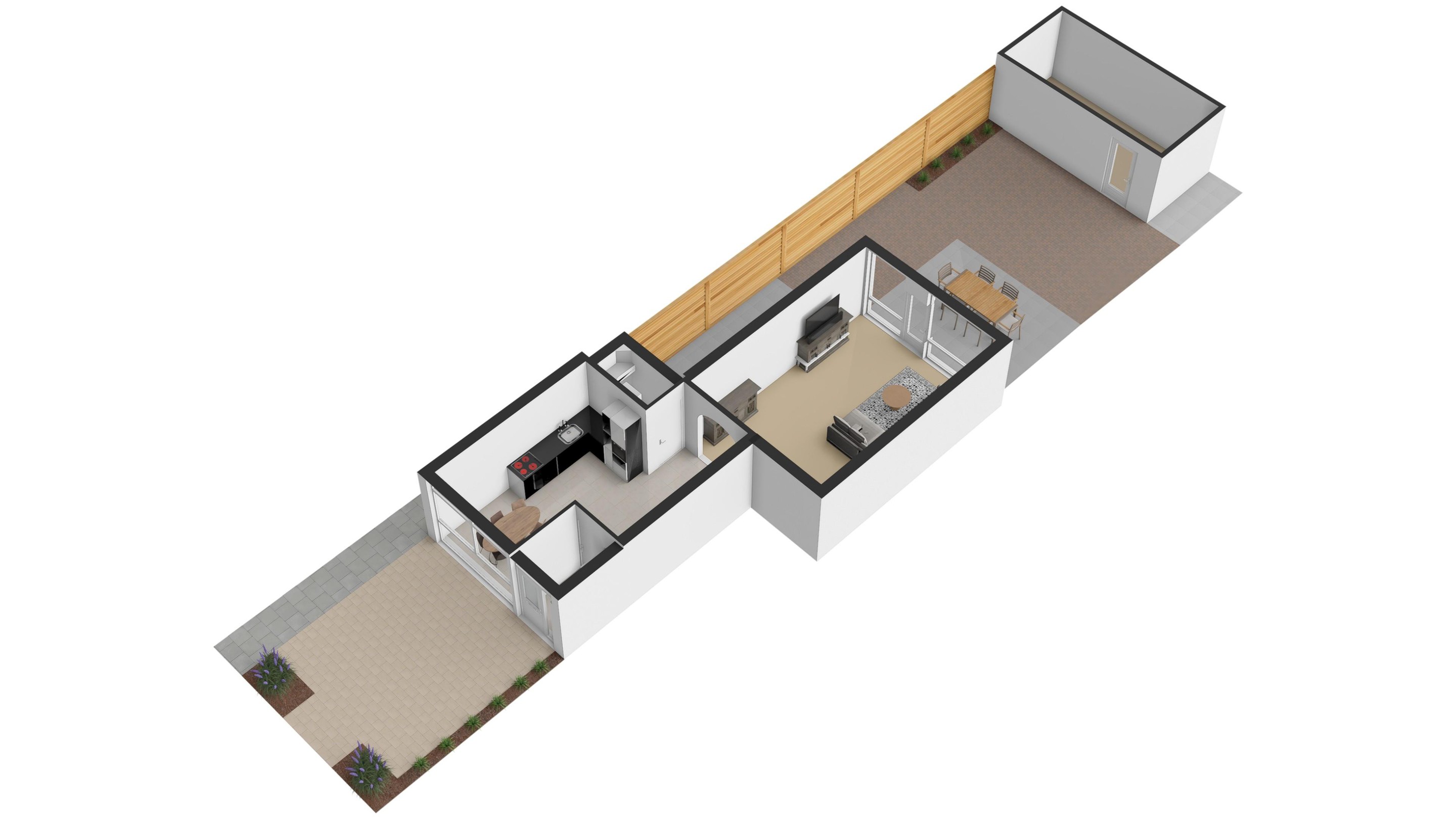 De ruime woonkamer beschikt over een comfortabel zitgedeelte aan de achterzijde, een moderne tegelvloer met vloerverwarming en grote raampartijen die zorgen voor een prettige lichtinval. Rolluiken bieden extra comfort en privacy. Via de woonkamer is er directe toegang tot de zonnige achtertuin.