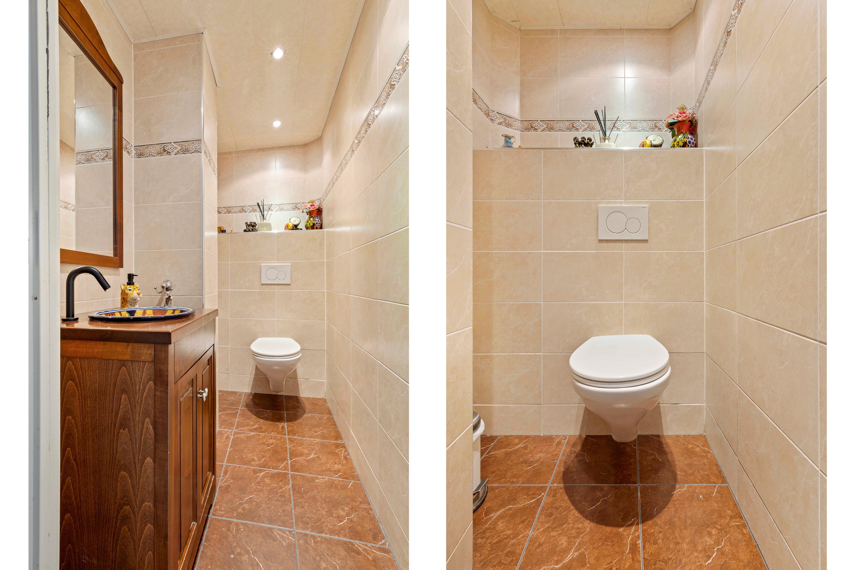 De royale toiletruimte is uitgevoerd met een vrijhangend toilet, fonteintje met meubel, inbouwspots en mechanische ventilatie. De wanden zijn tot het plafond betegeld.