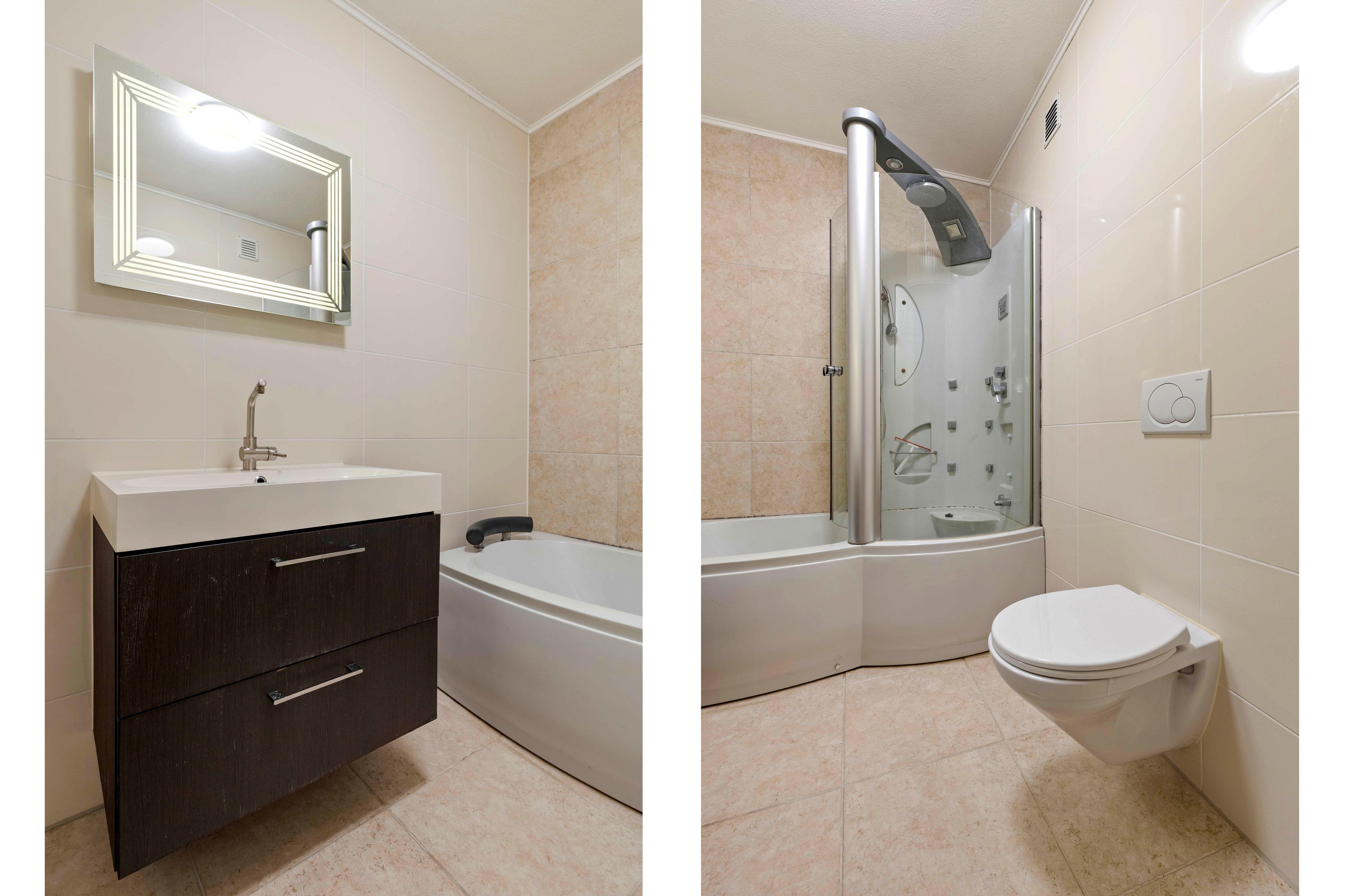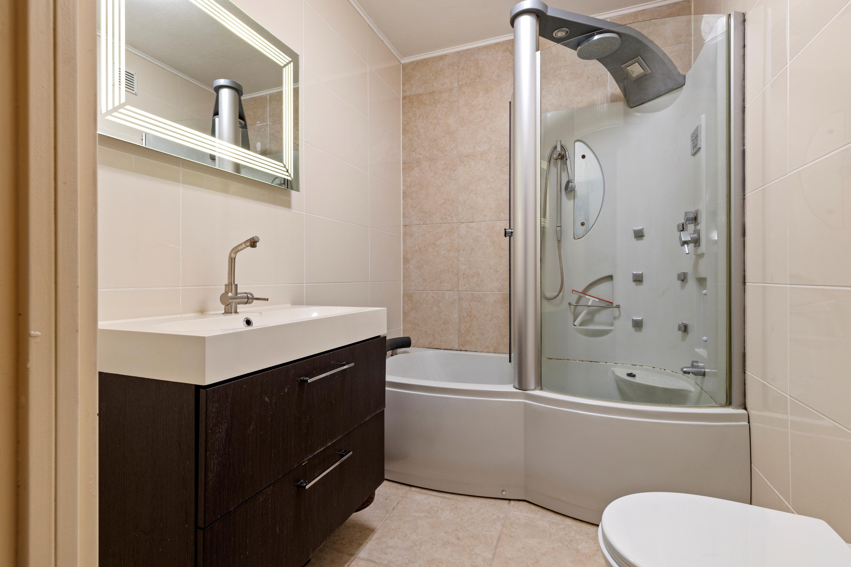 De badkamer (ca. 2015) is compleet ingericht met een wastafelmeubel, bad/douchecombinatie en een vrijhangend toilet. Afwerking met tegelvloer, tot plafond betegelde wanden en mechanische ventilatie.