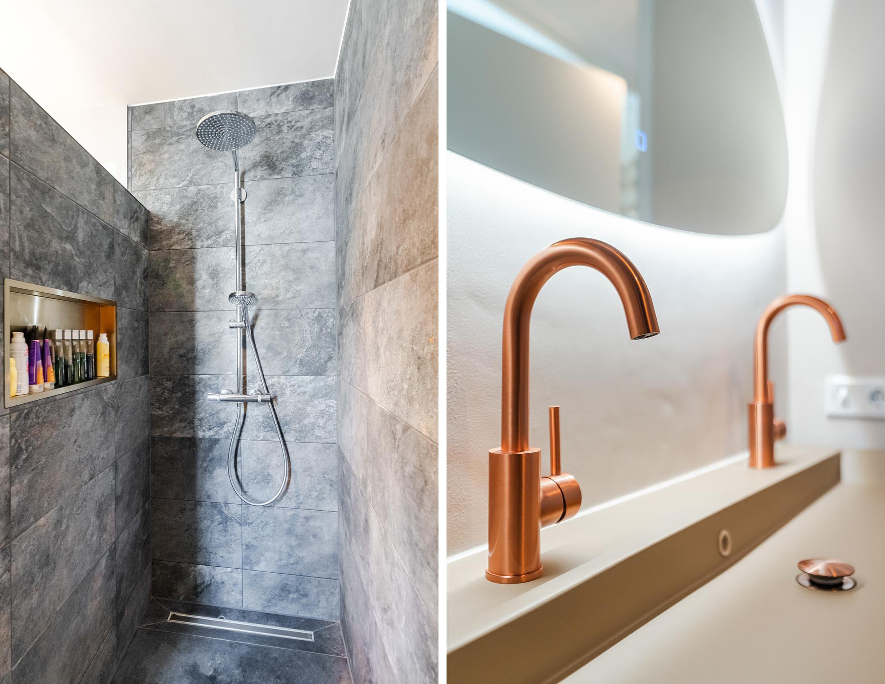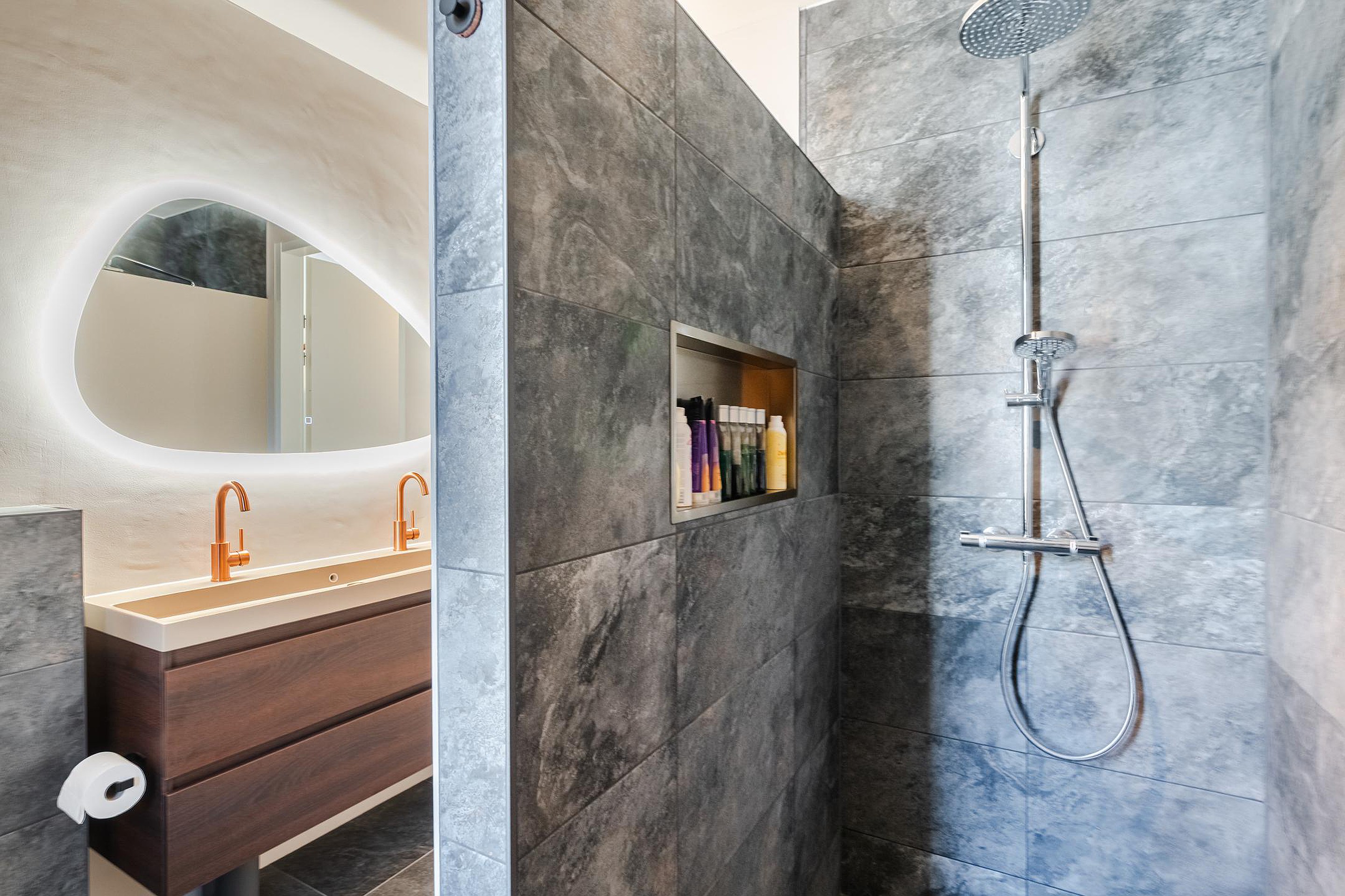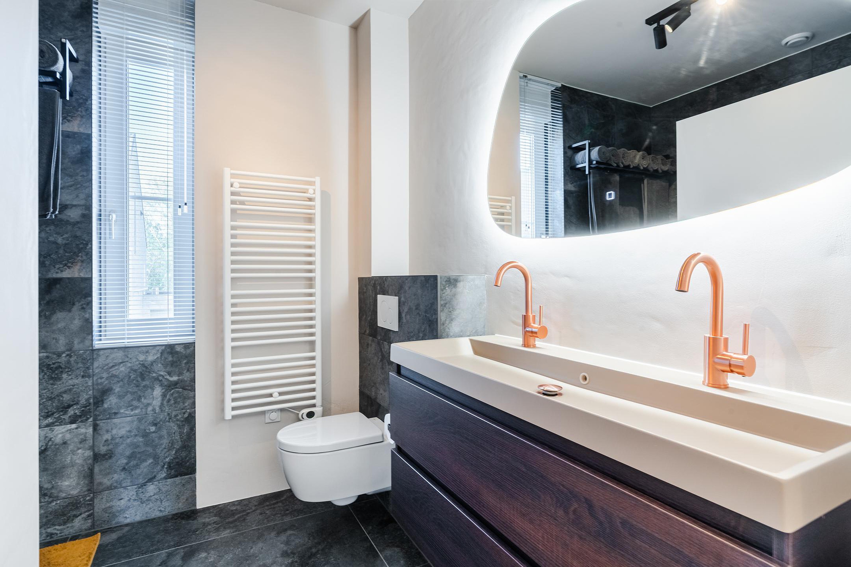 Op de eerste verdieping bevinden zich twee slaapkamers, waarvan één met een royale inloopkast. Deze inloopkast kan, indien gewenst, eenvoudig worden omgebouwd tot een derde slaapkamer. Verder vind je op deze verdieping een overloop en een moderne badkamer, voorzien van een groot wastafelmeubel, een inloopdouche en een toilet.