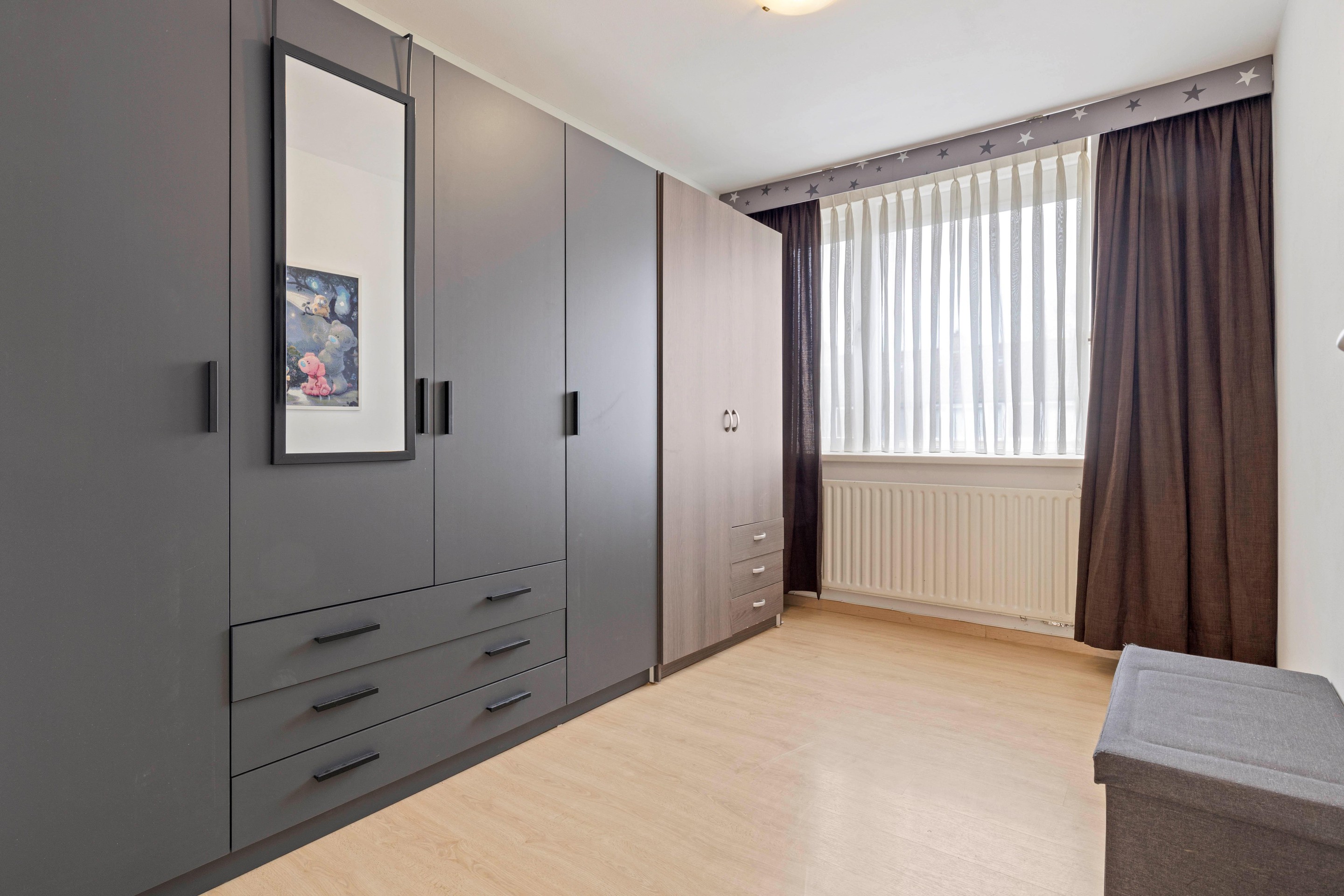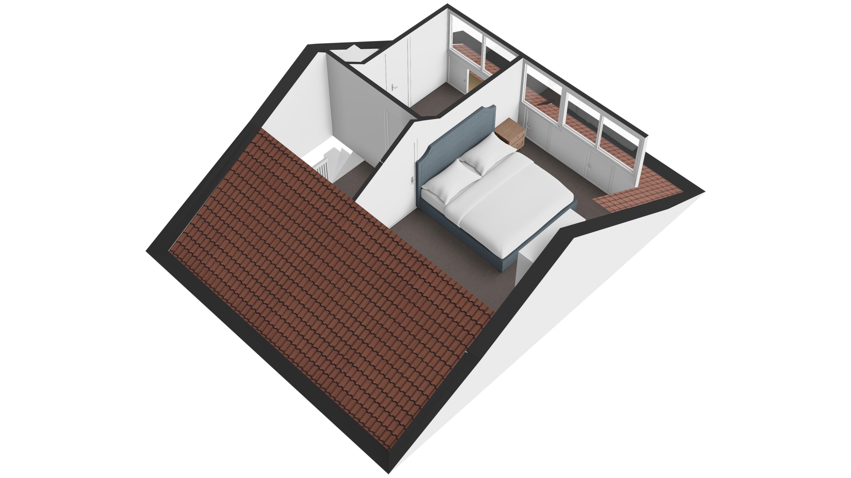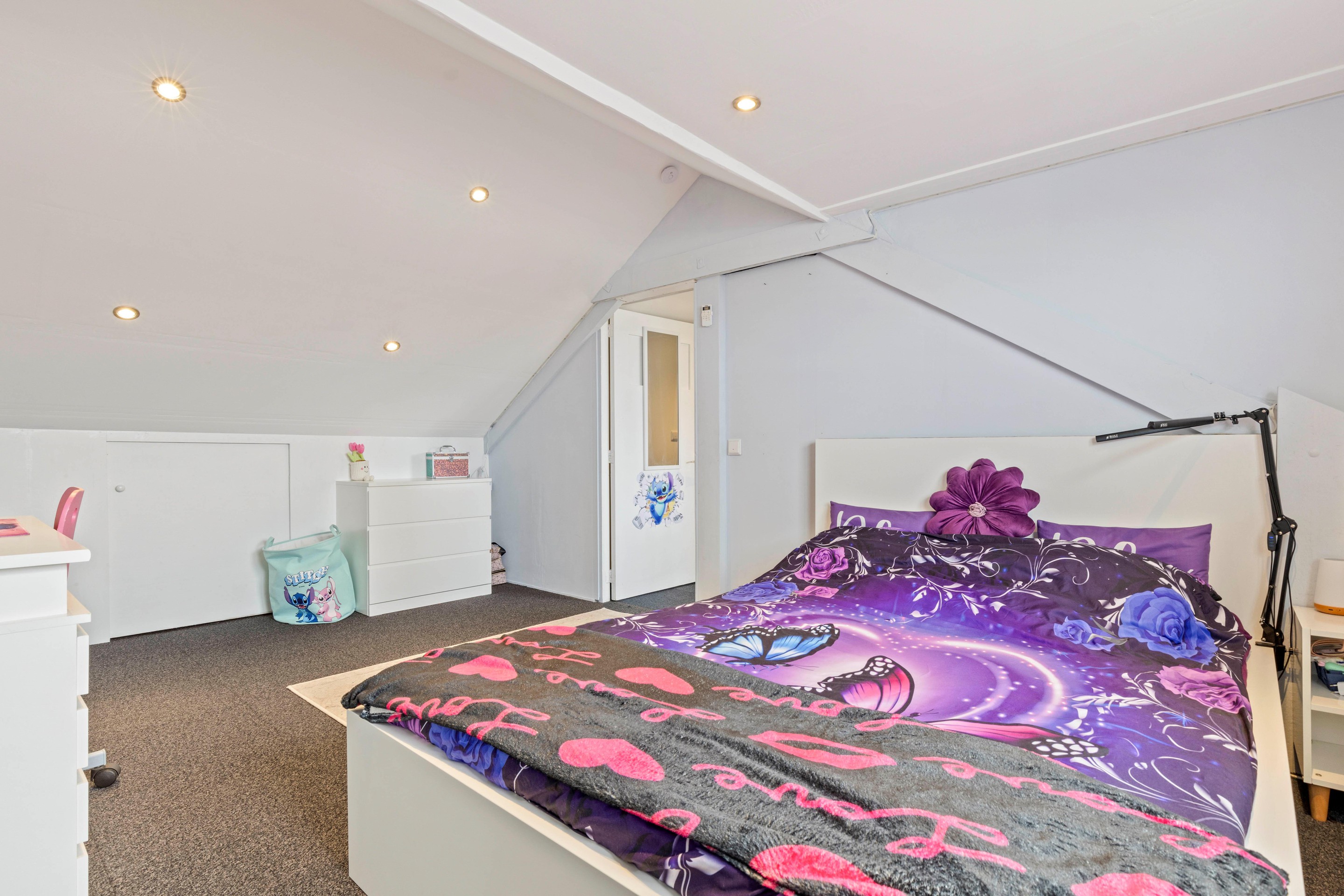 De ruime zolderkamer is voorzien van kunststof kozijnen met dubbele beglazing, airconditioning en praktische bergruimte achter de knieschotten. Deze verdieping is perfect als vierde slaapkamer, thuiskantoor of hobbyruimte.
