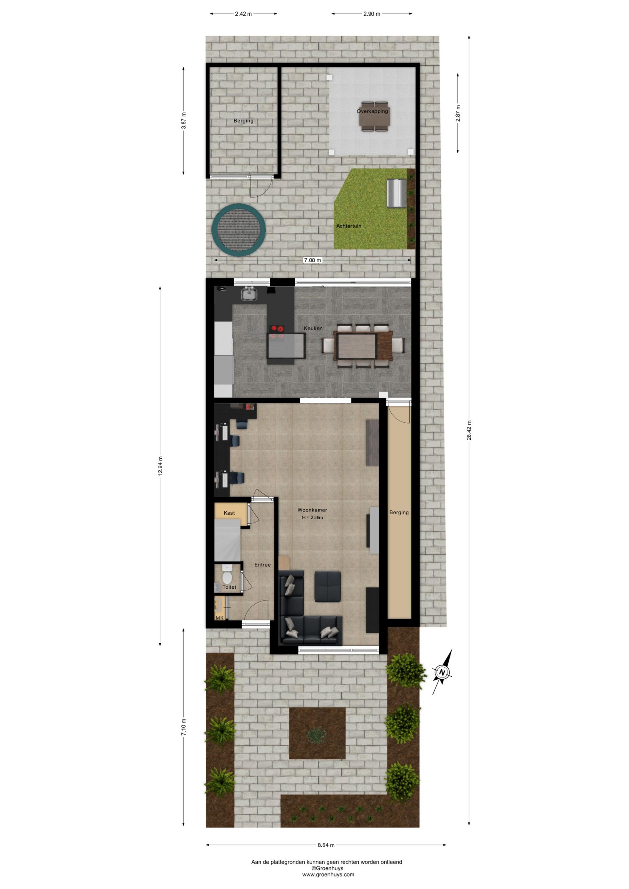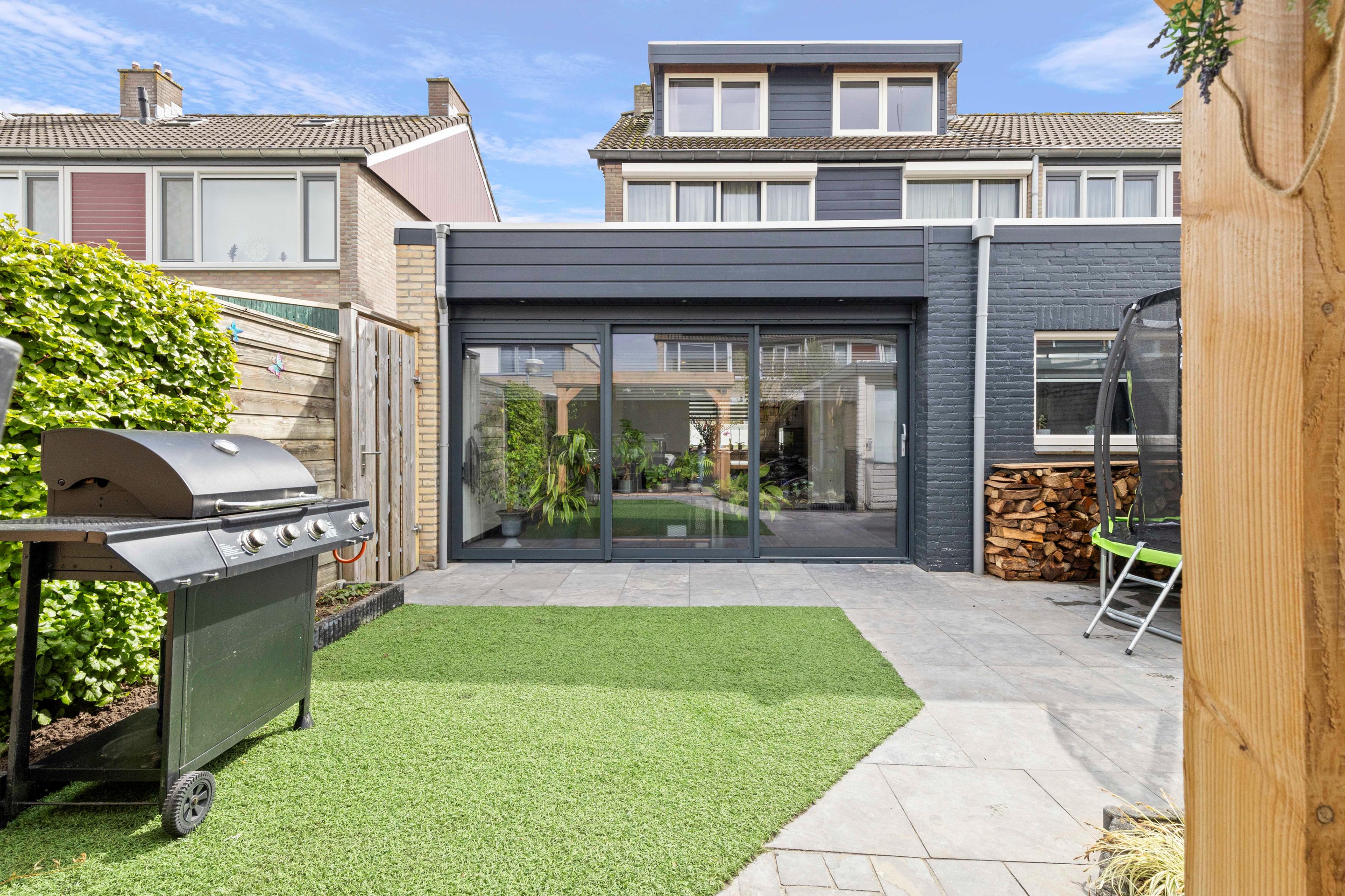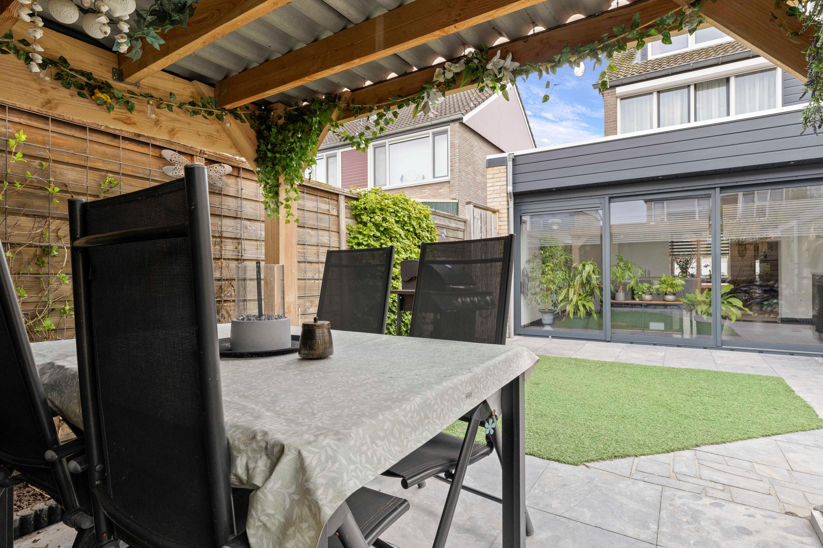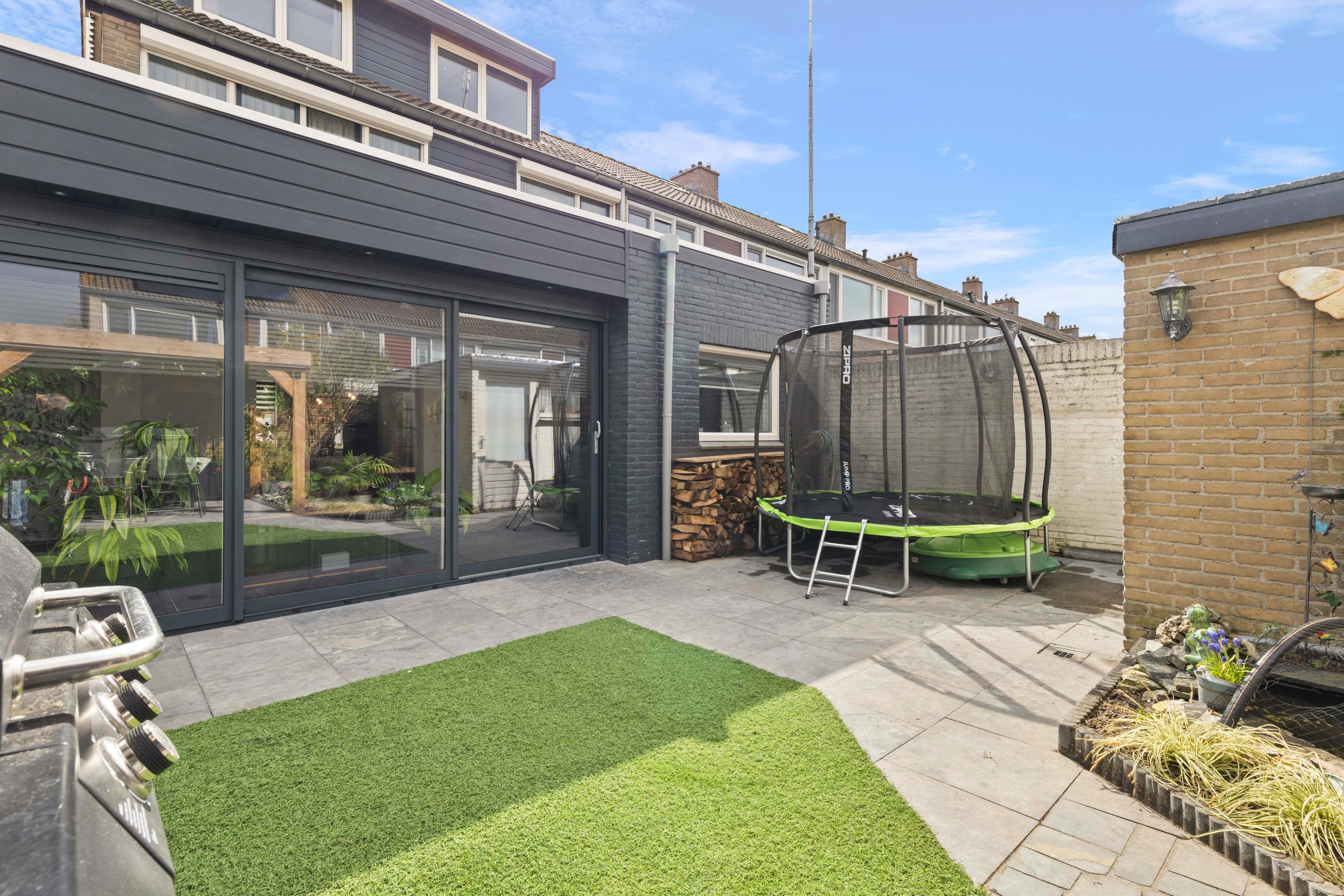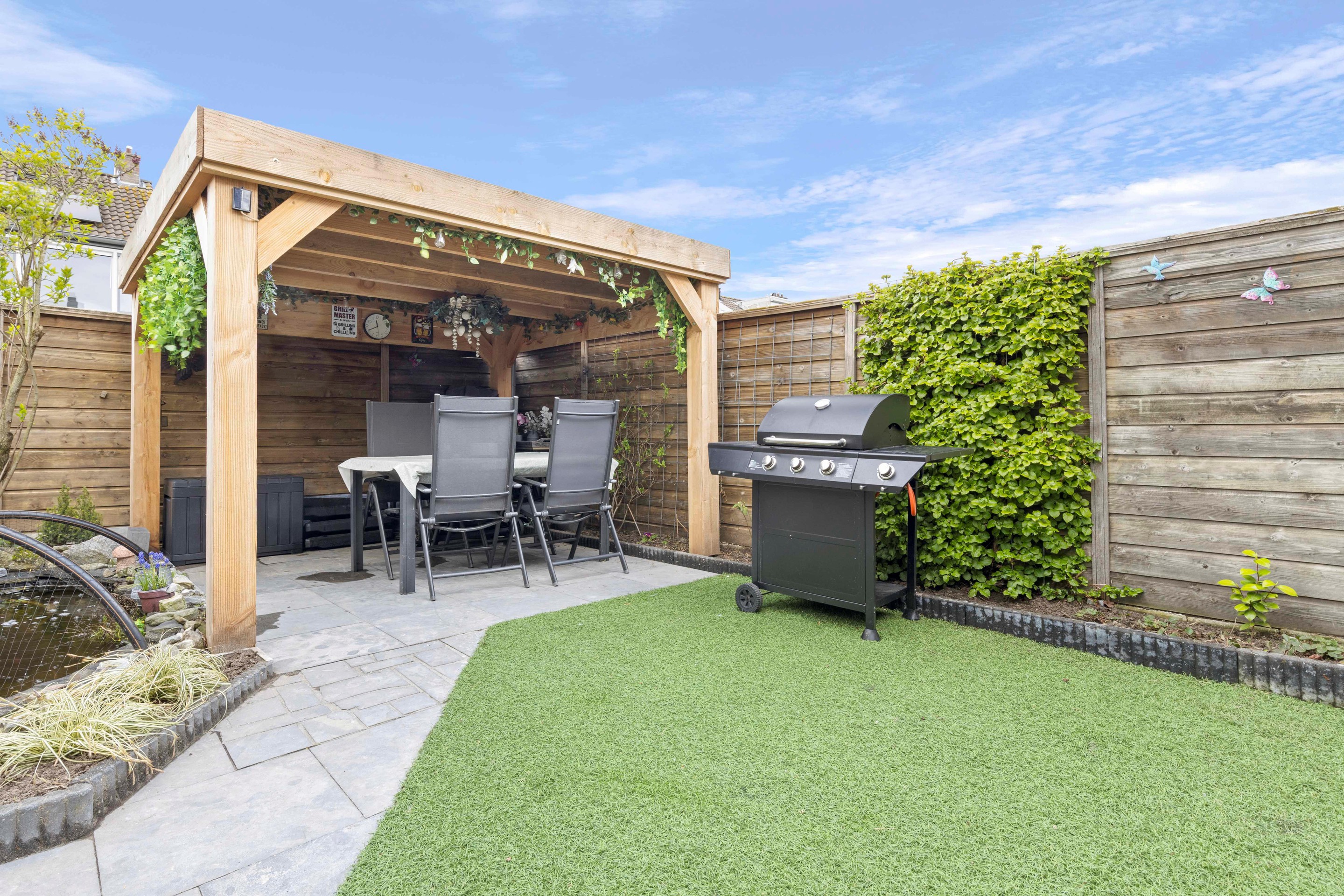 De achtertuin is verzorgd aangelegd met een kunstgras gazon, vijverpartij en een vrije achterom. De recent geplaatste pergola (ter overname) maakt het een heerlijke plek om buiten te zitten. Achterin de tuin bevindt zich nog een separate berging met elektra en verlichting.