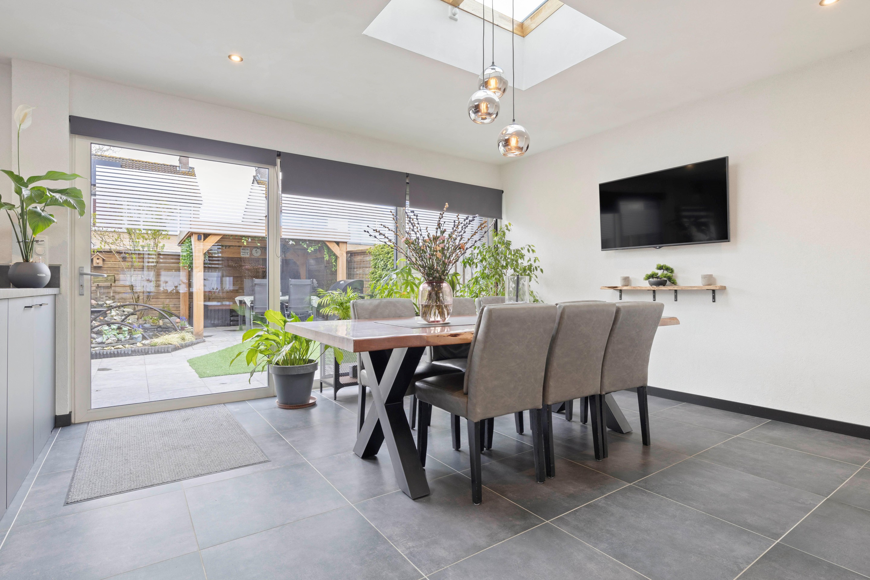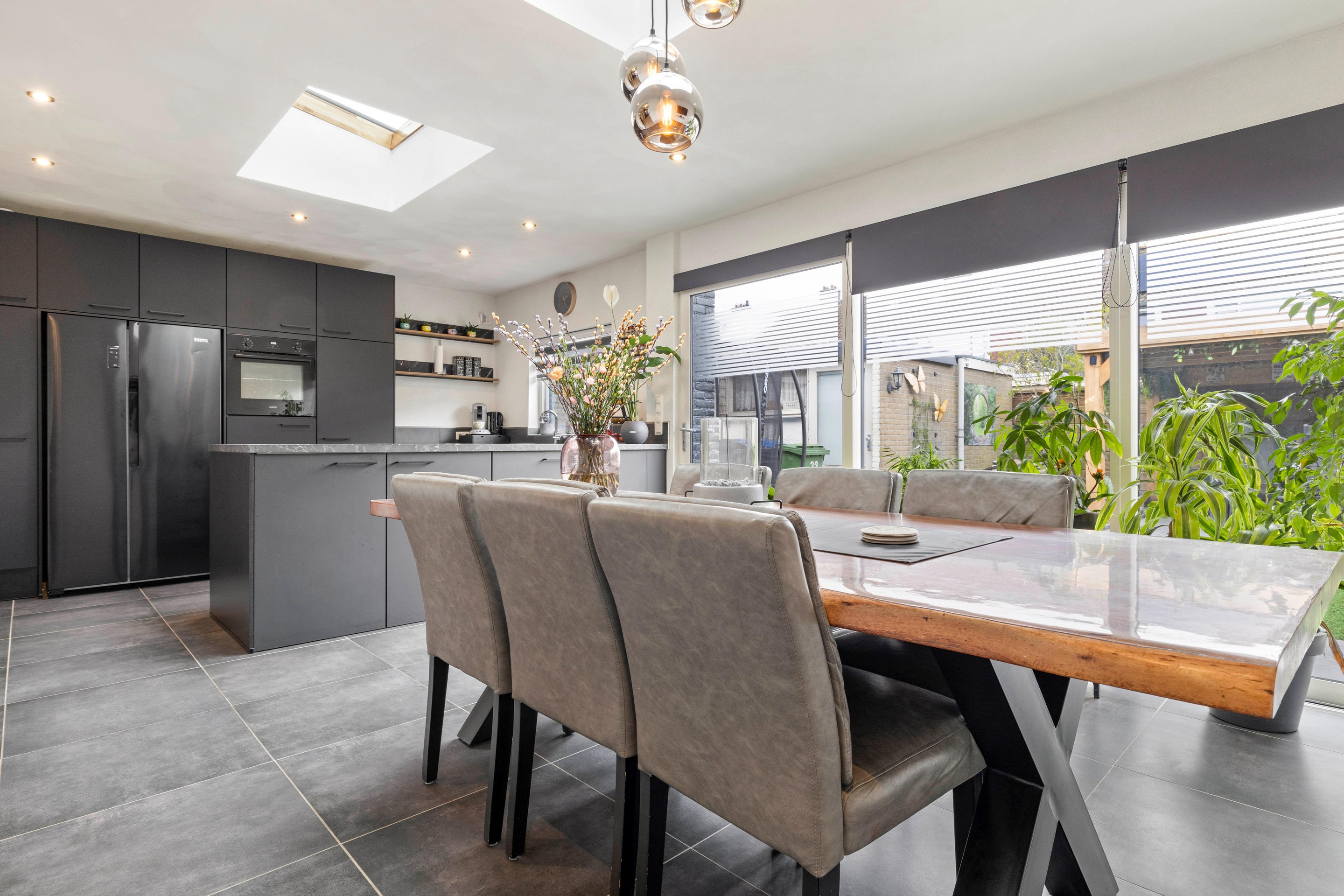 Aan de achterzijde bevindt zich de royale, in 2023 gerealiseerde uitbouw met een prachtige leefkeuken. Dankzij de grote schuifpui en twee dakramen geniet je hier van een zee aan licht en een mooi zicht op de tuin. De keuken is modern en compleet uitgerust met een 4-pits inductiekookplaat, inbouwafzuiging met koolstoffilter, oven, vaatwasser, koel-/vriescombinatie en een spoelbak met elektrische boiler. De kasten zijn uitgevoerd met softclose systemen en bieden volop opbergruimte. Er is meer dan genoeg plek voor een grote eettafel, waardoor dit echt het hart van het huis is.