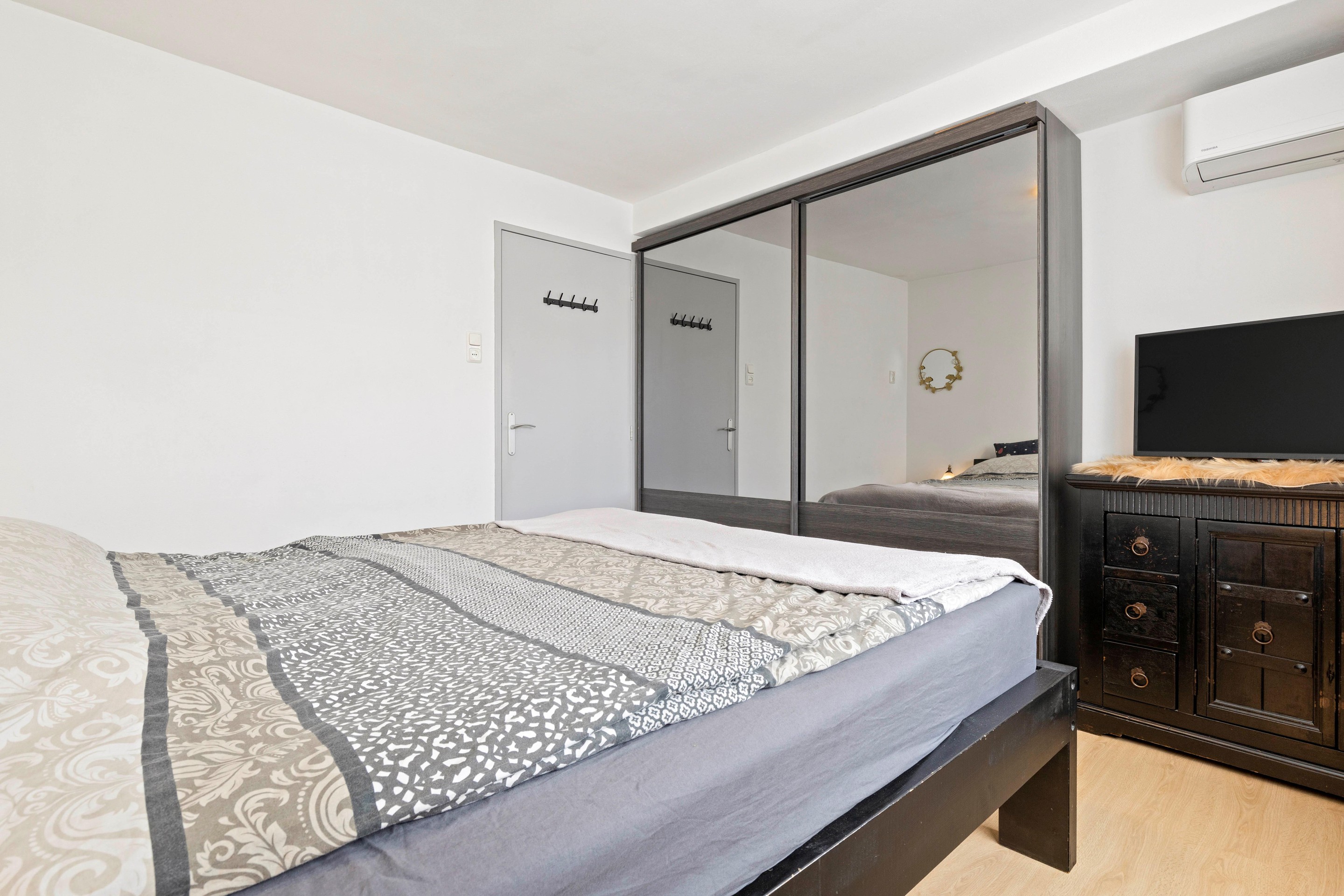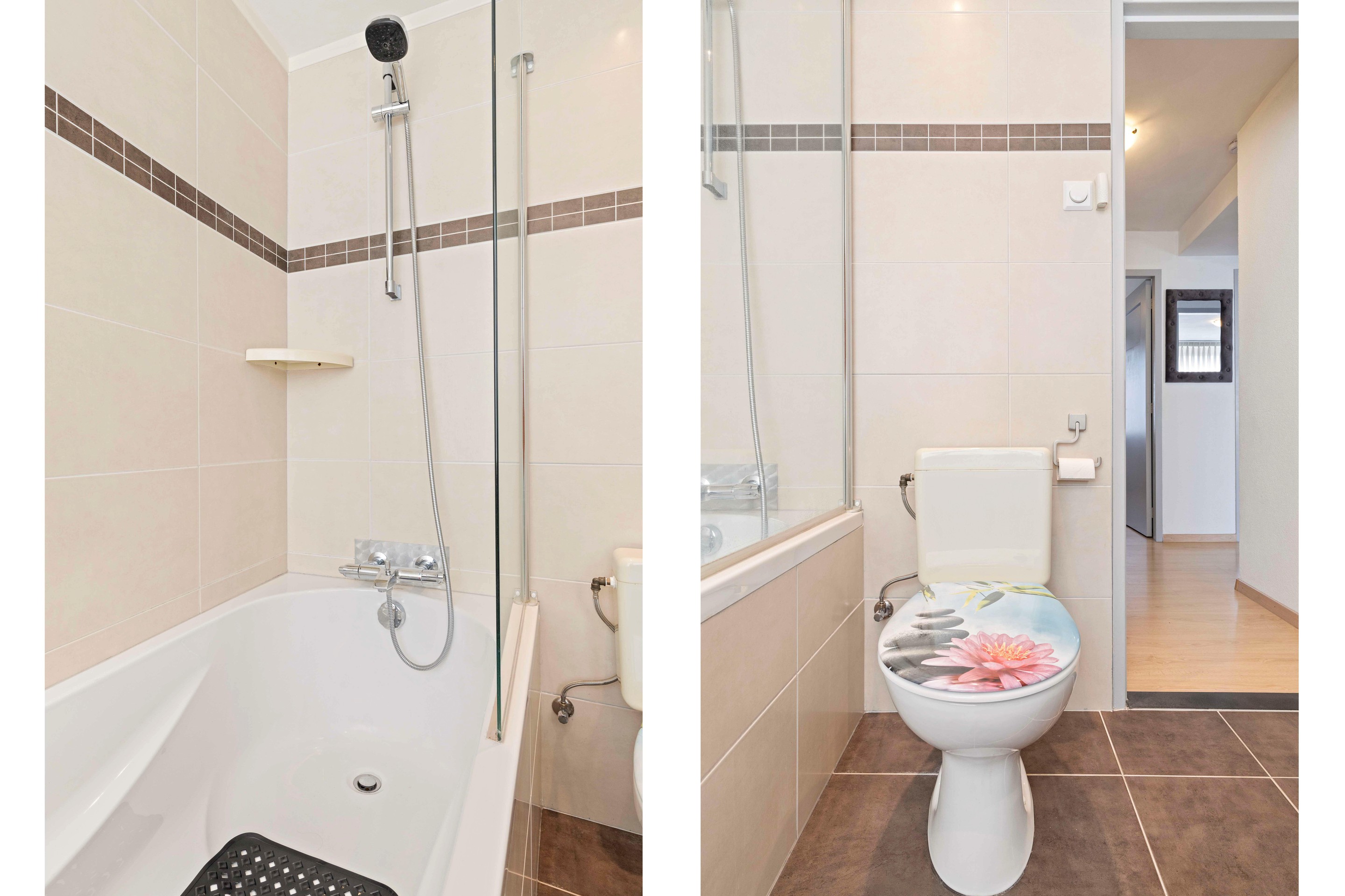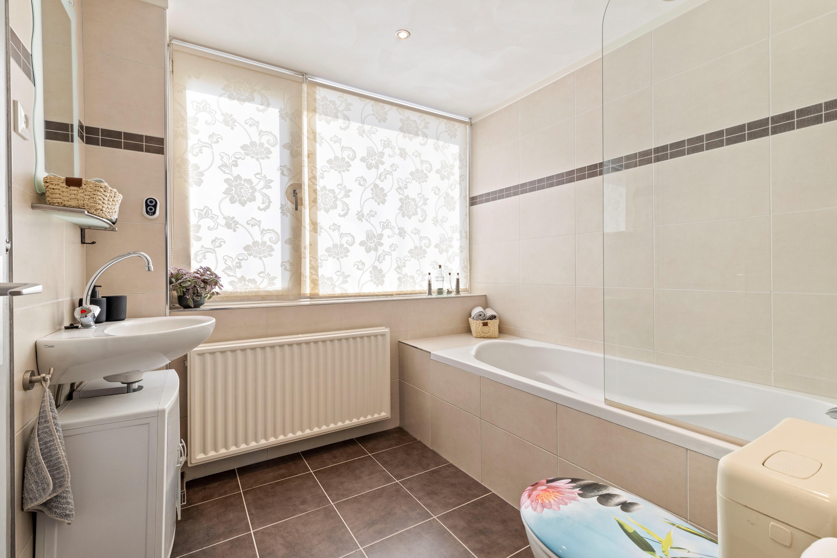De badkamer is gemoderniseerd en voorzien van een ligbad/douchecombinatie, wastafelmeubel, toilet en een praktische inbouwkast. Dankzij zowel natuurlijke als mechanische ventilatie is het hier altijd comfortabel. De afwerking bestaat uit een tegelvloer, volledig betegelde wanden en een plafond met inbouwspots.
