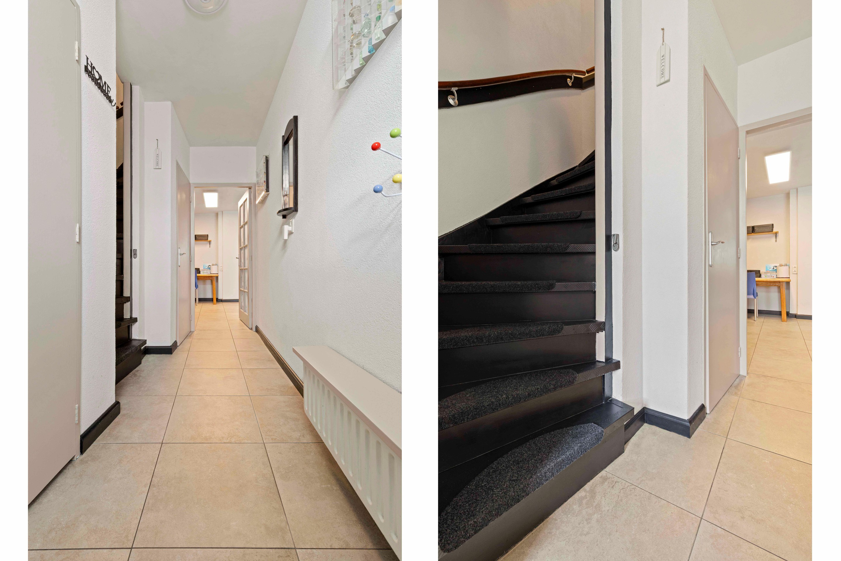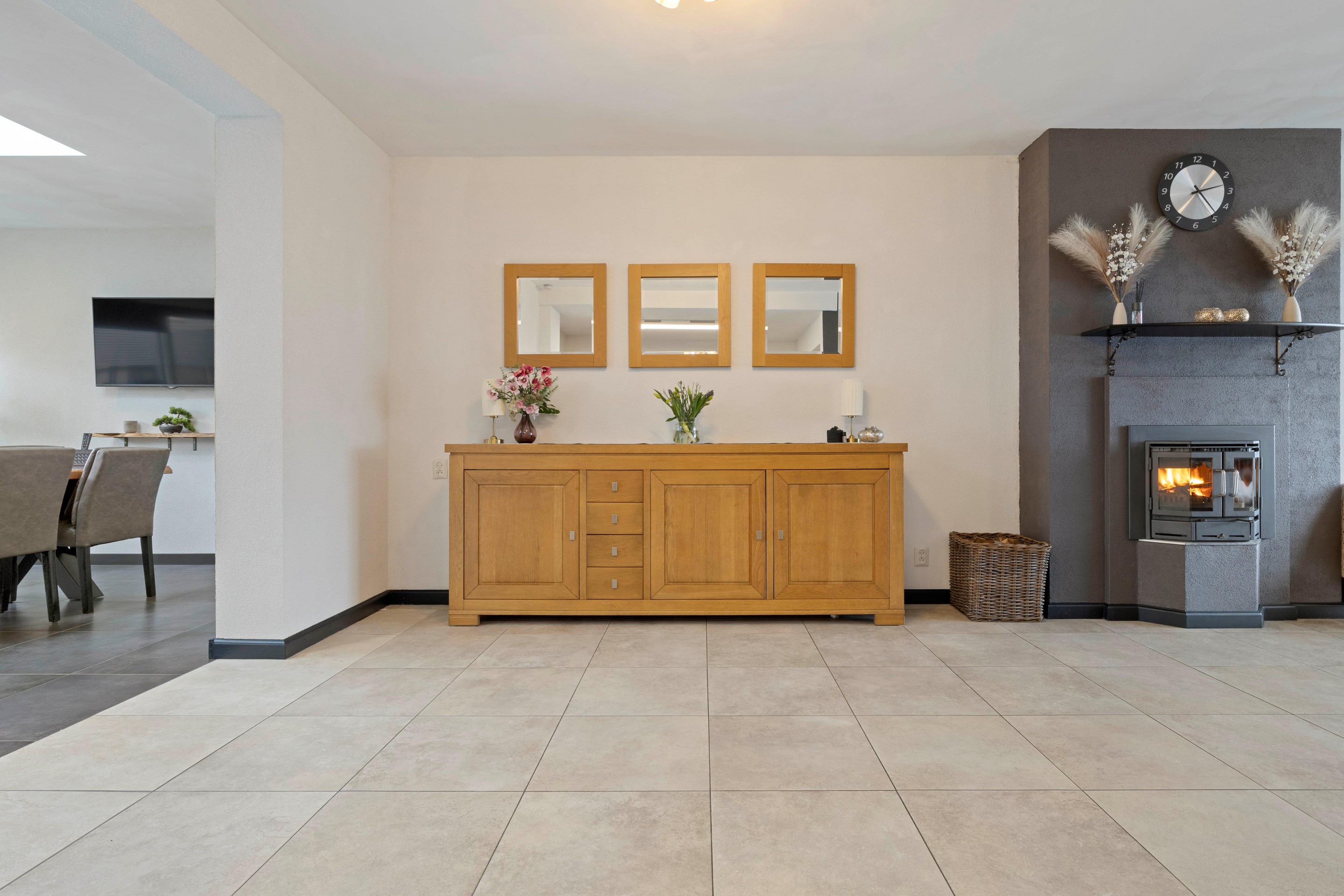 De begane grond is stijlvol afgewerkt met een tegelvloer voorzien van vloerverwarming, gestucte wanden en plafond.