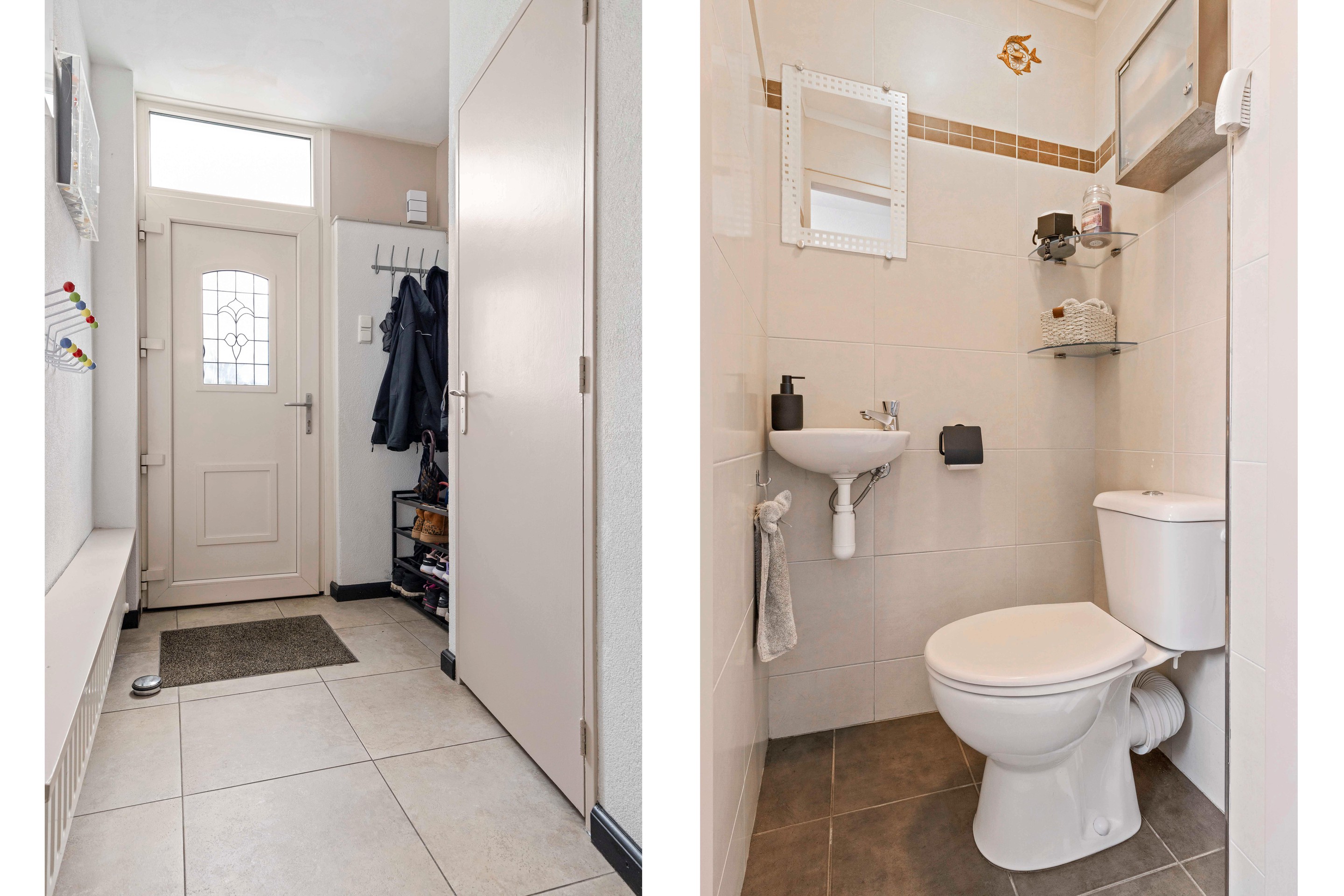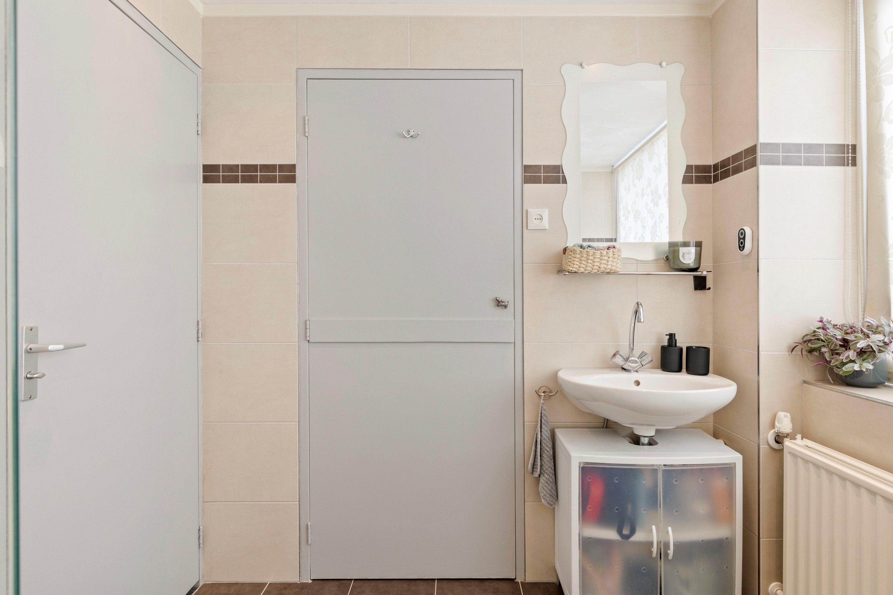 De keurig aangelegde voortuin met borders en buitenkraan zorgt voor een verzorgde eerste indruk. Binnenkomst in de hal geeft direct toegang tot de lichte woonkamer, het toilet en de vernieuwde meterkast (2023). De praktische kelderkast biedt extra bergruimte en huisvest de unit voor de vloerverwarming.