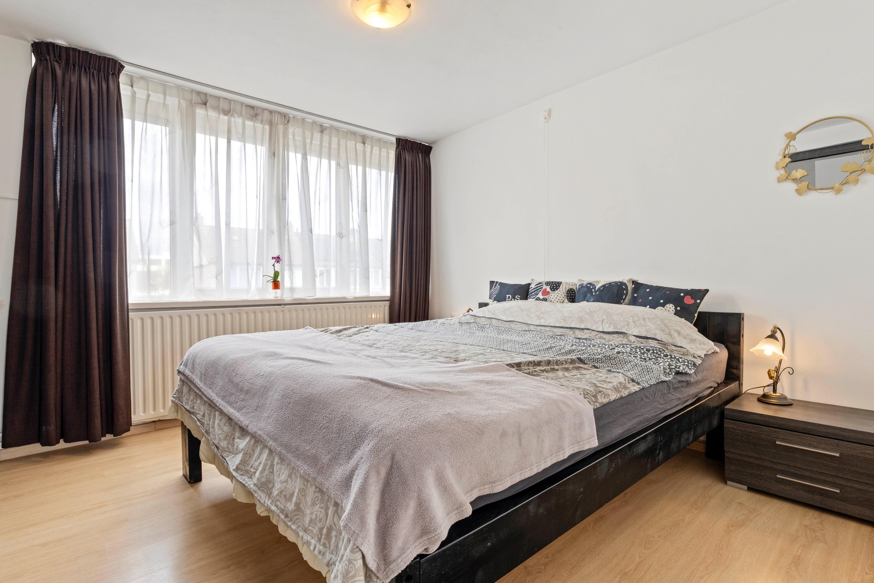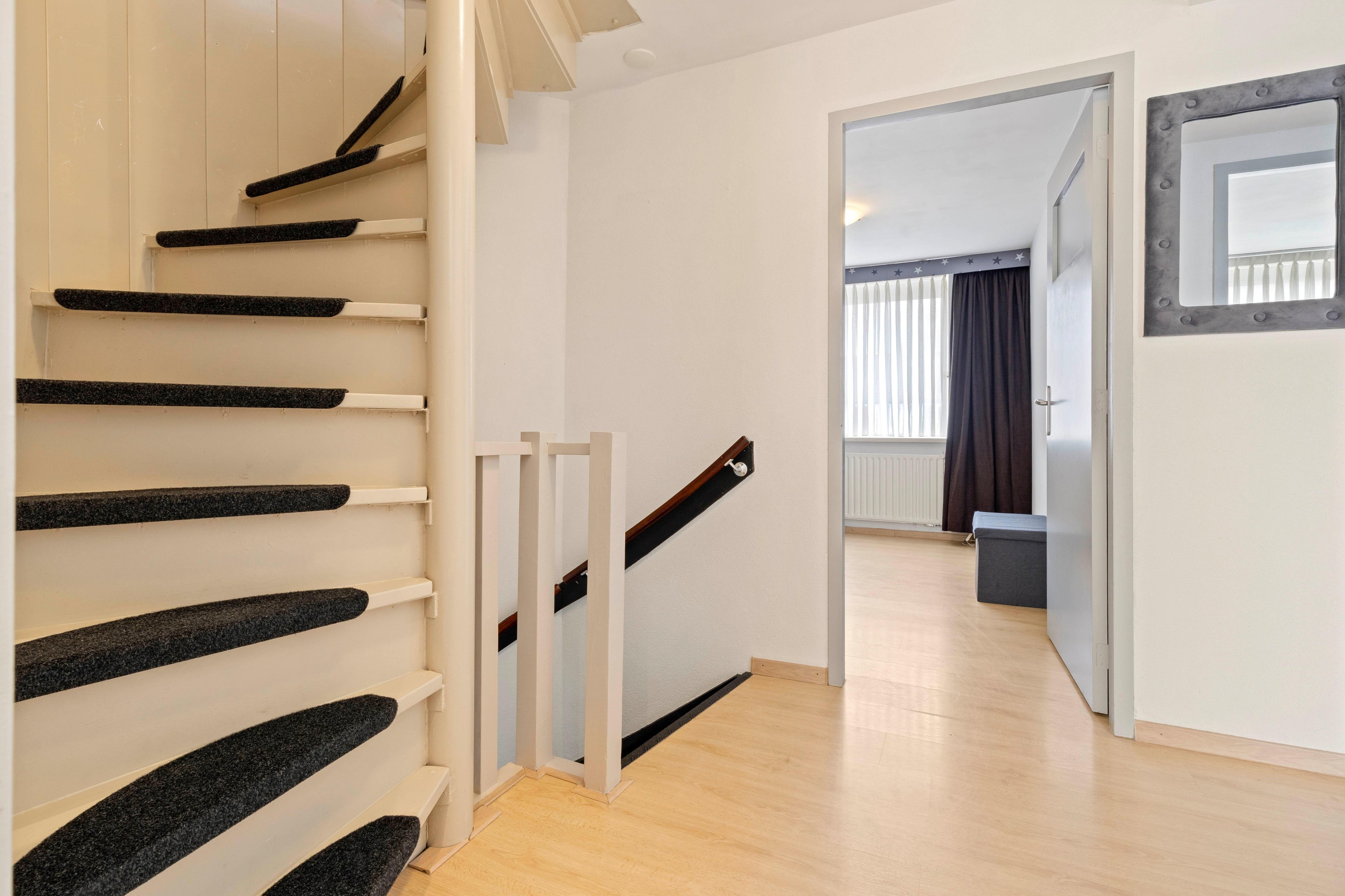 Op de eerste verdieping vind je drie slaapkamers, een separate wasruimte en een gemoderniseerde badkamer. Twee slaapkamers liggen aan de achterzijde en één aan de voorzijde. Alle kamers zijn voorzien van kunststof kozijnen met HR++ beglazing en elektrisch bedienbare rolluiken. Eén van de slaapkamers beschikt over airconditioning.