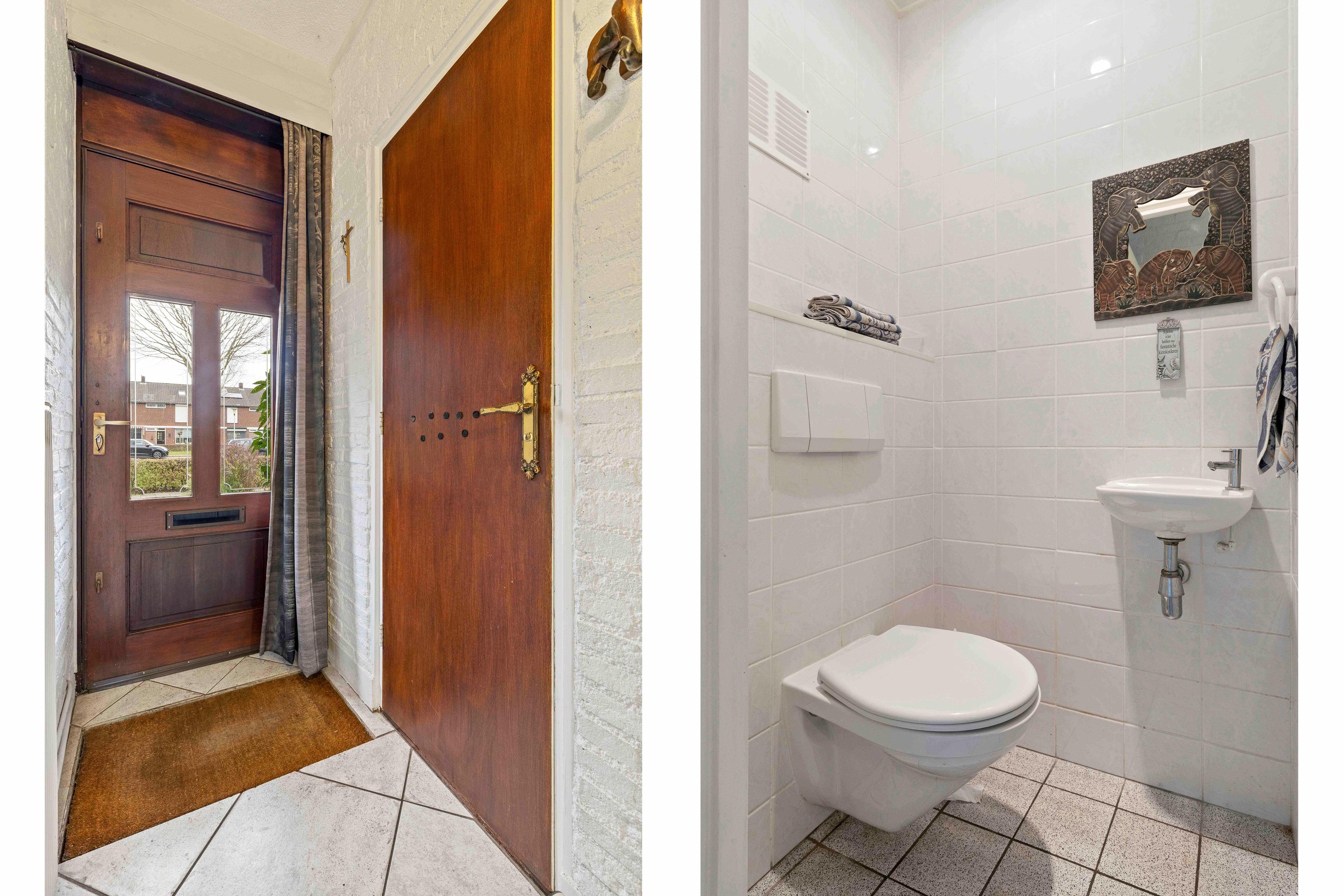 Via de entree bereikt u de hal met toegang tot de keuken, de meterkast en een praktische trapkast met veel berg- en provisieruimte. Het toilet is tot aan het plafond betegeld en voorzien van een vrijhangend closet en fonteintje.