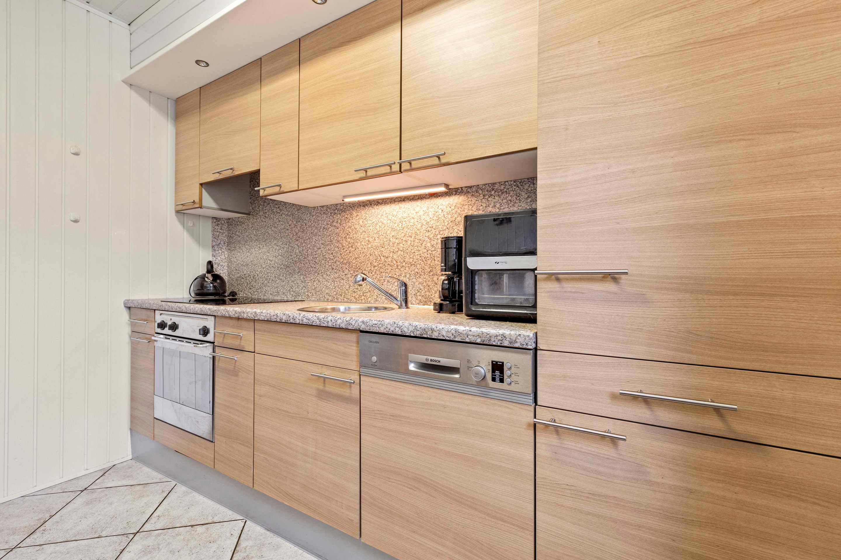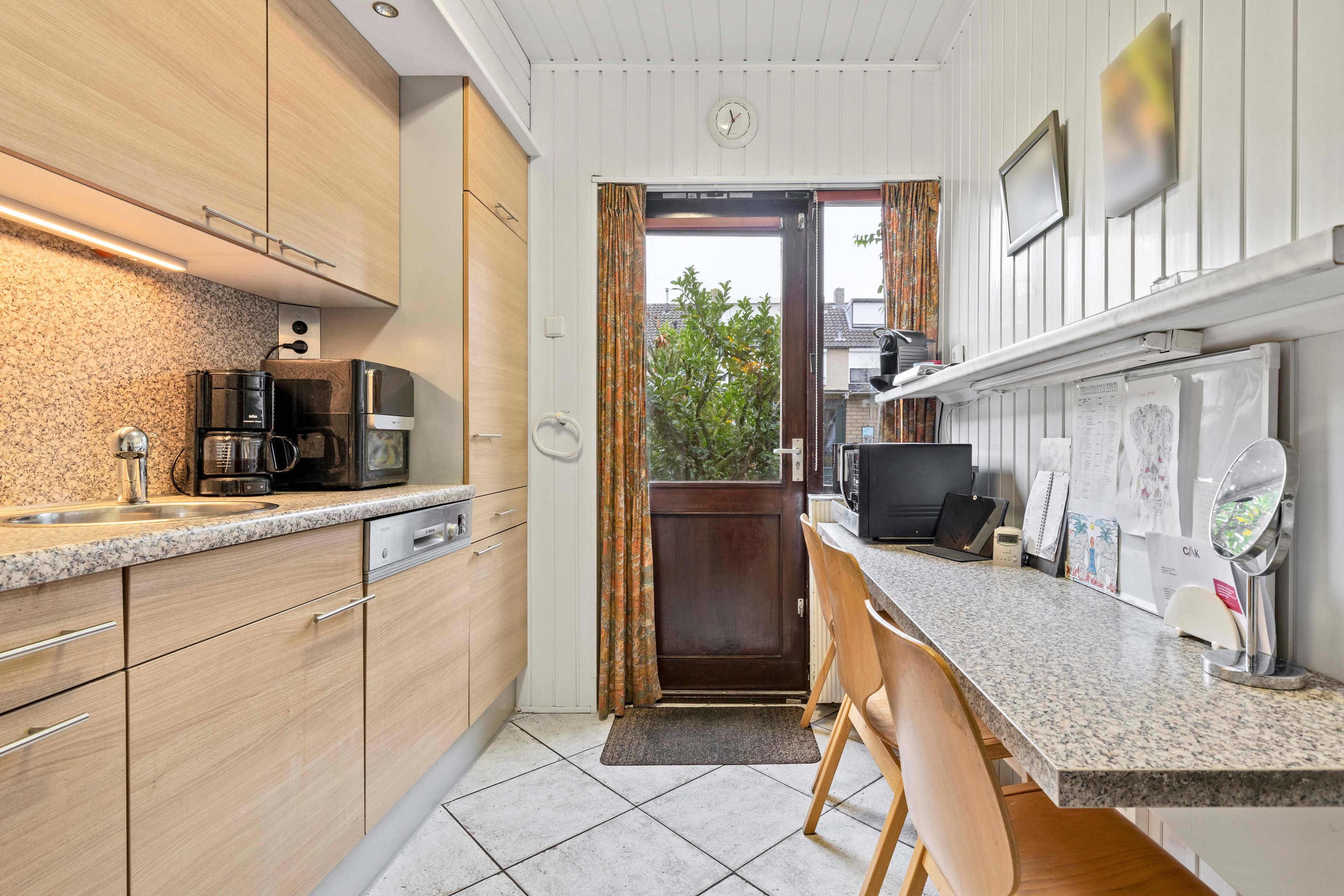 De keuken (2015) is uitgevoerd in een rechte opstelling en voorzien van alle gewenste inbouwapparatuur: een 4-pits inductiekookplaat, afzuigkap, oven, vaatwasser en koelkast. Daarnaast is er volop kastruimte en heeft u direct toegang tot de achtertuin.