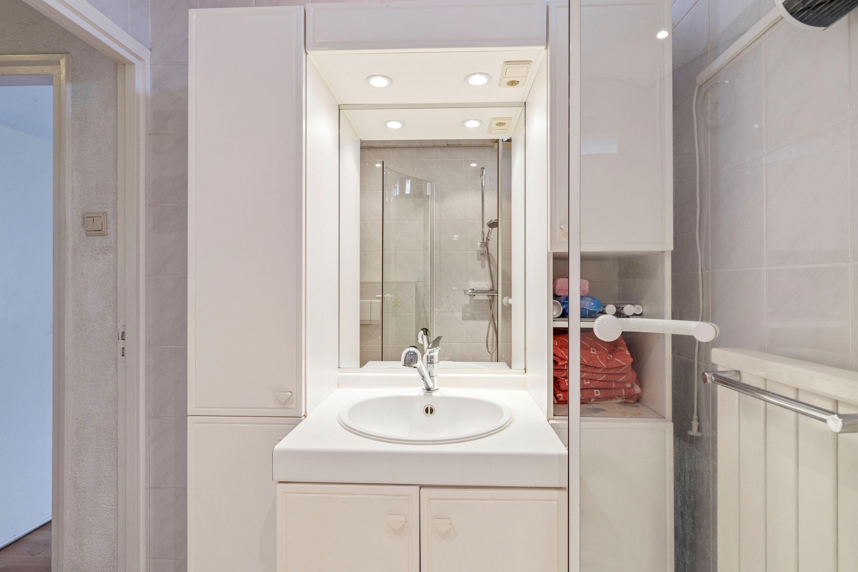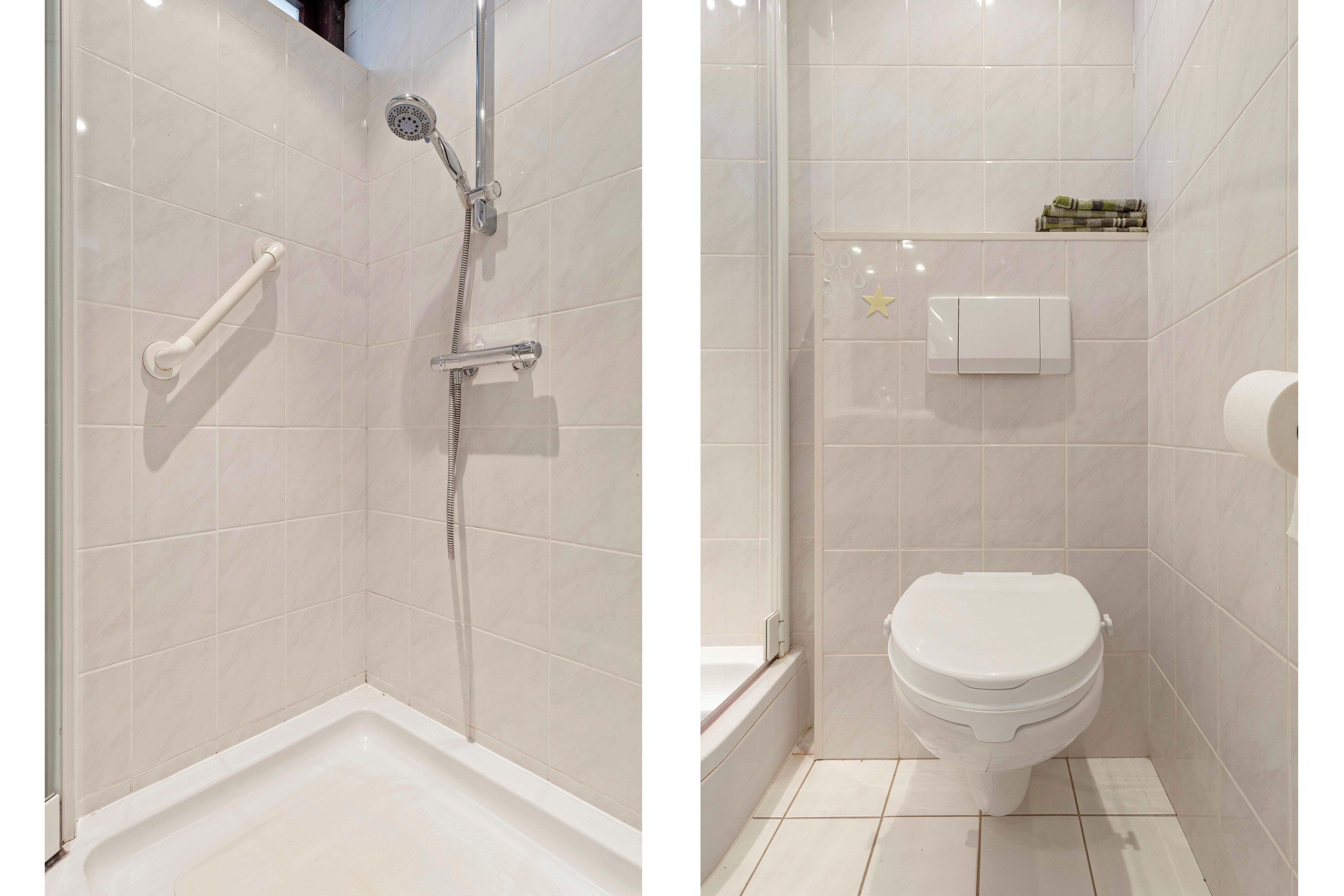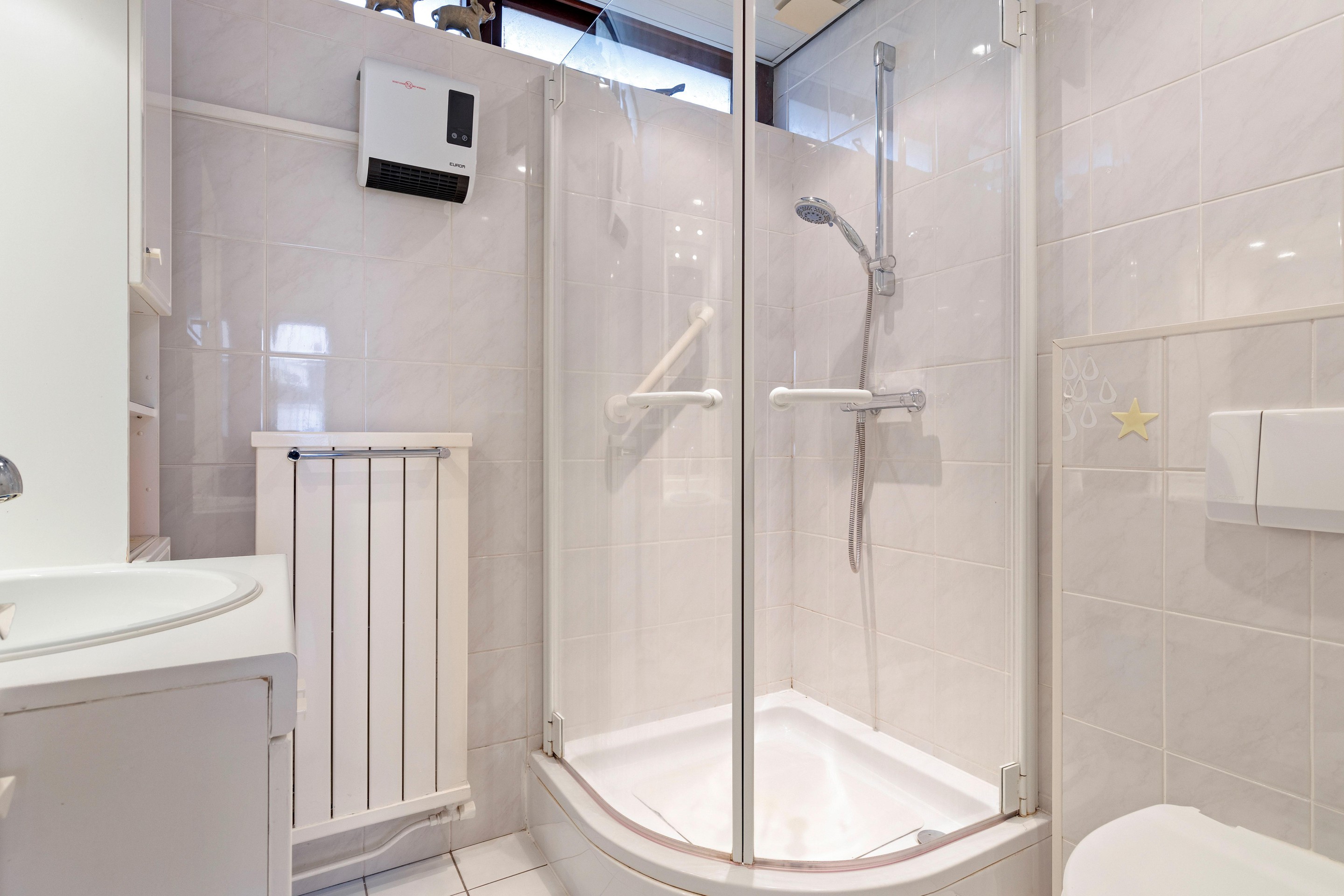 De badkamer is volledig betegeld en uitgerust met een douchecabine met thermostaatkraan, vrijhangend toilet, wastafelmeubel, wandradiator en zowel natuurlijke als mechanische ventilatie.