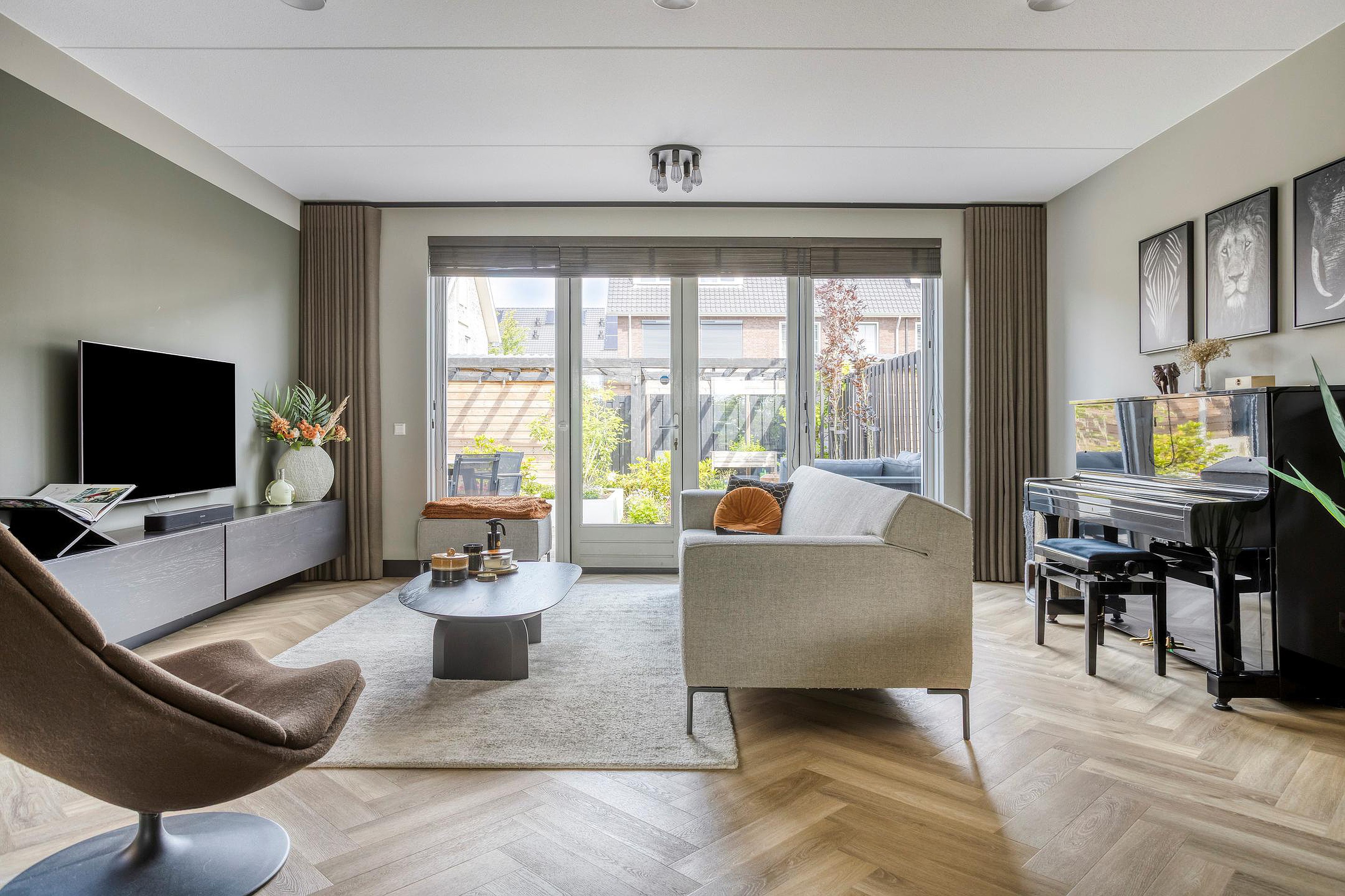 Ruime uitgebouwde tuingerichte woonkamer met trapkast en openslaande deuren naar de achtertuin.