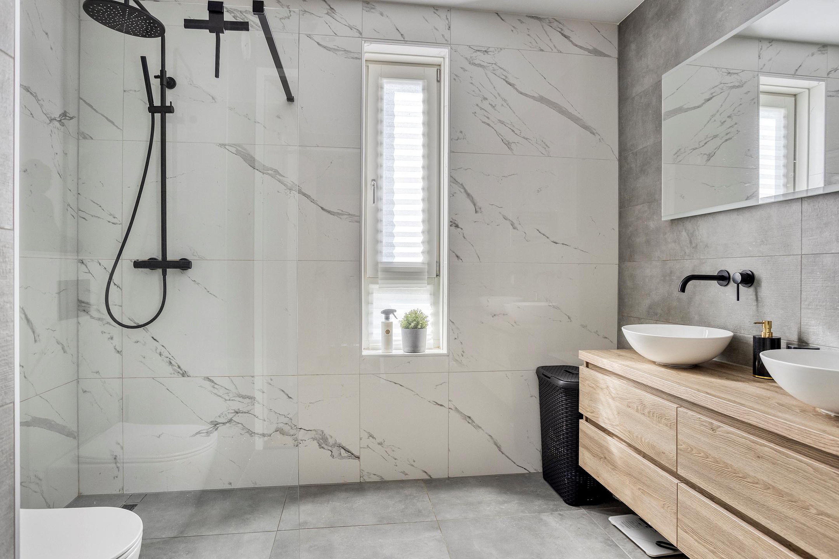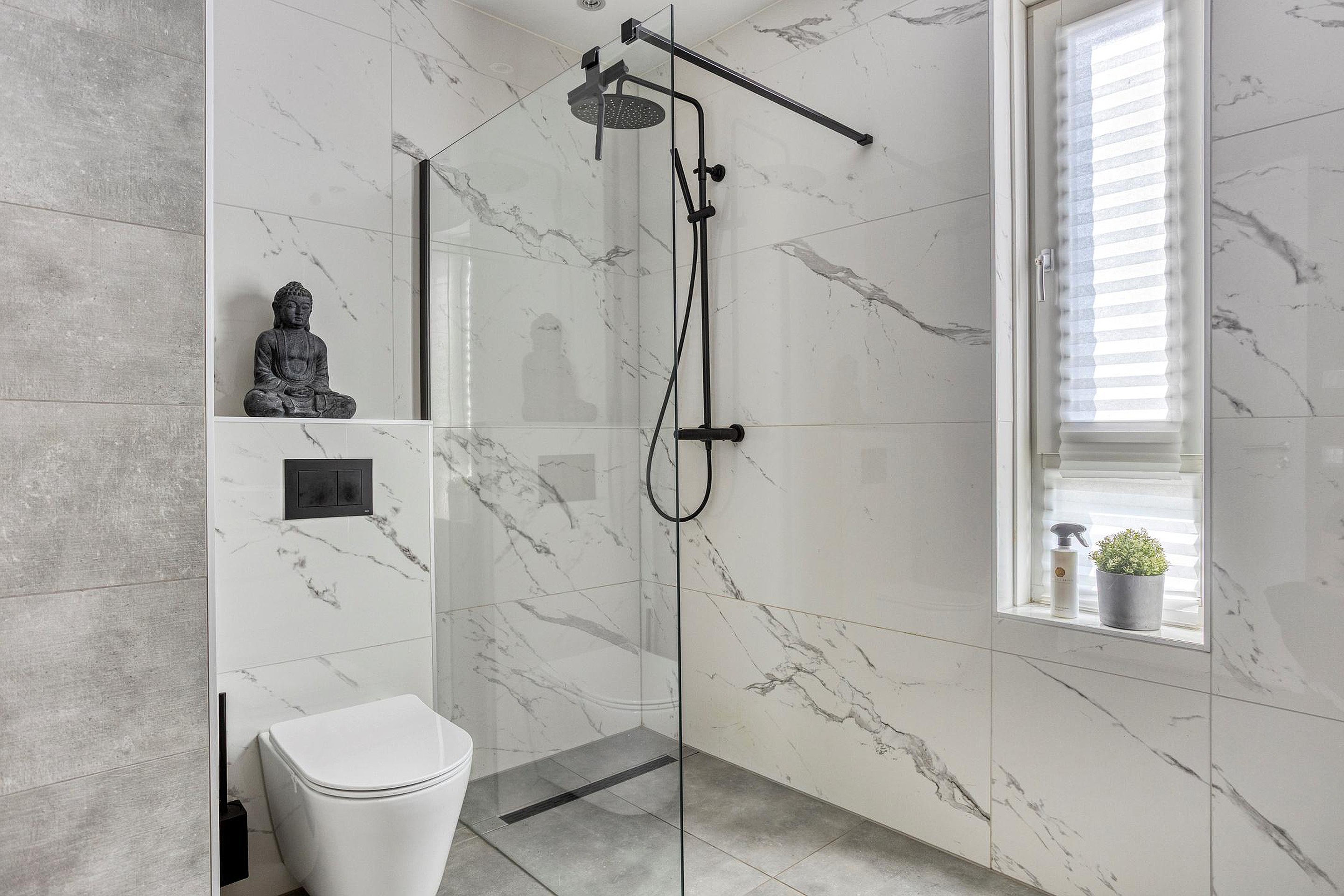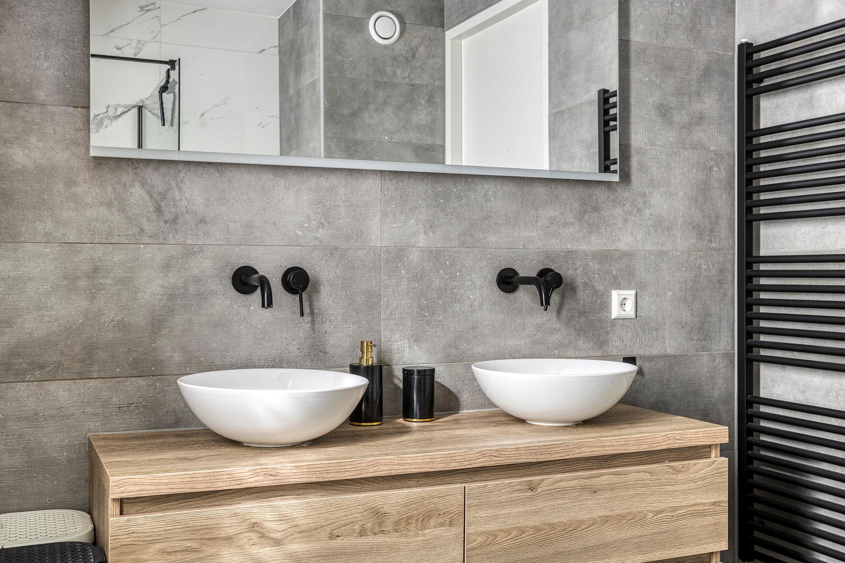 Luxe uitgevoerde badkamer met toilet, inloopdouche en badmeubel met dubbele wastafel.
