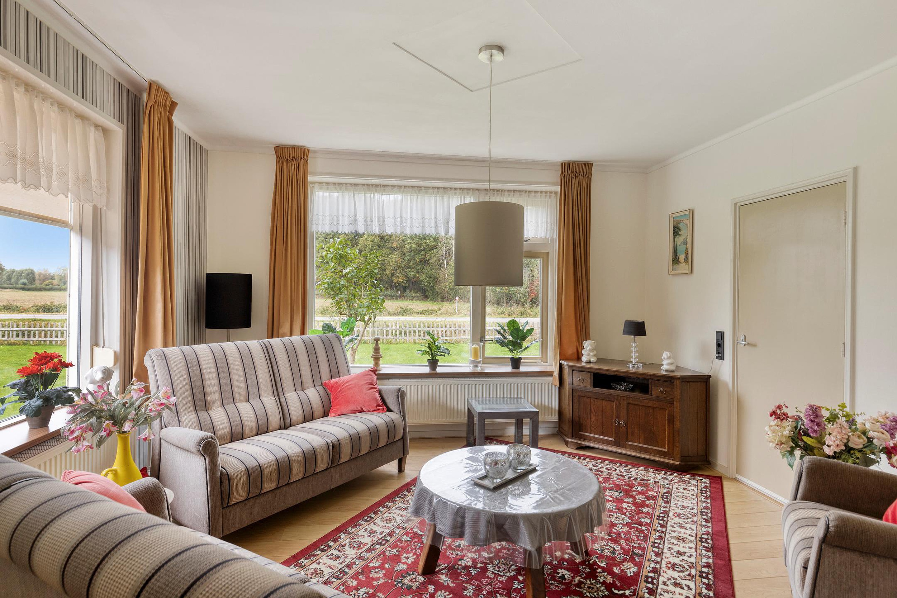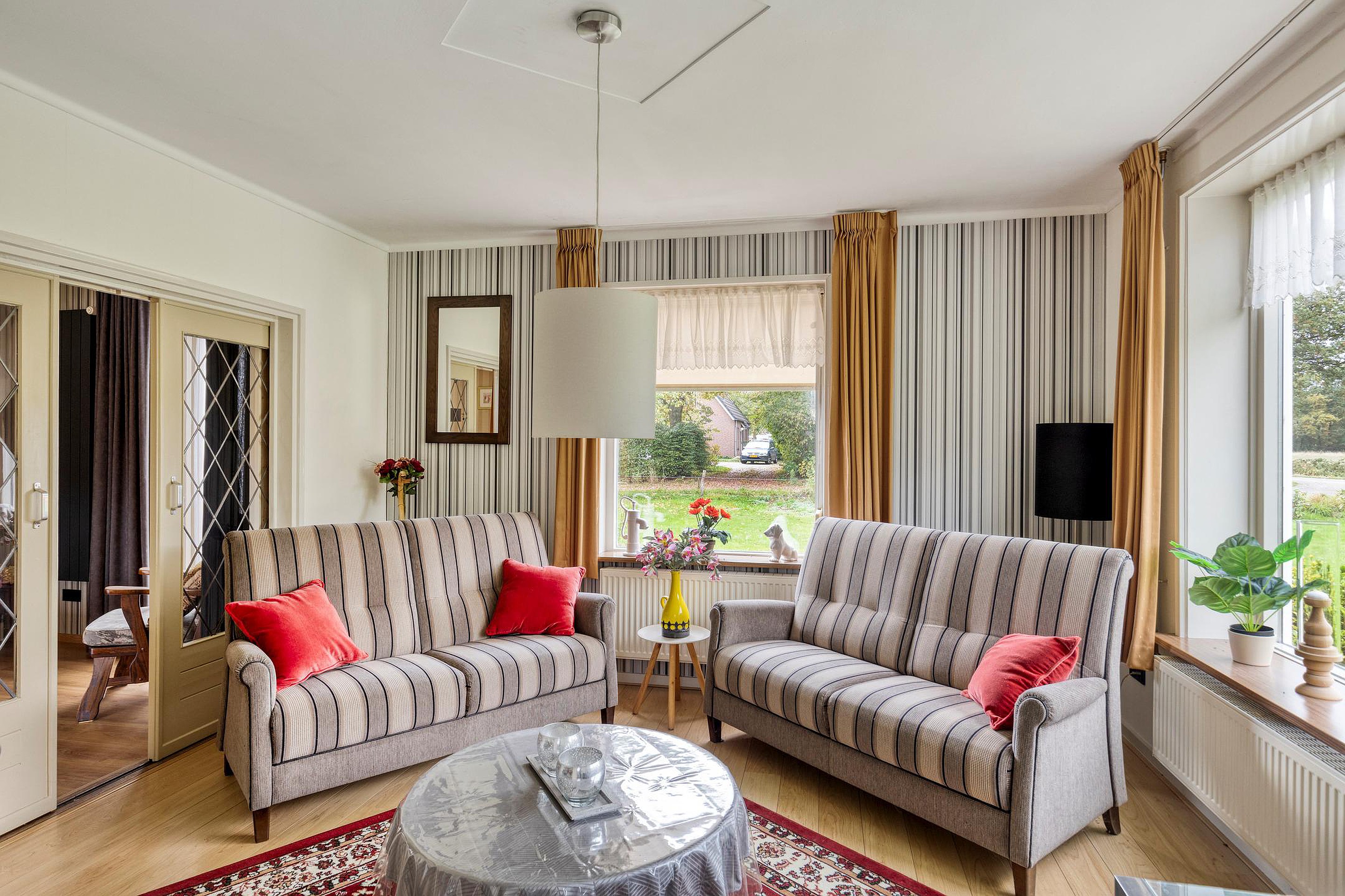 Woonkamer-en-suite met voorkamer voorzien van schouw en van hieruit prachtig vrij uitzicht. Ruime woon-/eetkamer met vaste kast, rookkanaal met houtkachel en tuindeur naar terras.