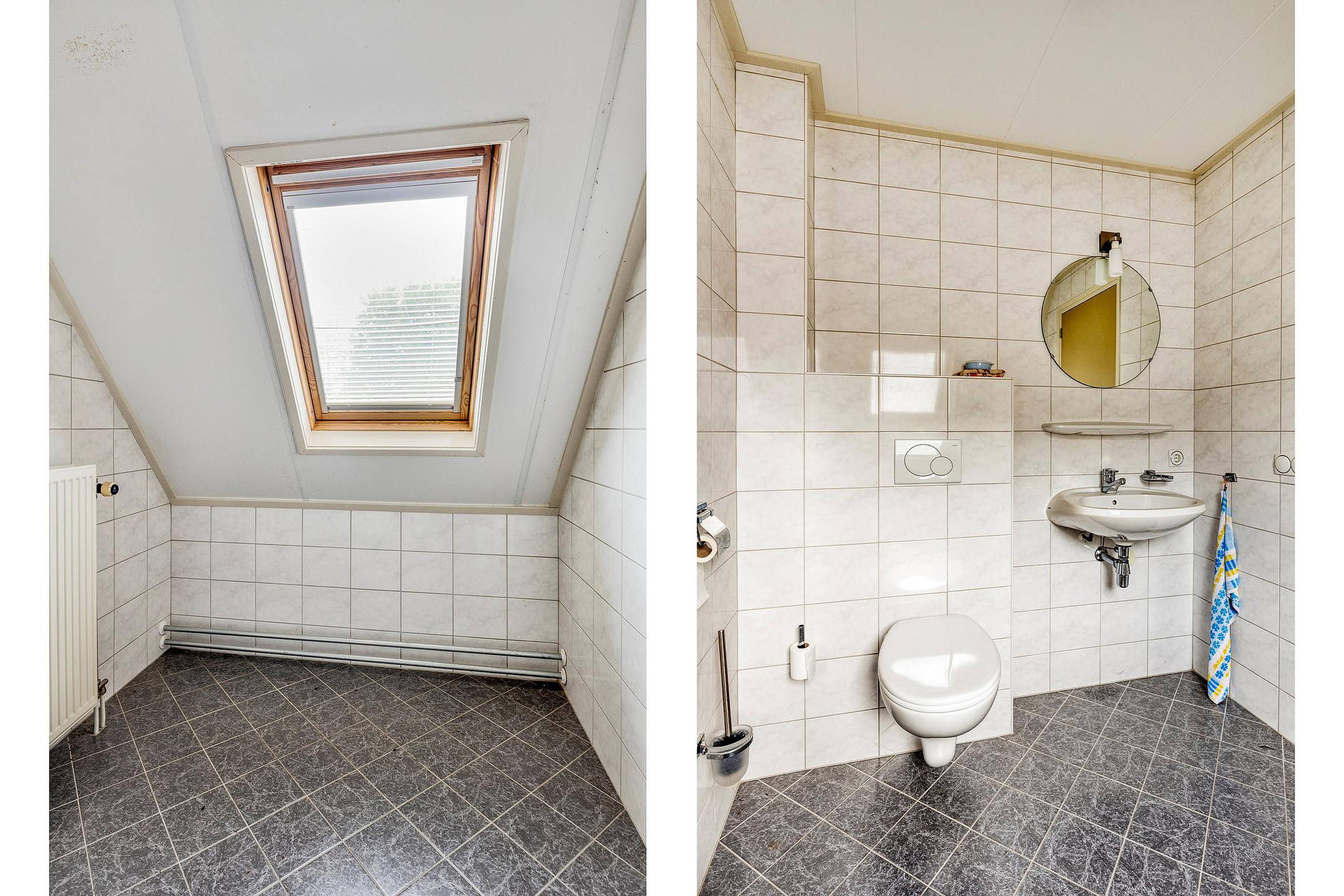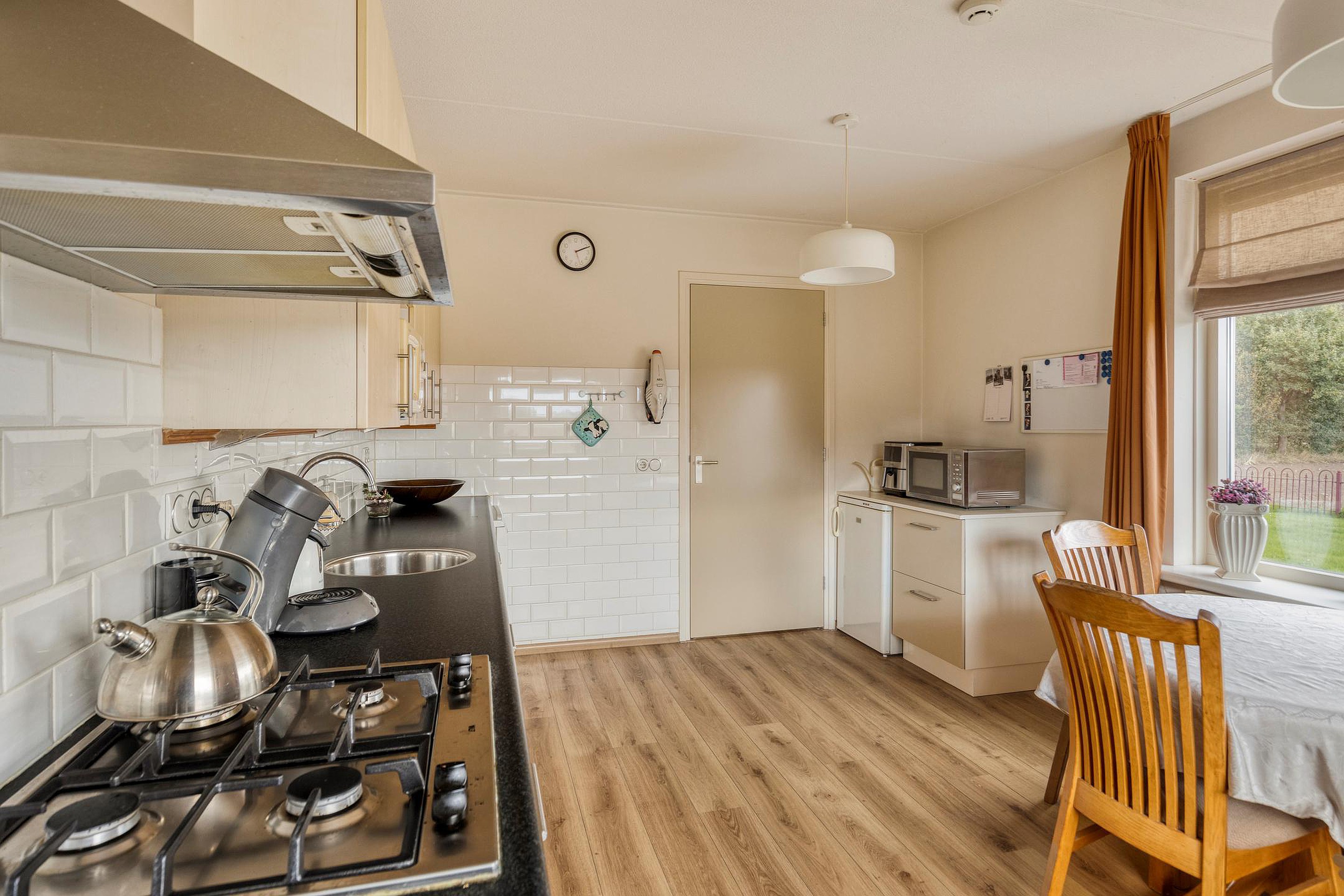 Woonkeuken met aanrechtblok voorzien van inbouwapparatuur. Achter-entree met ruime vaste kast. Bijkeuken met CV-opstelling (Remeha, 2020), wasmachine- en drogeraansluitingen en uitstortgootsteen. Ruime badkamer met inloopdouche, wastafel, toilet en urinoir.