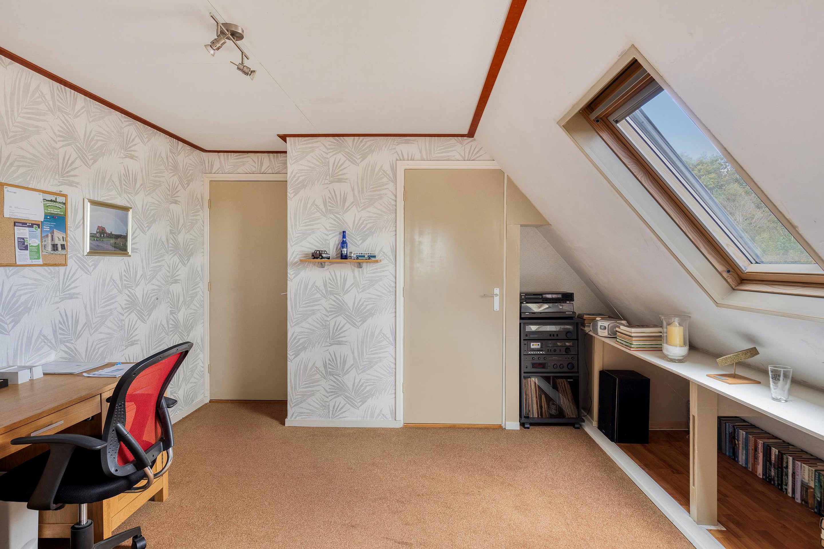 1e Verdieping: overloop met vaste kast, slaapkamer aan voorzijde met vaste kast. Ruime en lichte slaap-/werkkamer met vaste kast en groot dakraam. Hoofdslaapkamer aan achterzijde met aangrenzend ruim toilet met hangend closet en wastafel. Overloop met bergruimte.