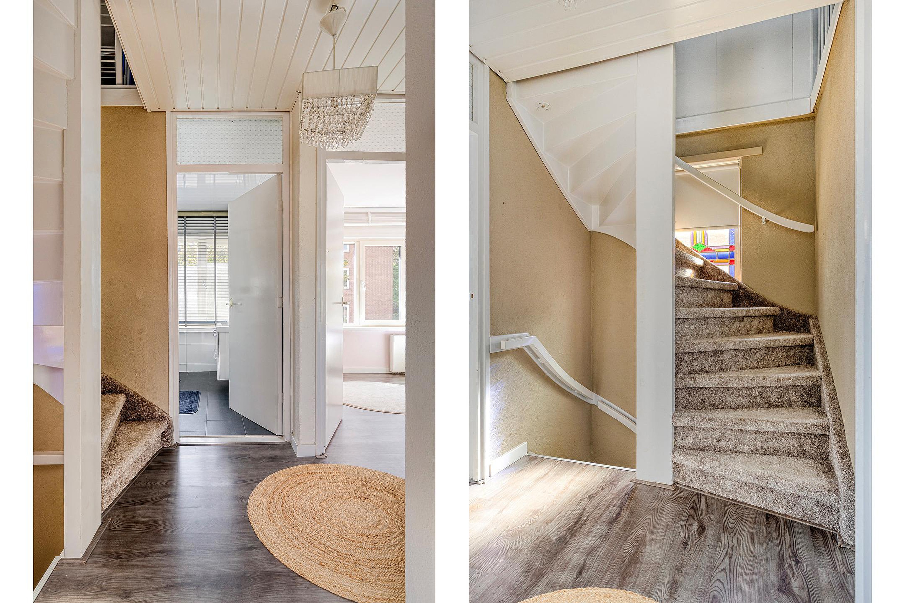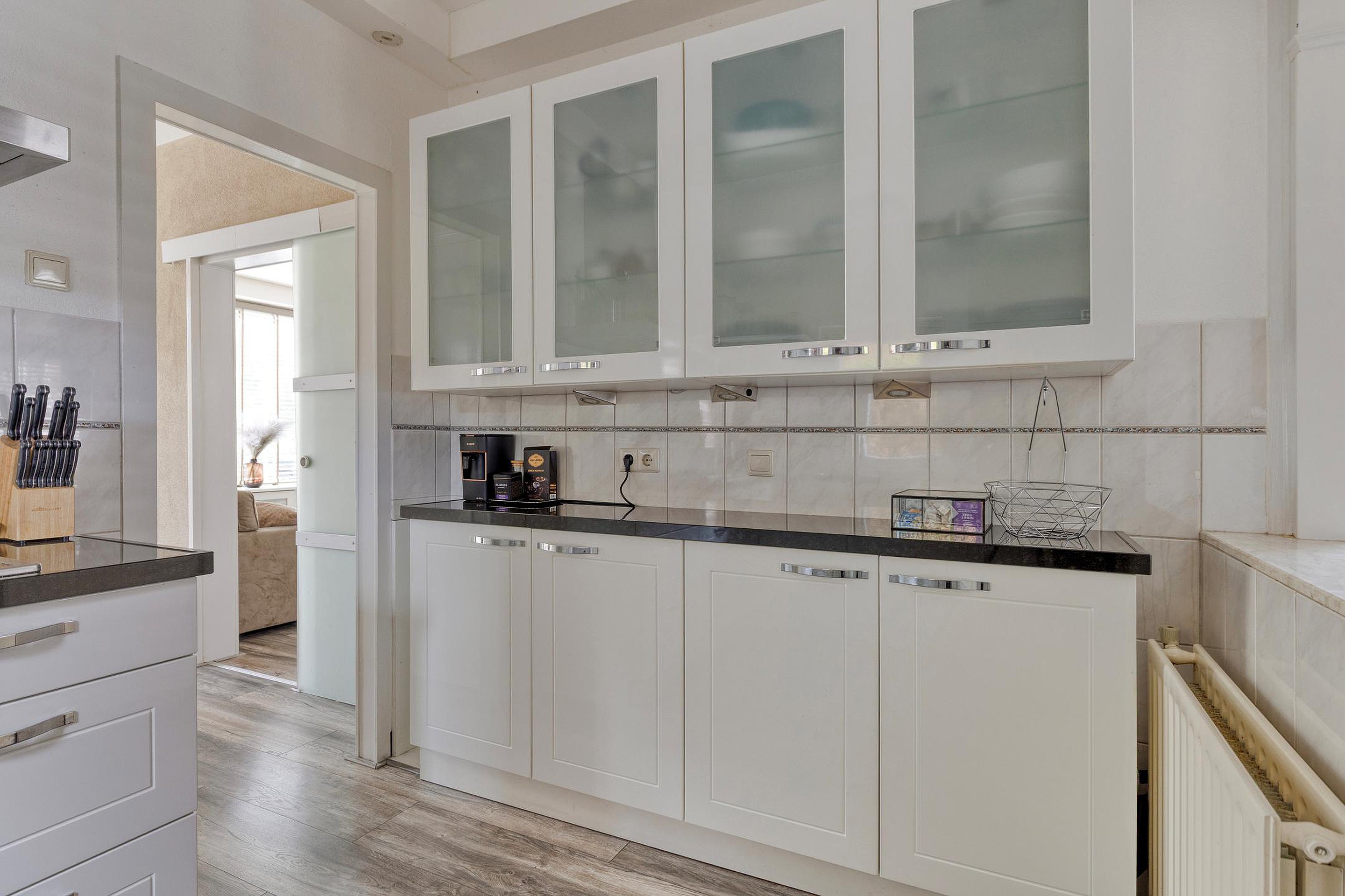 Via de entree kom je in de hal met trapkast, meterkast en trapopgang naar de eerste verdieping. Ook bevindt zich hier een eenvoudige toiletruimte. De sfeervolle uitgebouwde woonkamer is voorzien van een lichtkoepel en schuifpui naar de tuin. De dichte keuken is uitgerust met diverse inbouwapparatuur, waaronder een 5-pits gaskookplaat, combi-magnetron, koelkast, vaatwasser en afzuigkap. Aansluitend vind je de bijkeuken met wastafel, wasmachineaansluiting en opstelplaats voor de HR combi-ketel.
