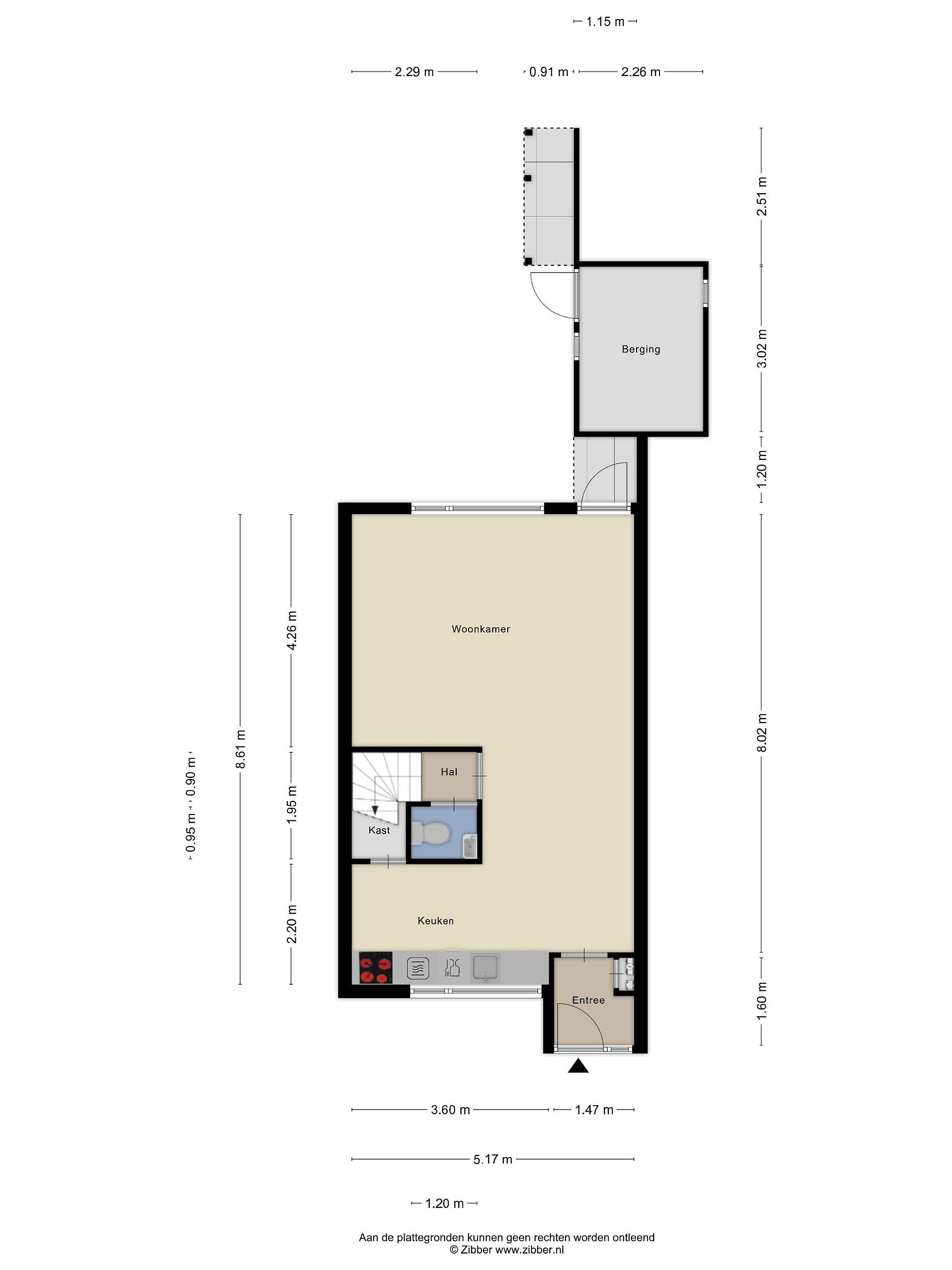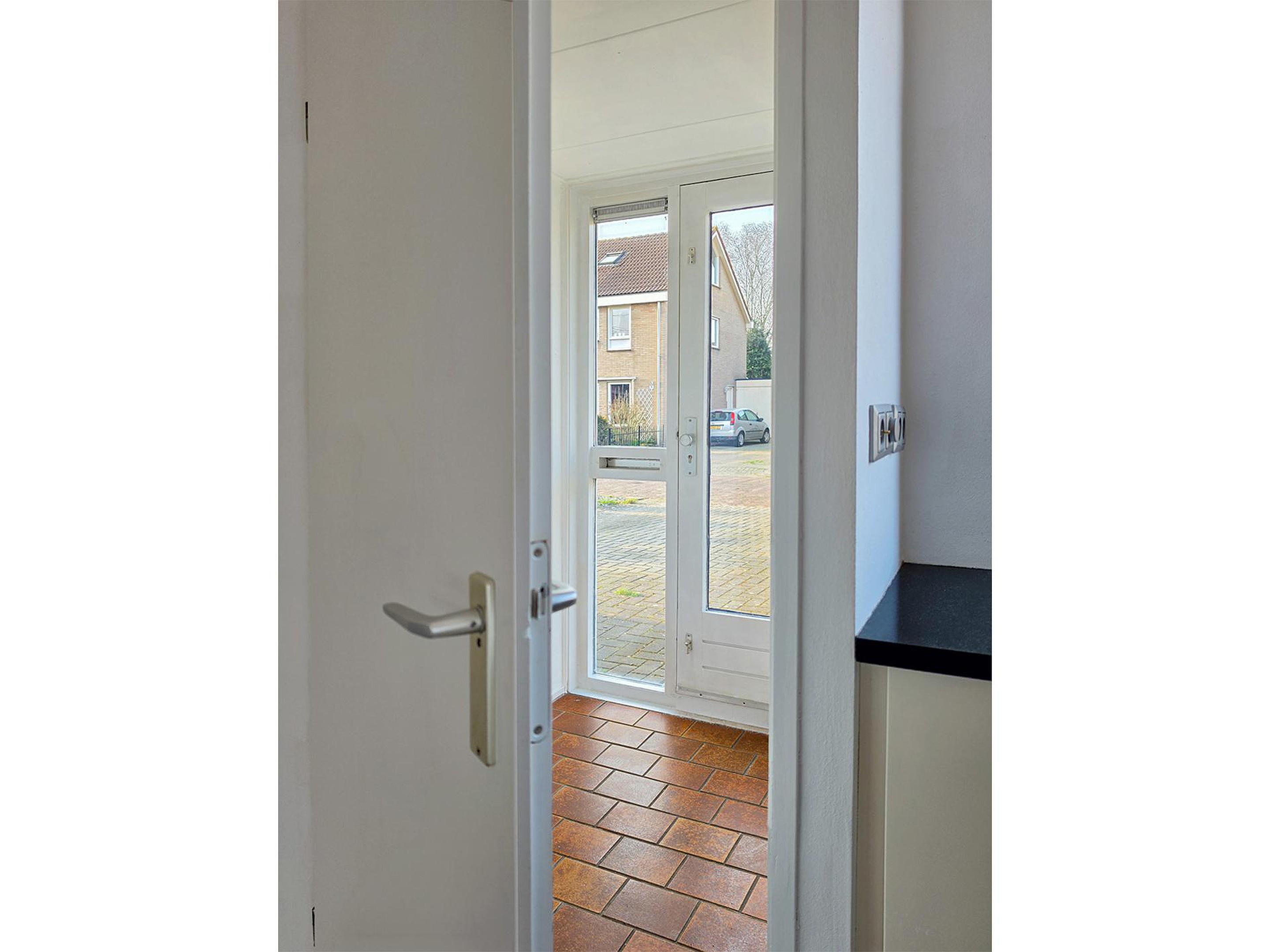 Tochtportaal/hal, toegang tot de doorzonwoonkamer met open keuken en keldertrapkast.