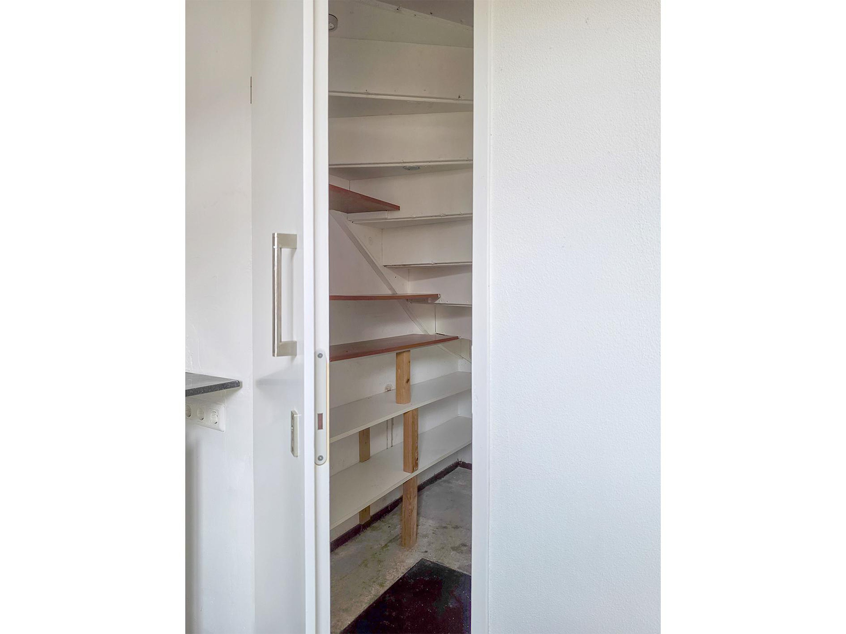In de breedte van de overloop is een bergruimte gecreëerd, afgesloten met een schuifwand.
