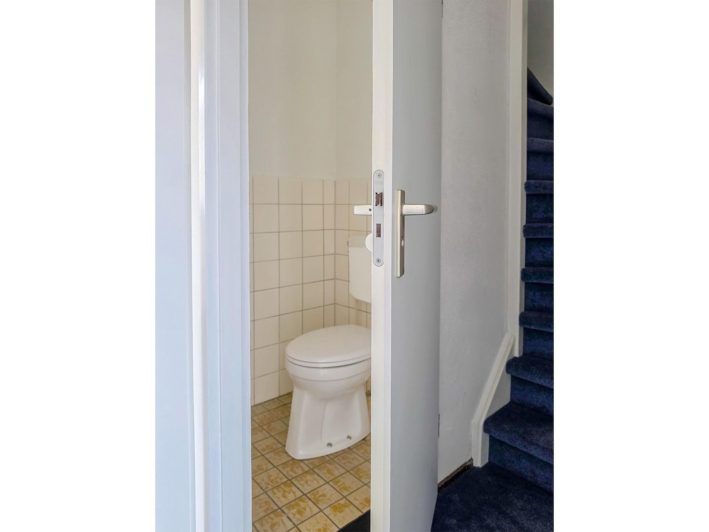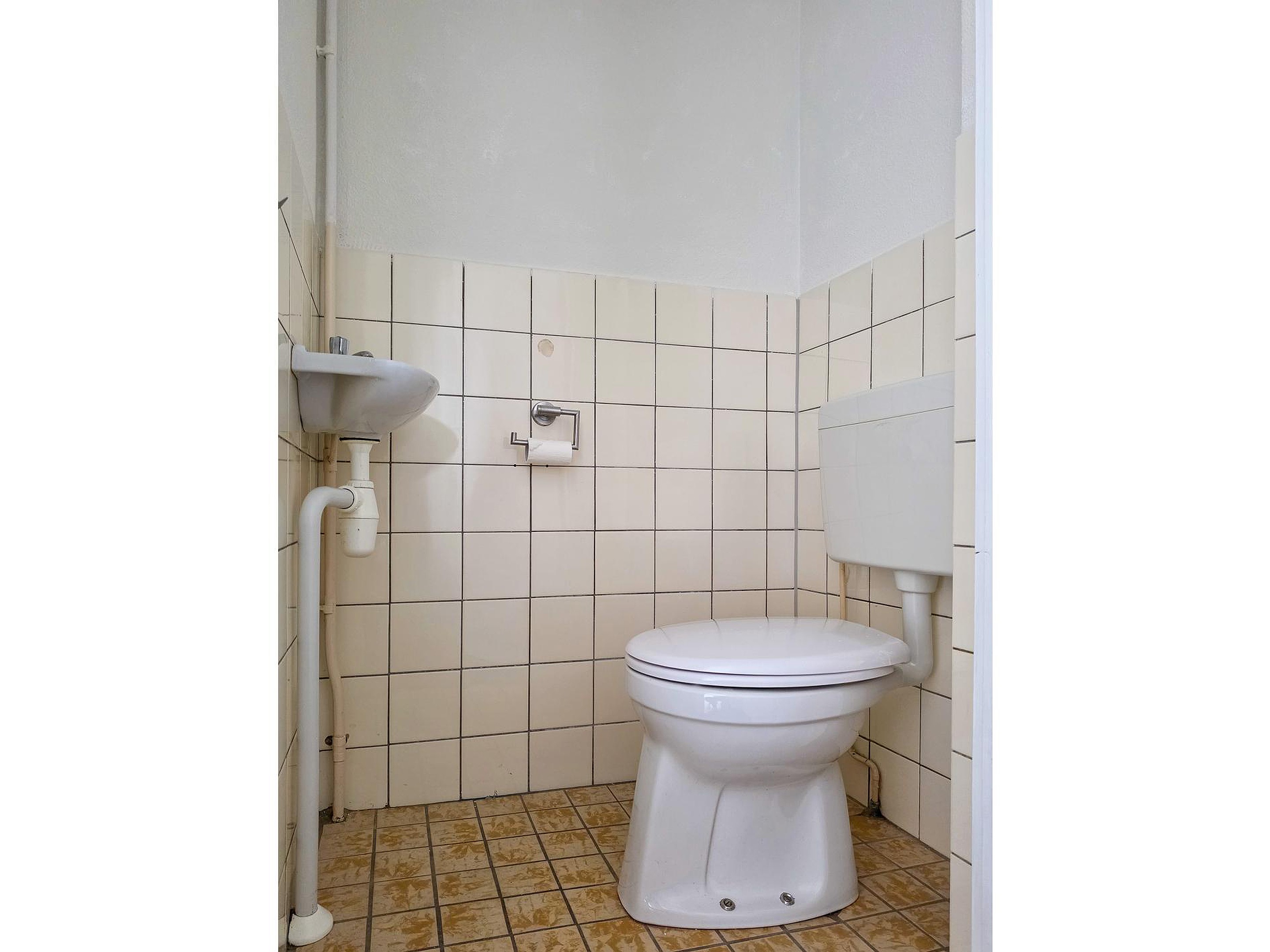 Afgesloten halletje waaraan toilet met fonteintje en trapopgang naar de eerste verdieping.
