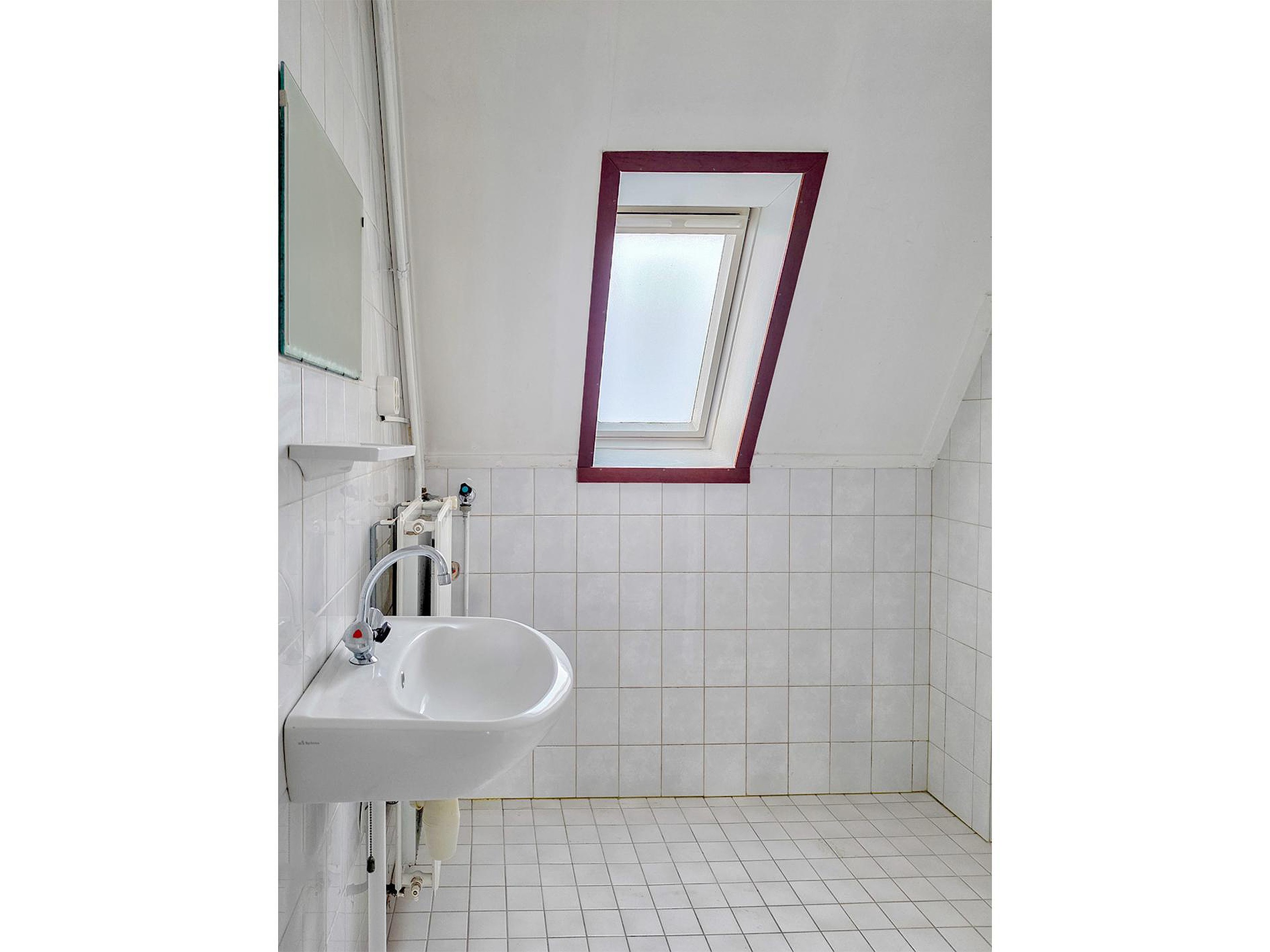 Eerste verdieping Overloop waaraan 3 slaapkamers en een badkamer met toilet, wastafel en douchte.