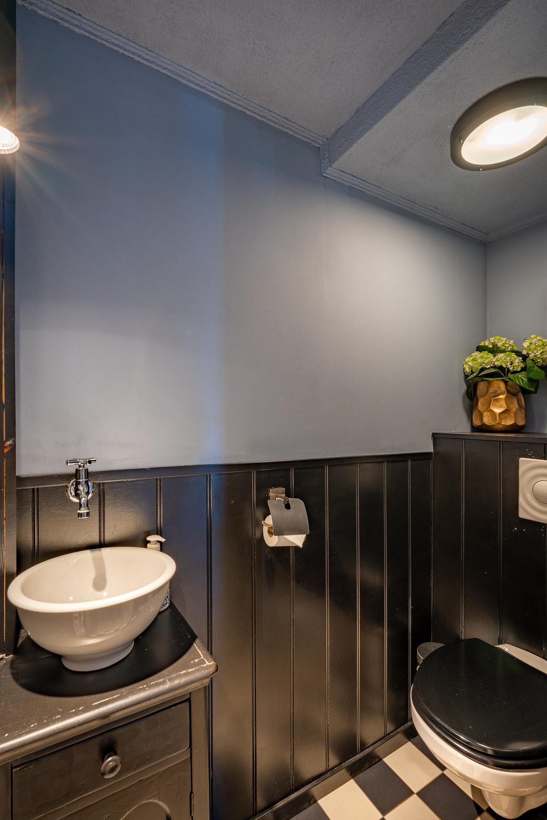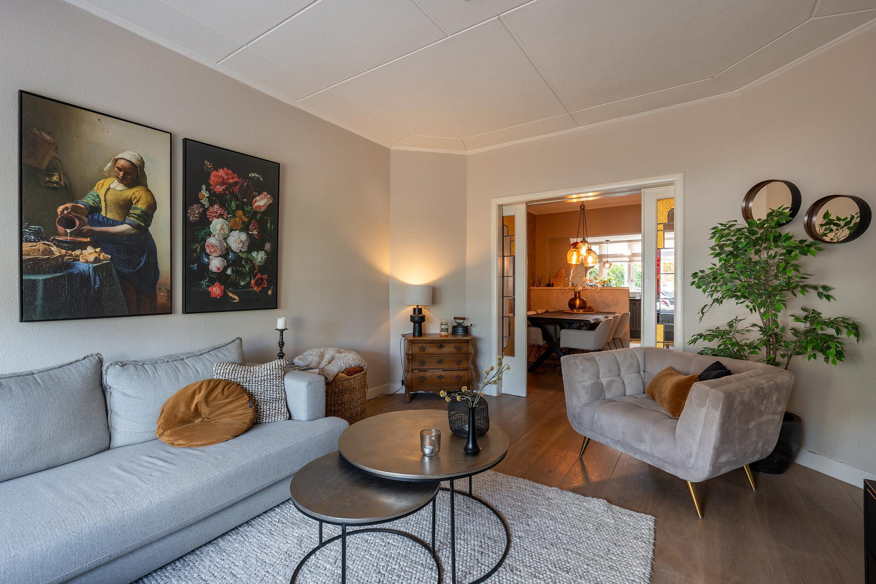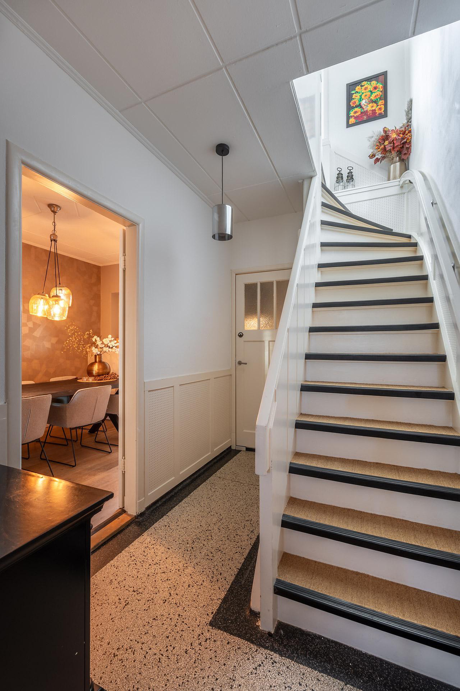 Via de hal/entree met originele granitovloer, meterkast, kelderkast, toilet en trapopgang naar de eerste etage komt u in de lichte woon- en eetkamer met parketvloer. De sfeervolle ensuite-deuren met glas-in-lood zorgen voor een mooie verbinding tussen de twee ruimtes. De open keuken is o.a. voorzien van een 6-pits gaskookplaat, magnetron/oven, vaatwasser, afzuigkap, koelkast en stijlvol terrazzo werkblad. Achter de keuken bevindt zich de bijkeuken met witgoedaansluitingen, welke keurig zijn weggewerkt achter een vaste kast.