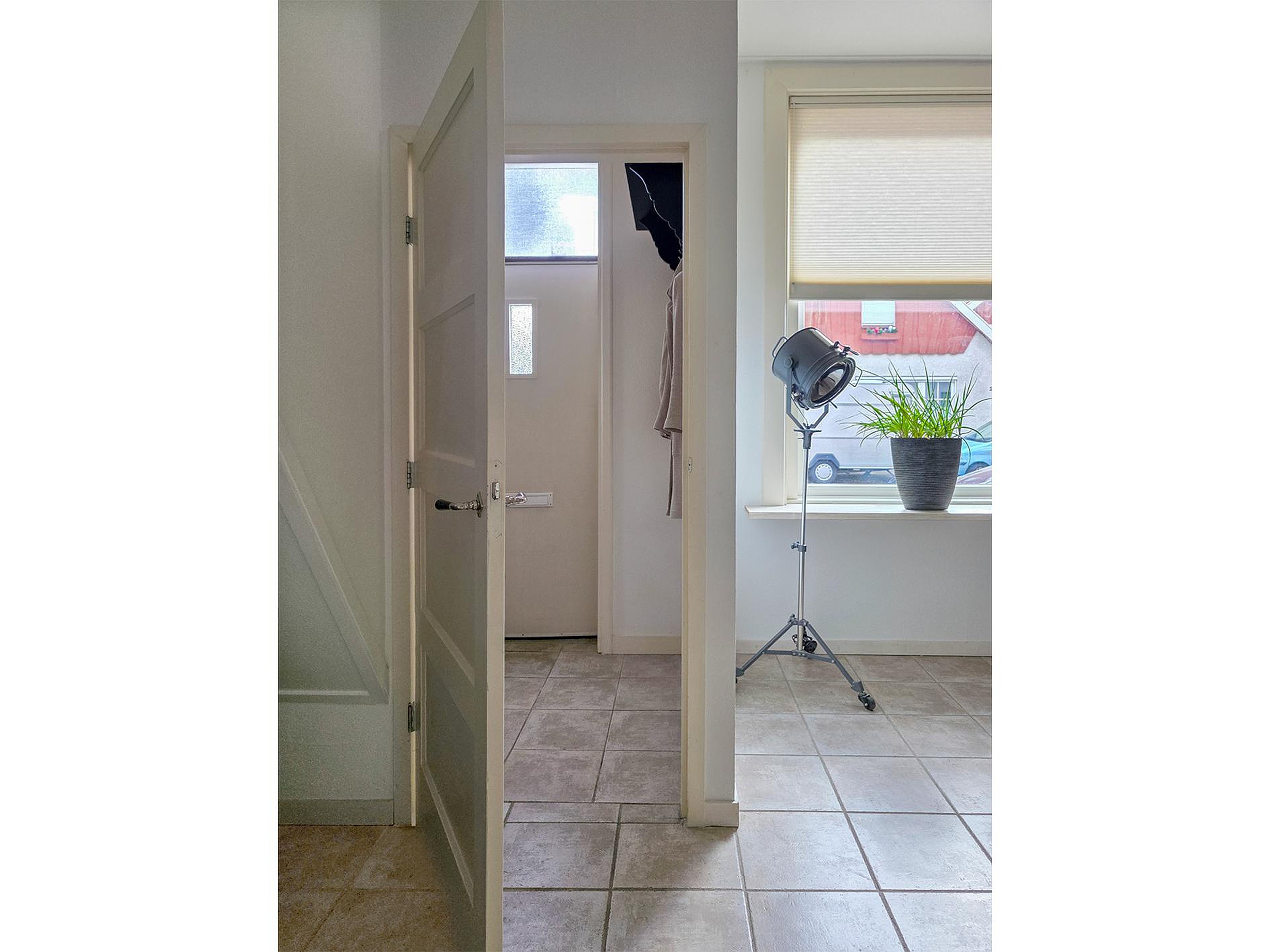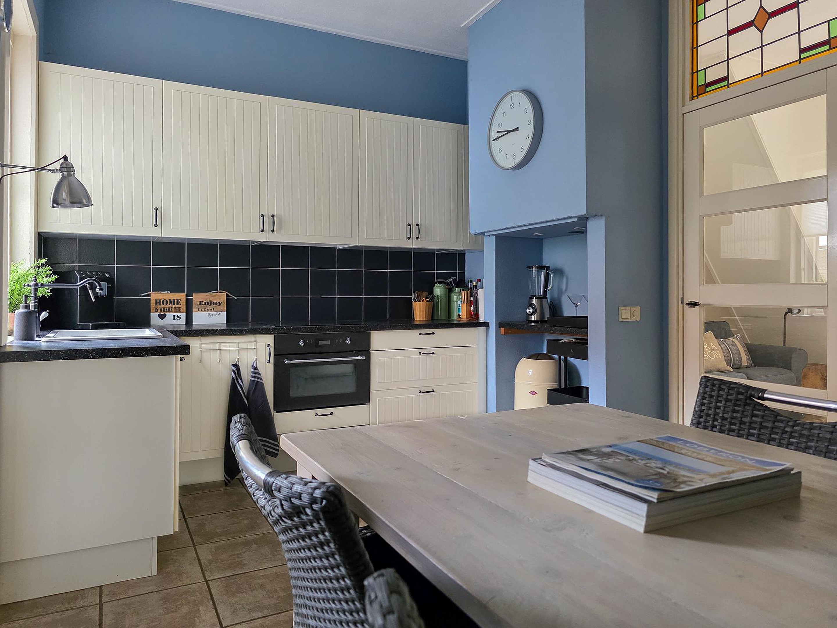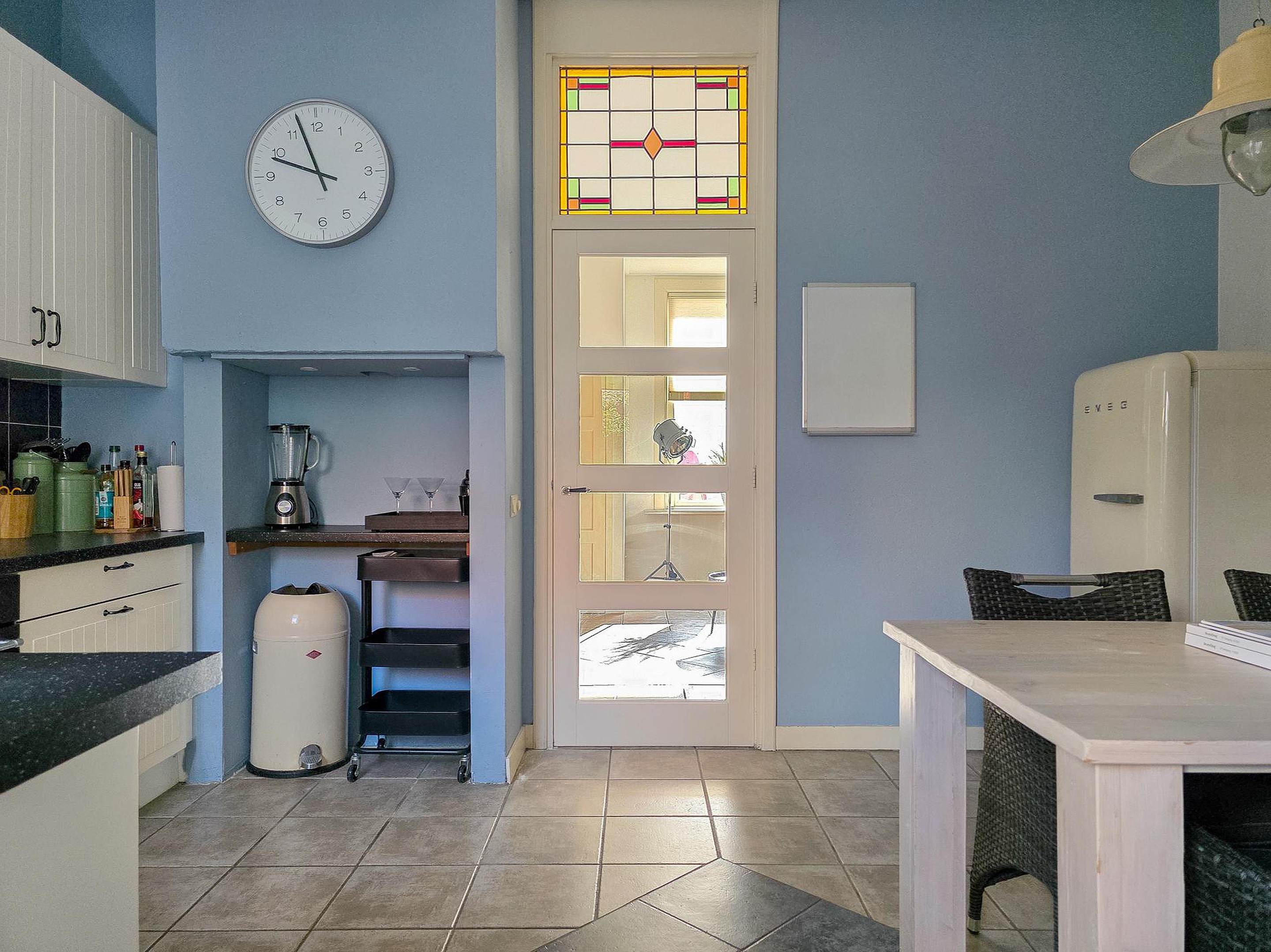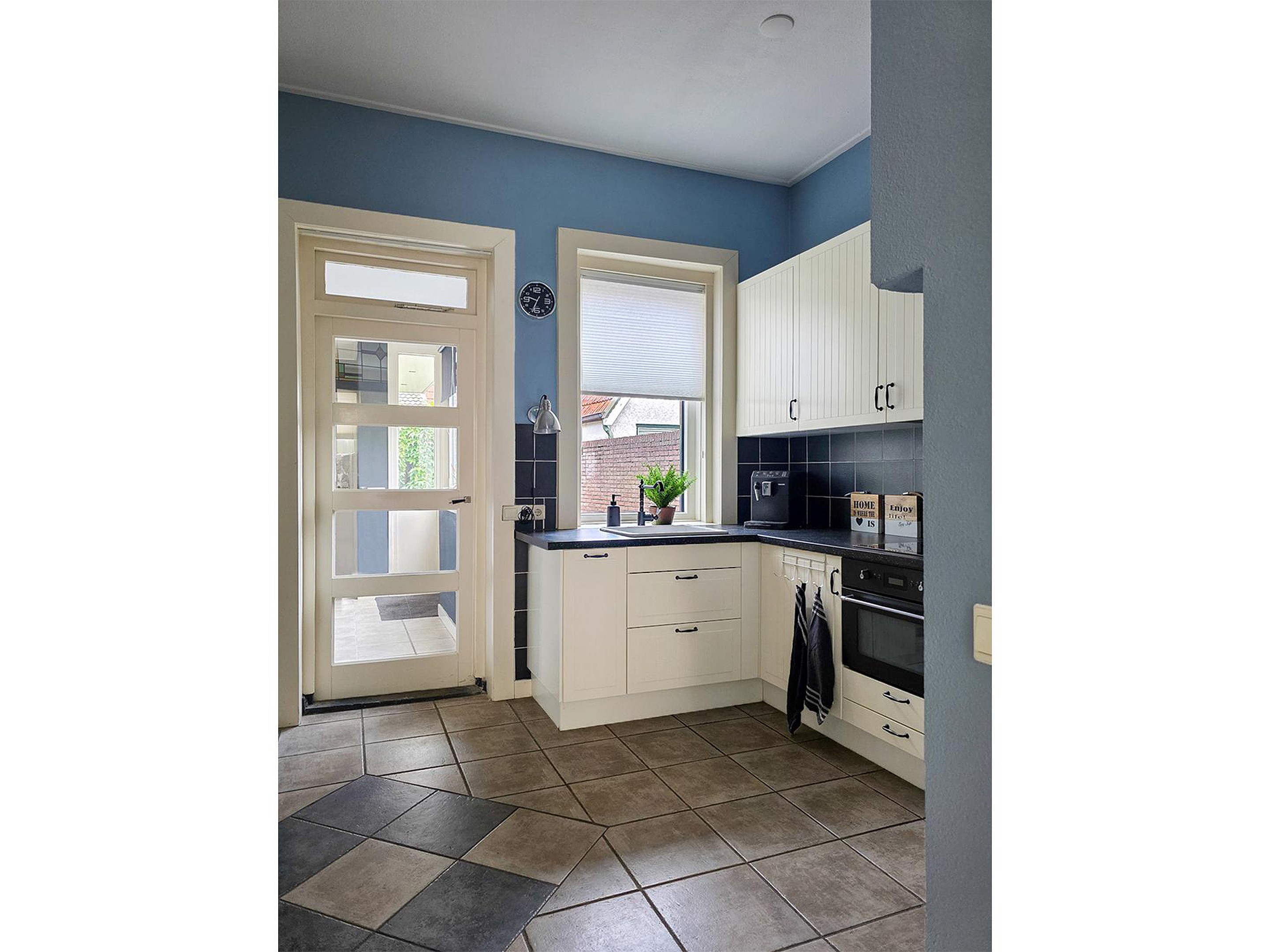 Toegang tot de knusse woonkamer, vervolgens de keuken met inbouwapparatuur en in het verlengde de bijkeuken met wasmachine- en drogeropstelling, waaraan de stookruimte, toiletruimte met wandcloset en fonteintje en vervolgens de badkamer met wastafel, ligbad en separate douche. Tevens geeft het toegang tot de tuin.