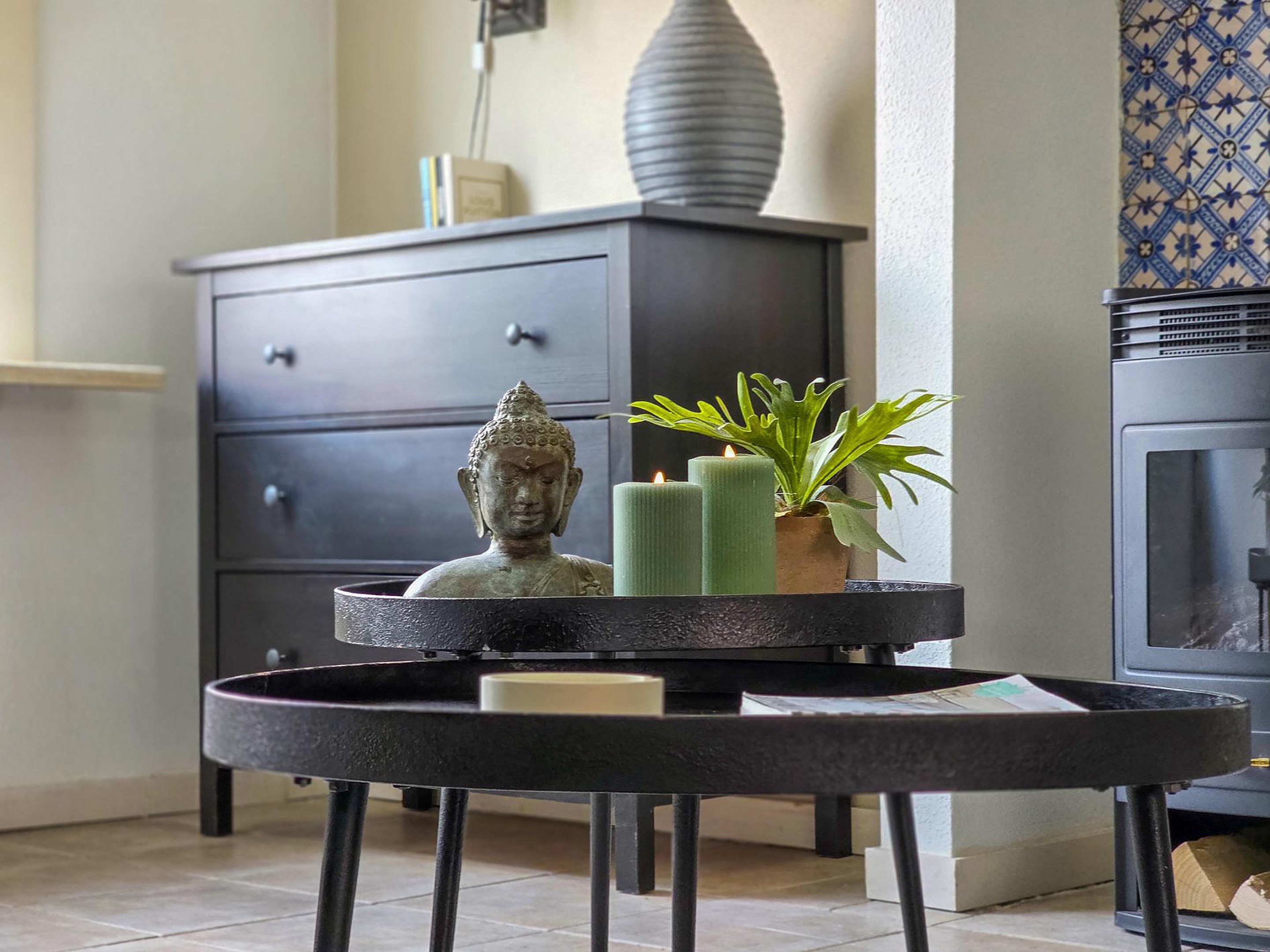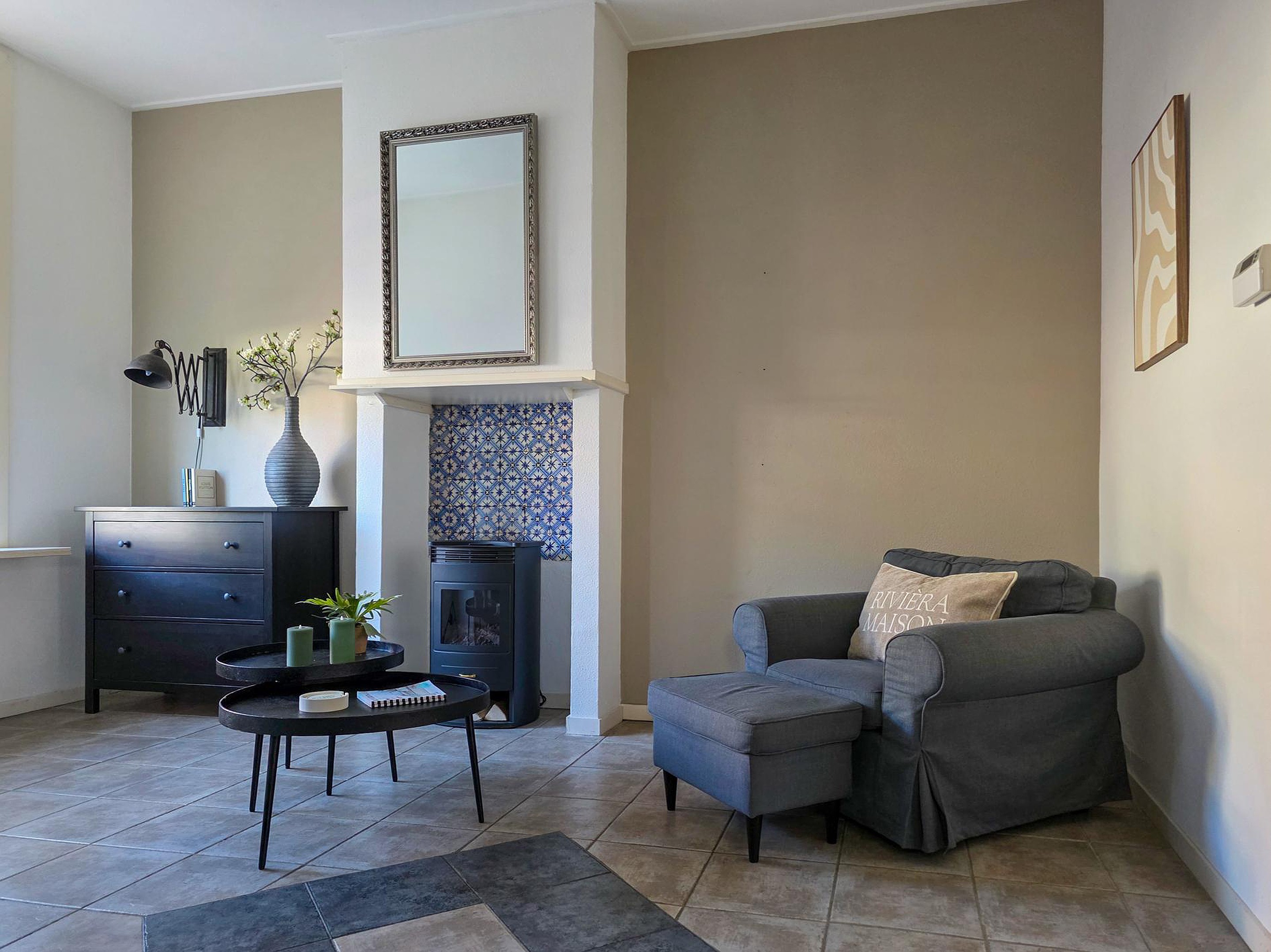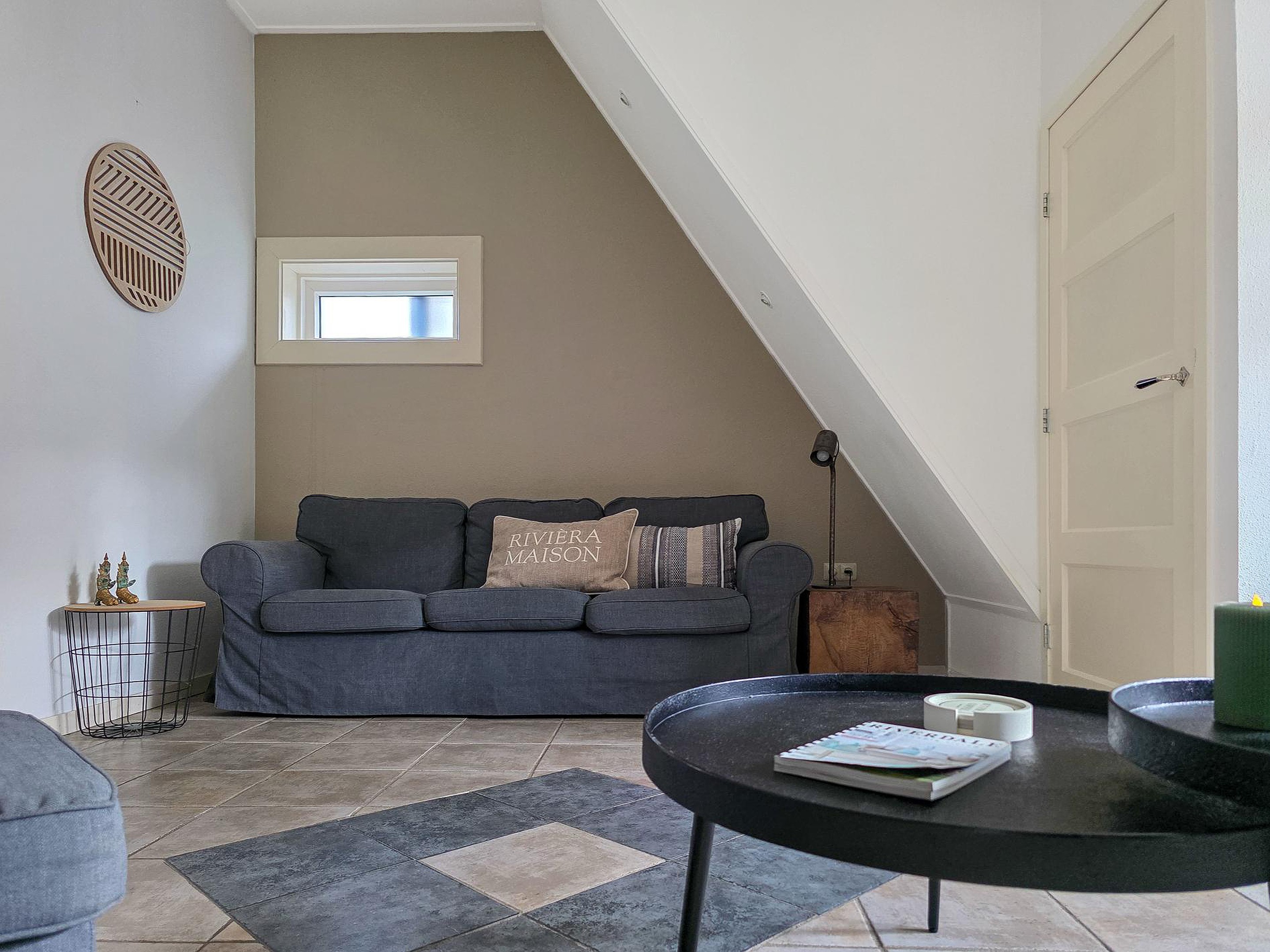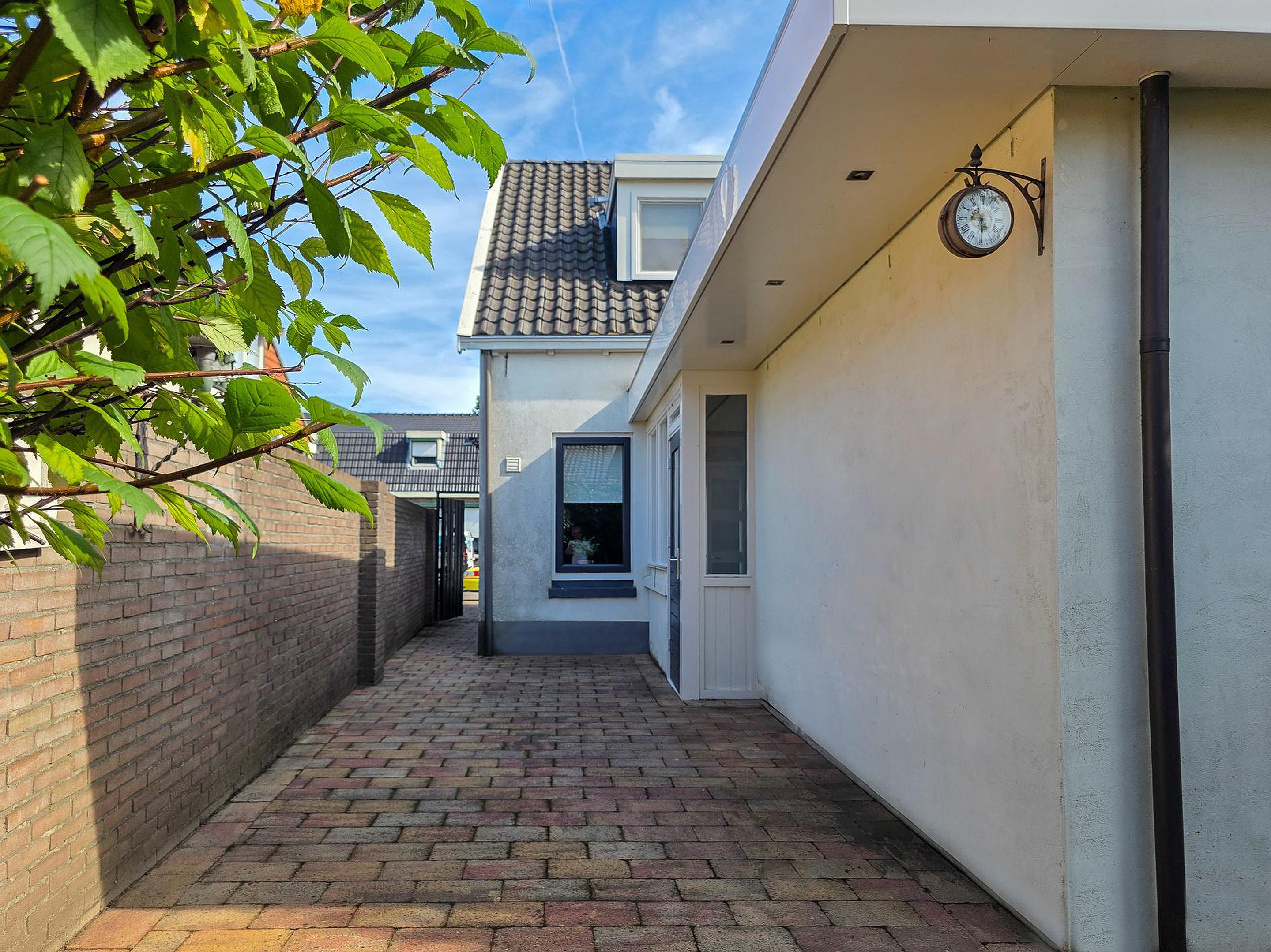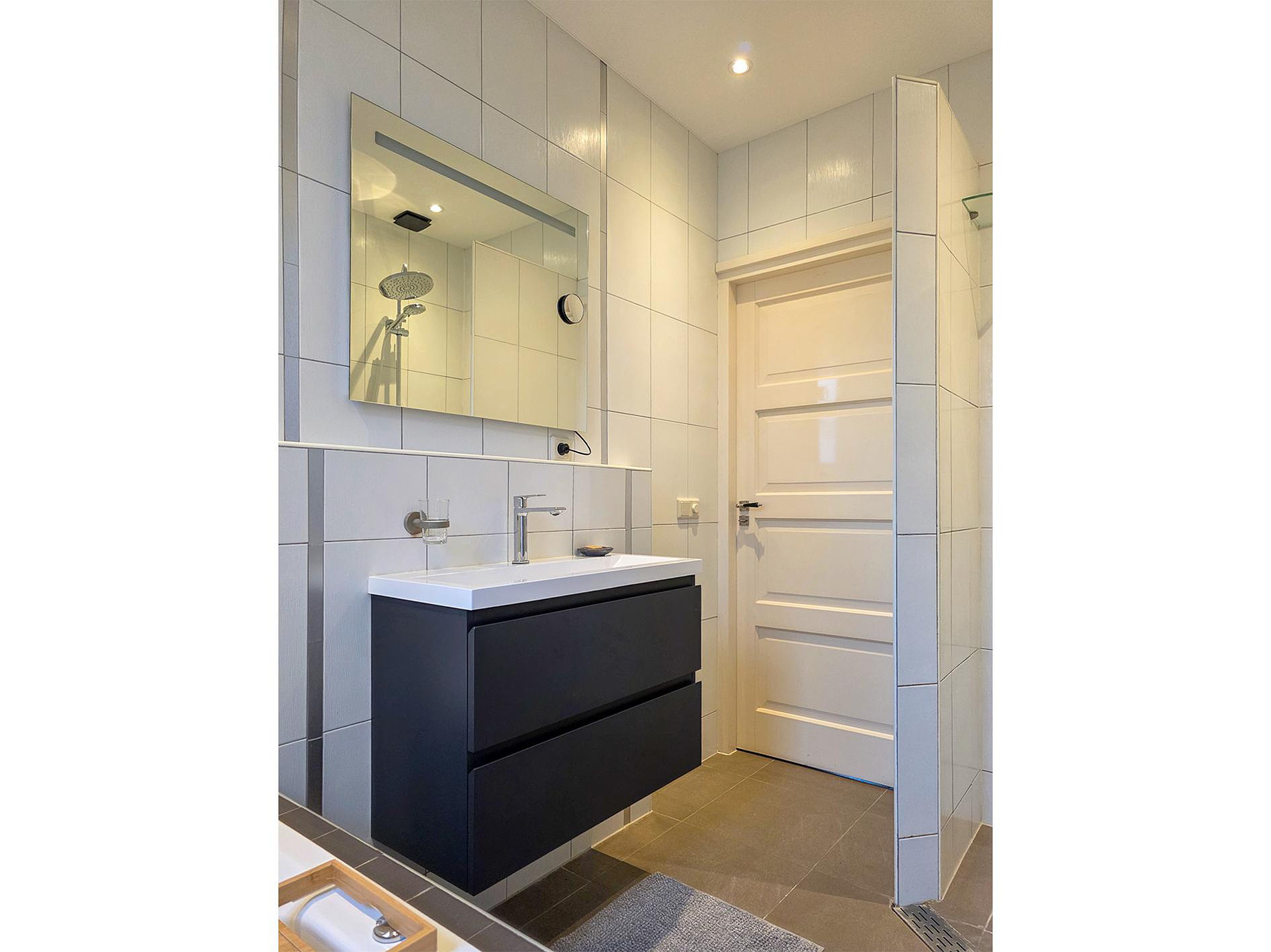Toegang tot de knusse woonkamer, vervolgens de keuken met inbouwapparatuur en in het verlengde de bijkeuken met wasmachine- en drogeropstelling, waaraan de stookruimte, toiletruimte met wandcloset en fonteintje en vervolgens de badkamer met wastafel, ligbad en separate douche. Tevens geeft het toegang tot de tuin.