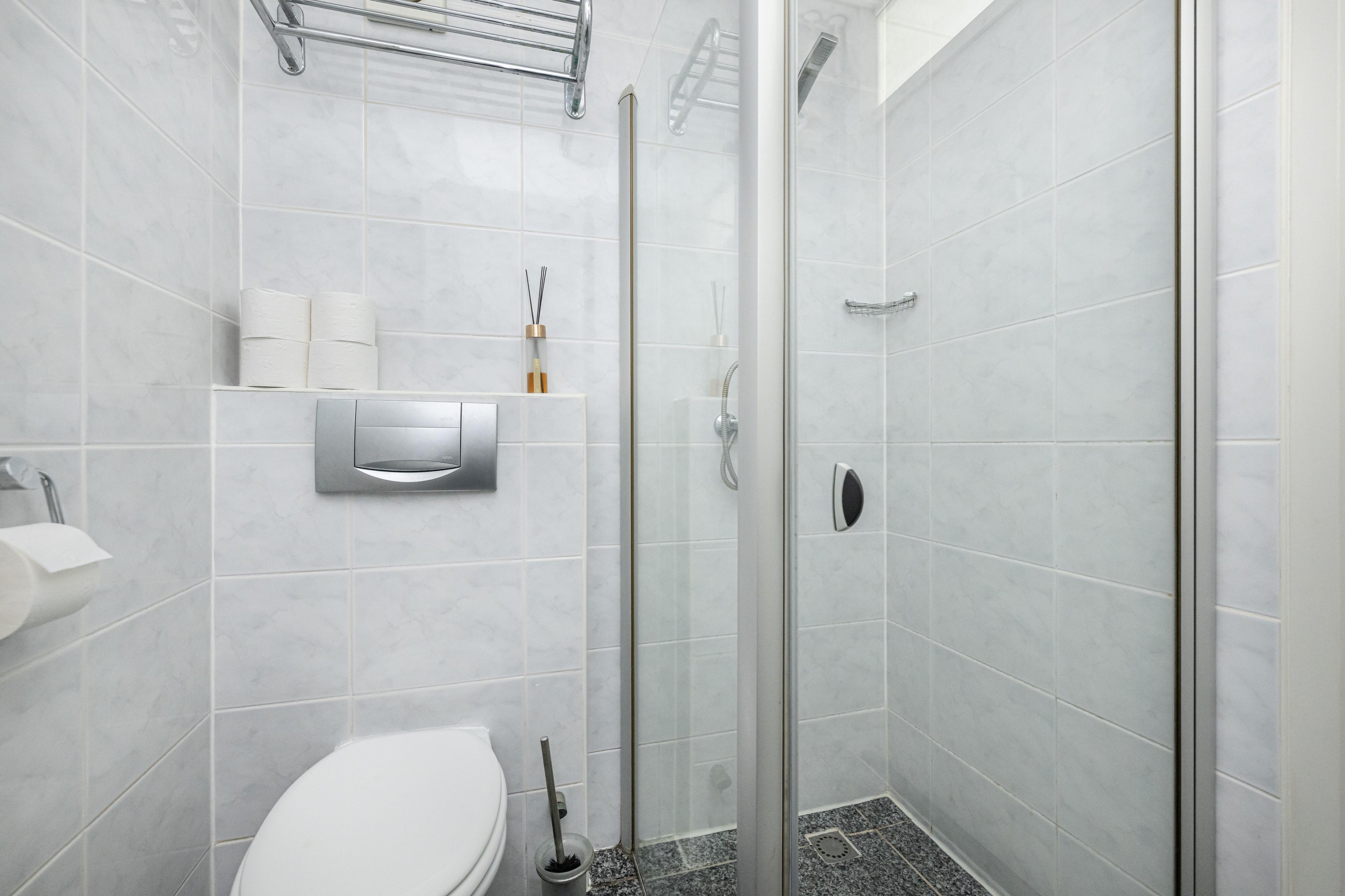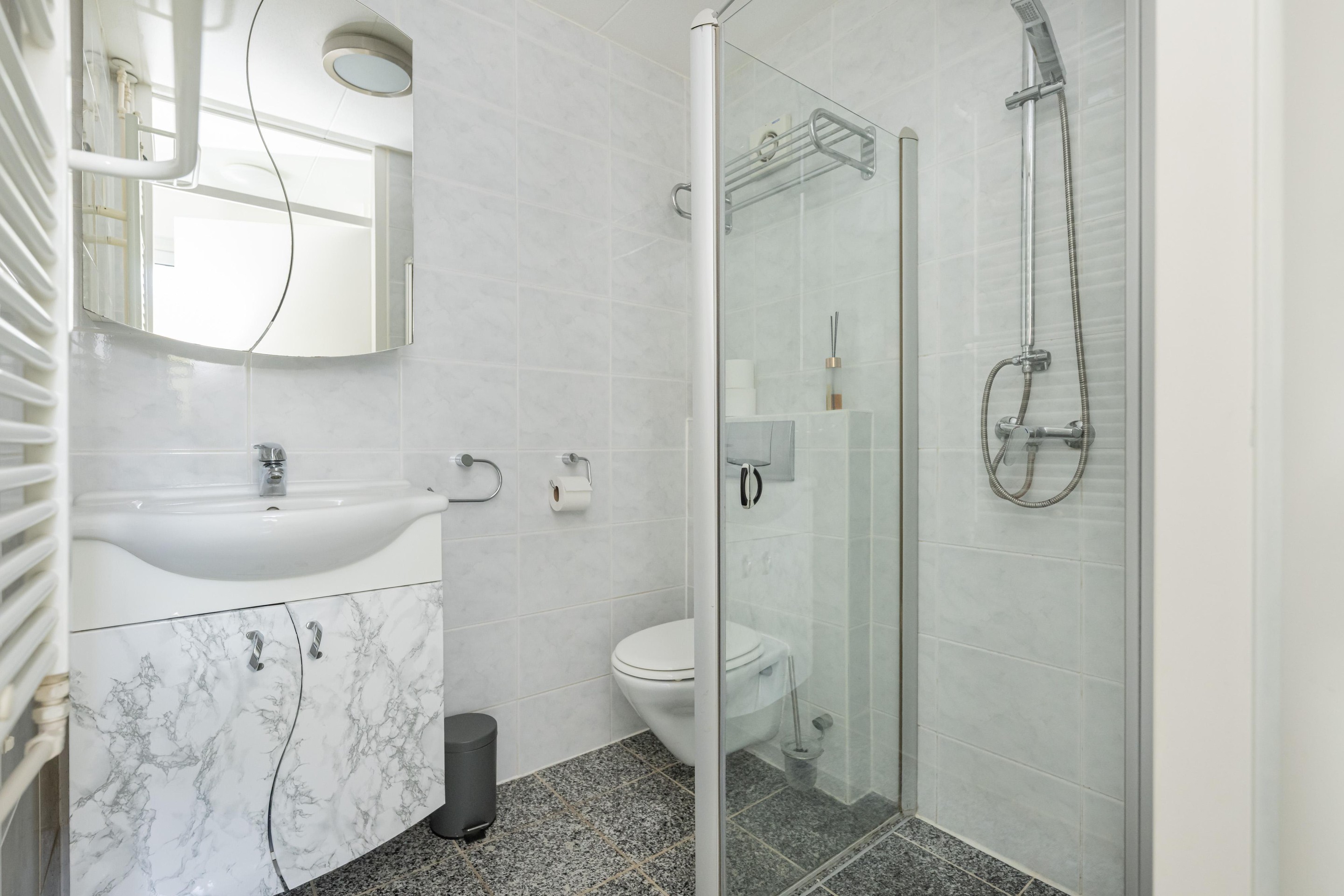 Inloopdouche, zwevend toilet, wastafel met meubel, radiator, spiegelkast en geheel betegeld.