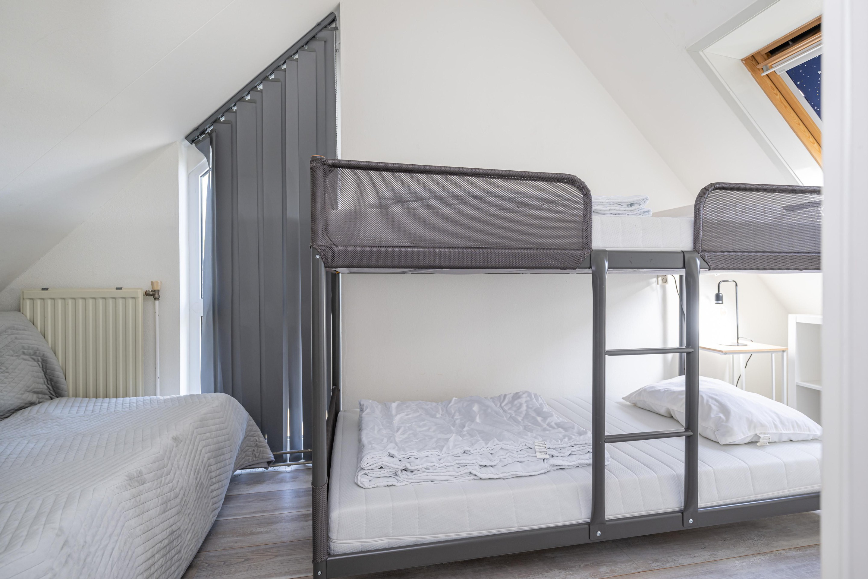Laminaatvloer, radiator, vaste kastenwand en Velux dakvenster.