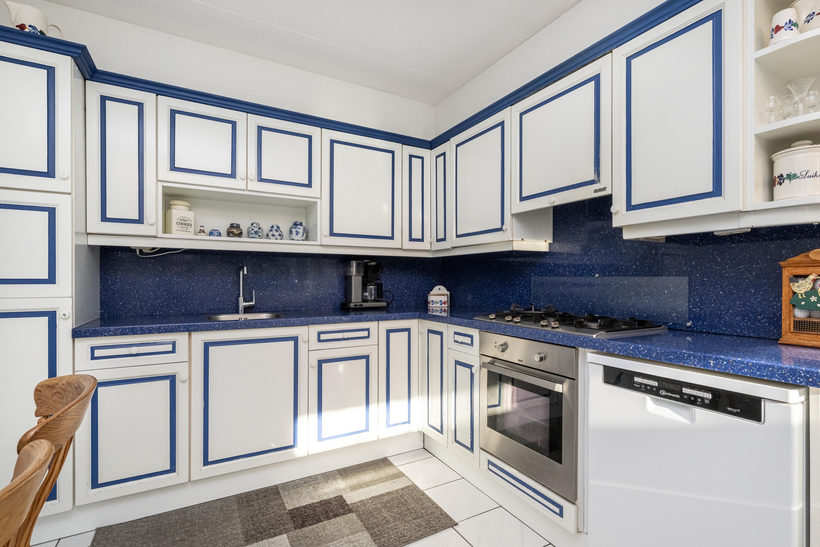 Plavuizenvloer v.v. vloerverwarming, enkele spoelbak, koelkast, vaatwasser, 5-pits gaskookplaat, afzuigkap, elektrische oven en een radiator.