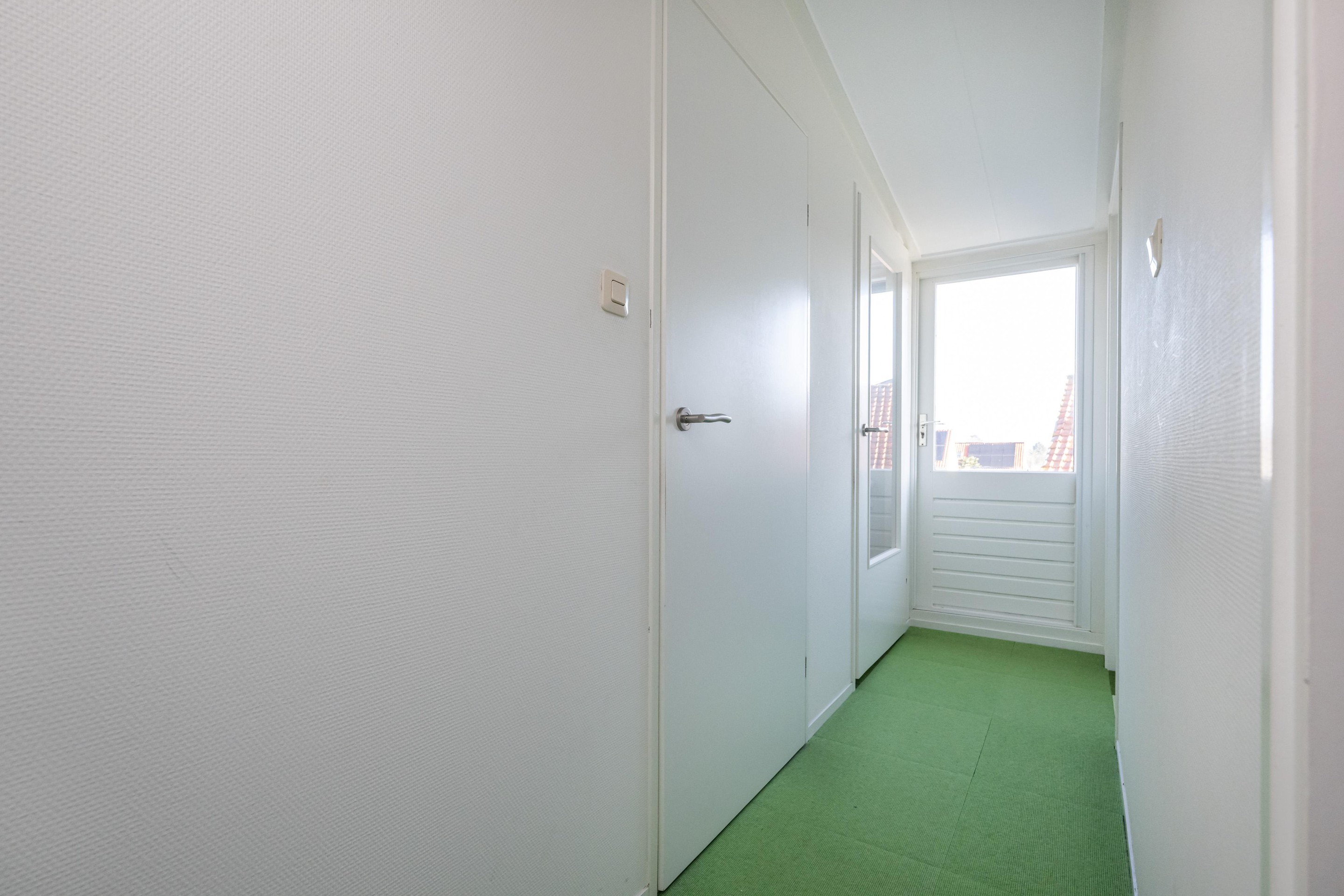 Tretford tapijt tegels en deur naar dak van de aanbouw.