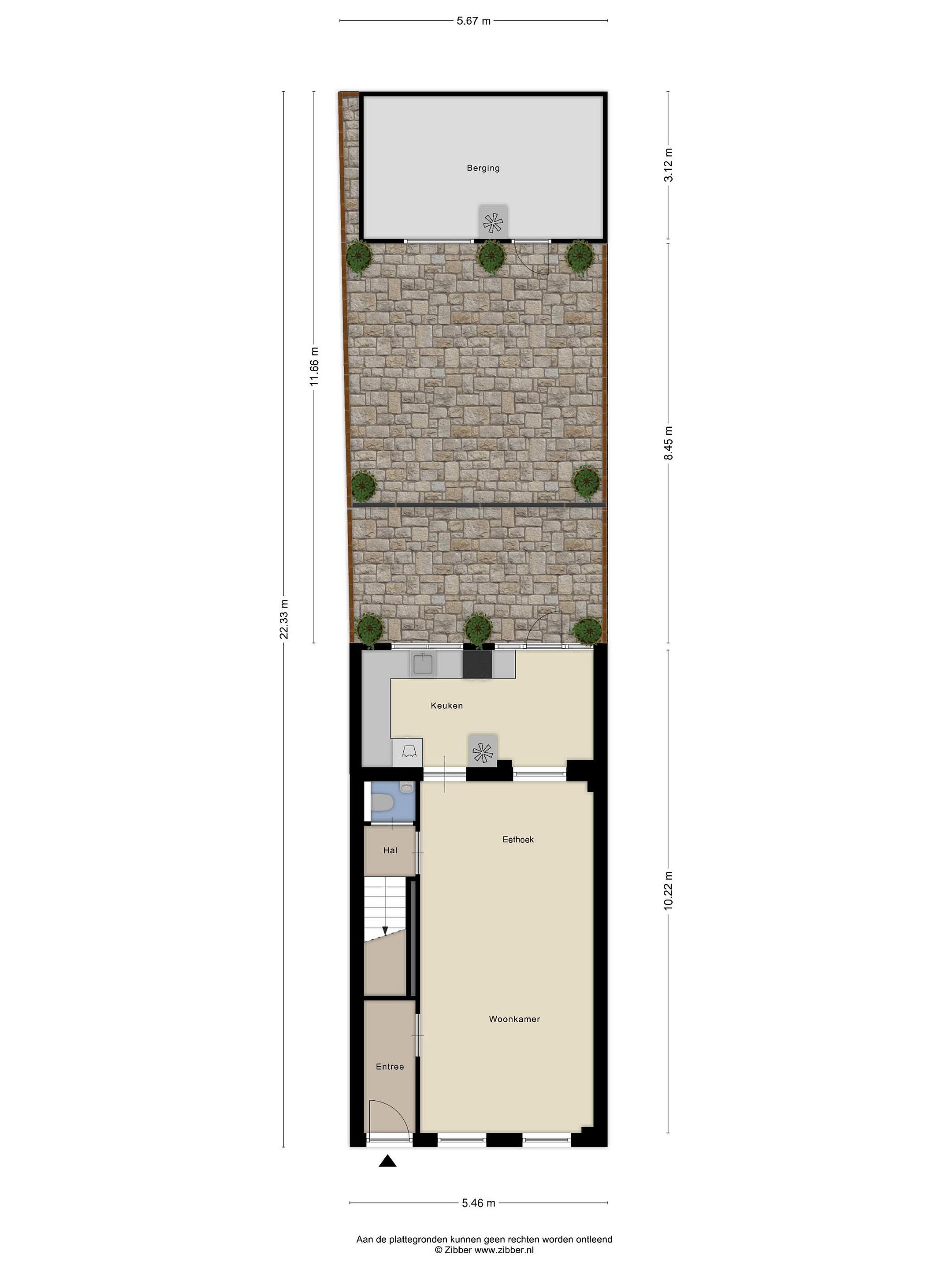 Begane grond: entree, hal, bergkast met garderobe, ruime woonkamer, hal, toilet met een fonteintje, keuken met diverse inbouwapparaten en een loopdeur naar de achtertuin (N/O) met vrijstaande stenen berging en achterom.