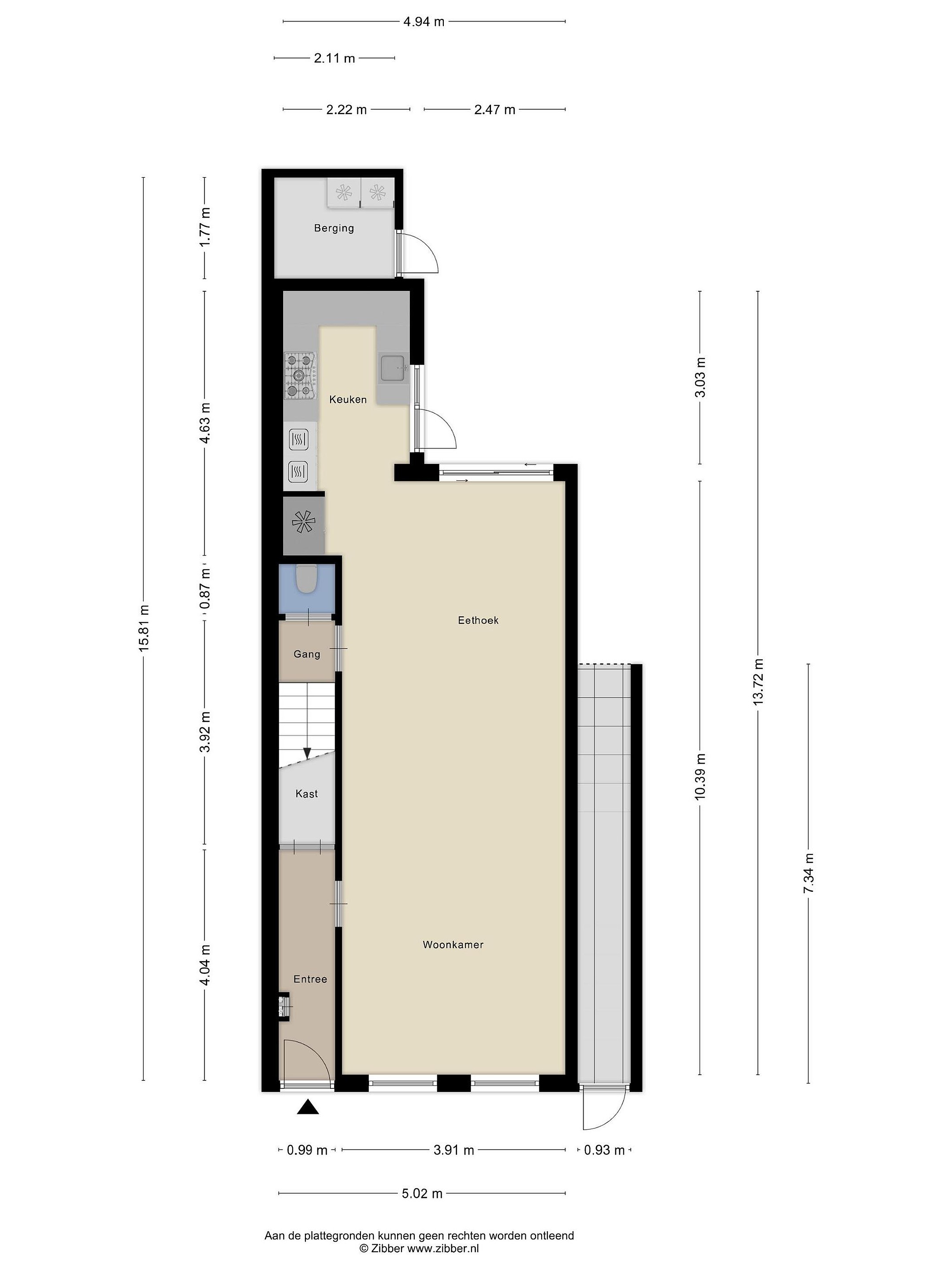 Begane grond: entree, hal met meterkast en trapkast, gang, toilet, ruime woonkamer, moderne keuken met diverse inbouwapparaten (o.a. stoomoven, vaatwasser etc.), en een loopdeur/schuifpui naar de achtertuin (N/W) met een berging en achterom via de eigen poort.